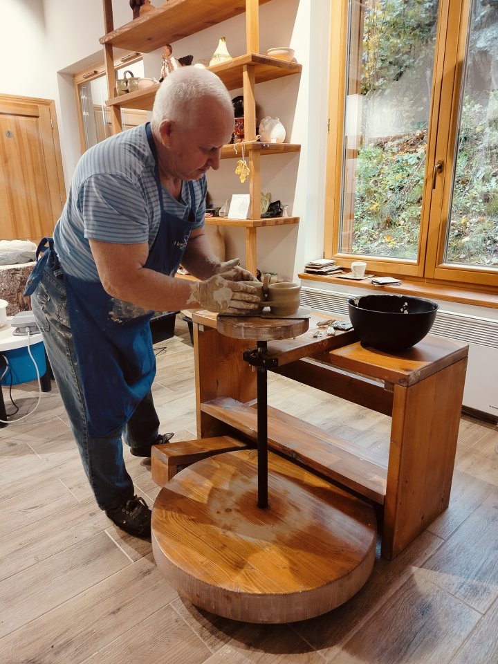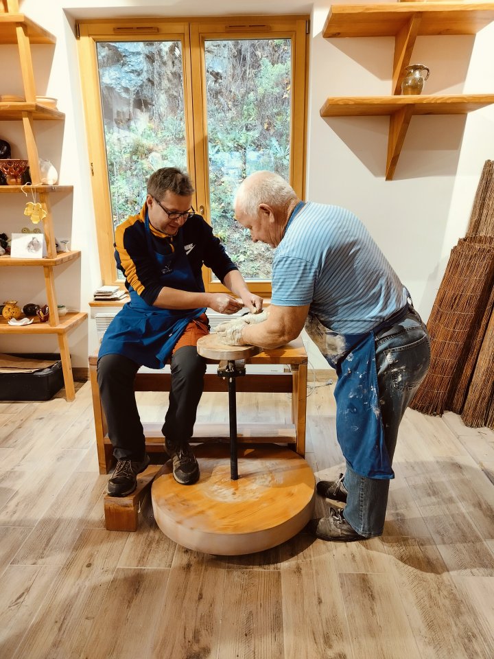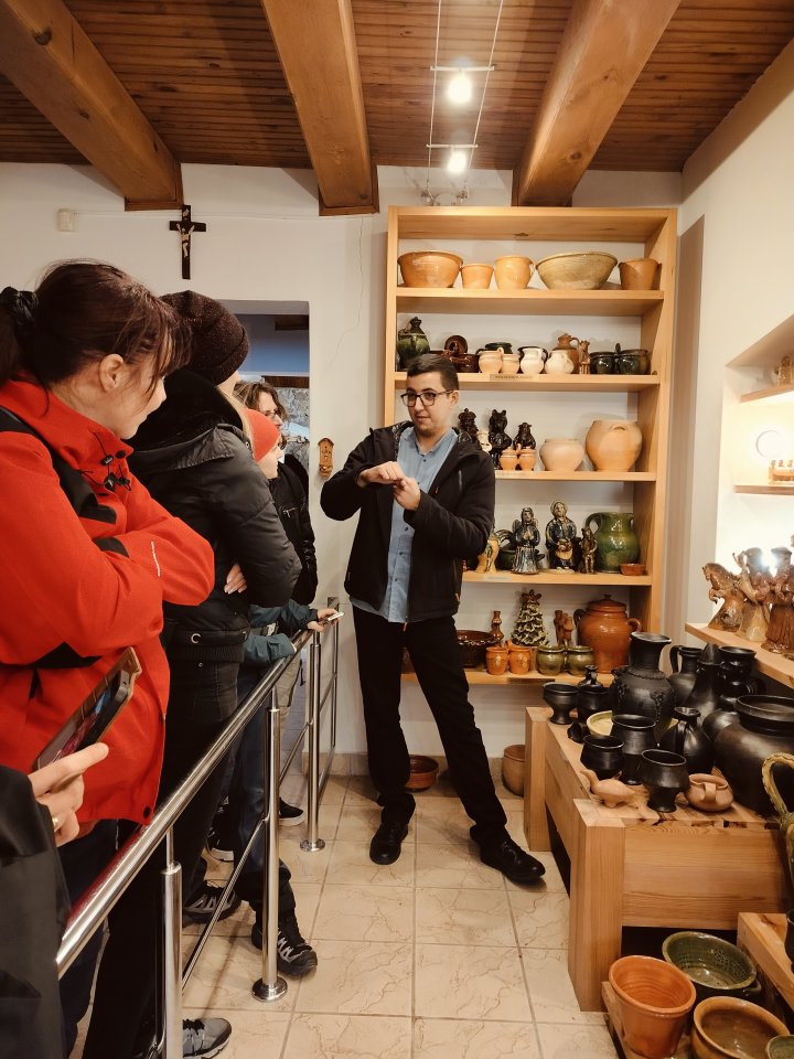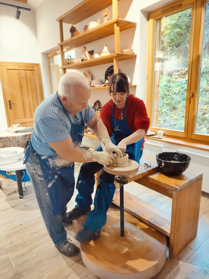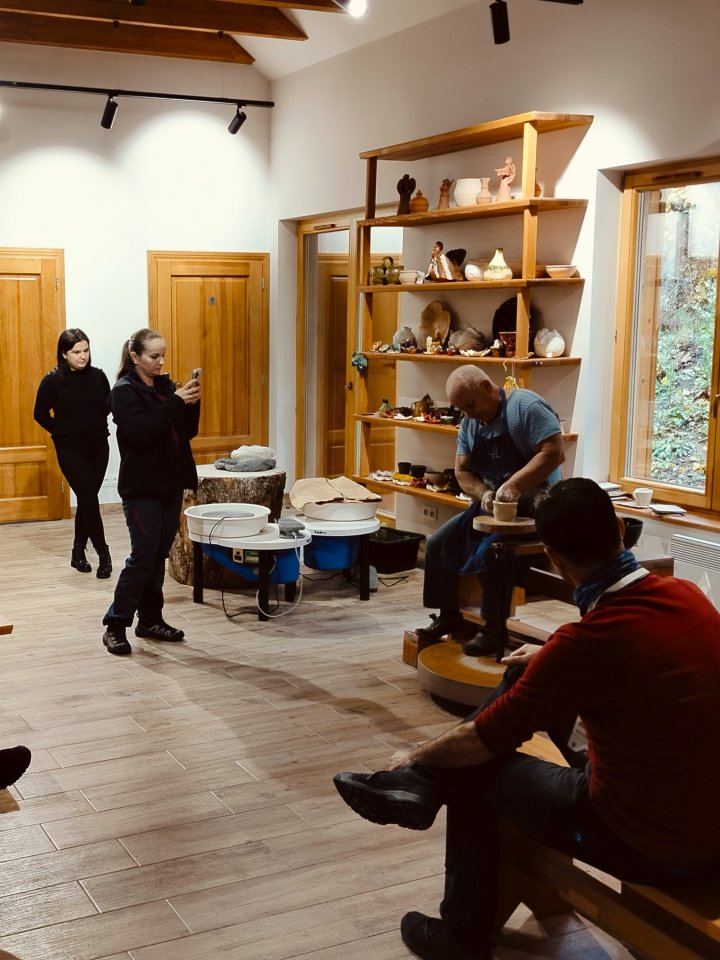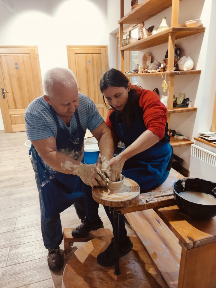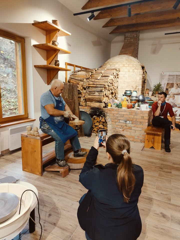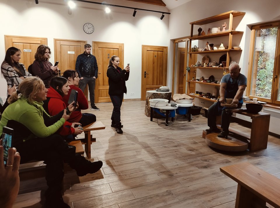 W Chacie Garncarza gości powitała Pani Teresa Badowska – Z-ca Dyrektora Samorządowego Centrum Kultury i Biblioteki w Morawicy. Na początek została wyświetlona prezentacja dot. powstania i działalności Ośrodka Tradycji Garncarstwa oraz film archiwalny z Muzeum Etnograficznego w Warszawie nagrany w latach 70-tych ubiegłego wieku w ówczesnych warsztatach garncarskich w Chałupkach. Po prezentacji i słodkim poczęstunku odbył się pokaz tradycyjnego toczenia na kole, a następnie pod okiem instruktora – Pana Mariana Kozłowskiego goście mogli spróbować swoich sił przy kole garncarskim. Następnie delegacja udała się do Muzeum Garncarstwa, gdzie Kustosz – Pan Michał Bochenek zaprezentował wnętrze autentycznego warsztatu garncarskiego oraz opowiedział o zgromadzonych eksponatach i tradycjach garncarskich regionu. Na pamiątkę wizyty w Chałupkach uczestnicy warsztatów otrzymali pamiątkowe magnesy wykonane własnoręcznie przez pracowników Centrum Kultury w Morawicy.