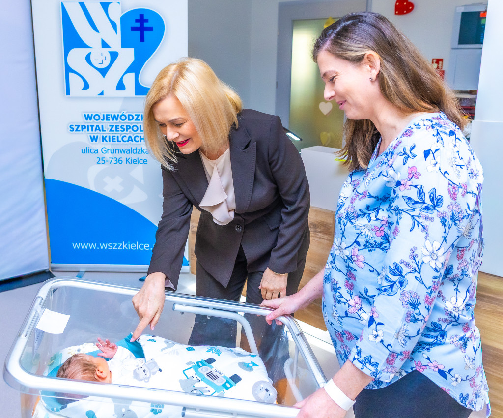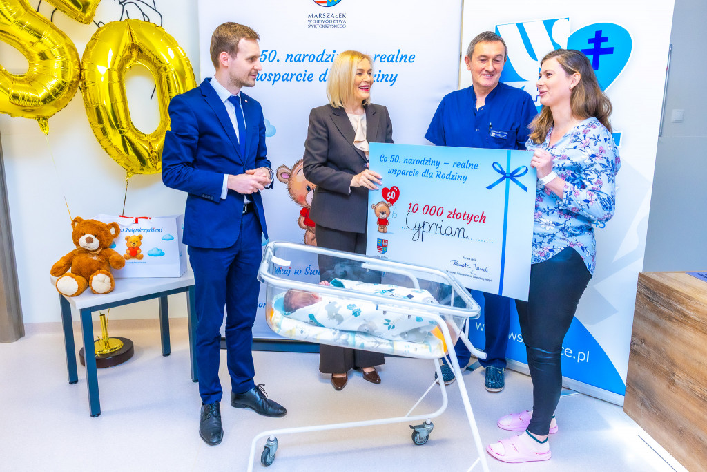 Atmosfera na bloku porodowym Wojewódzkiego Szpitala Zespolonego w Kielcach była dzisiaj wyjątkowa. Wszystko za sprawą małego Cypriana, który stał się bohaterem kolejnego etapu programu wsparcia dla młodych rodziców. Rodzice chłopca odebrali z rąk marszałek Renaty Janik symboliczny czek na 10 tys. zł. To bezzwrotna pomoc, która ma pomóc rodzinie w czekających na nich wyzwaniach po powrocie ze szpitala.