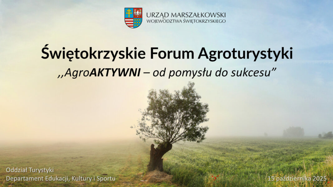 Już 15 października 2025 roku w malowniczej Świętokrzyskiej Zagrodzie Kultury ,,Harmonia” odbędzie się wyjątkowe wydarzenie poświęcone turystyce wiejskiej – Świętokrzyskie Forum Agroturystyki ,,AgroAKTYWNI – od pomysłu do sukcesu”. Spotkanie organizowane jest przez Oddział Turystyki Departamentu Edukacji, Kultury i Sportu. Jego celem jest wymiana doświadczeń, inspiracji i dobrych praktyk pomiędzy osobami i instytucjami zaangażowanymi w rozwój turystyki wiejskiej w regionie.