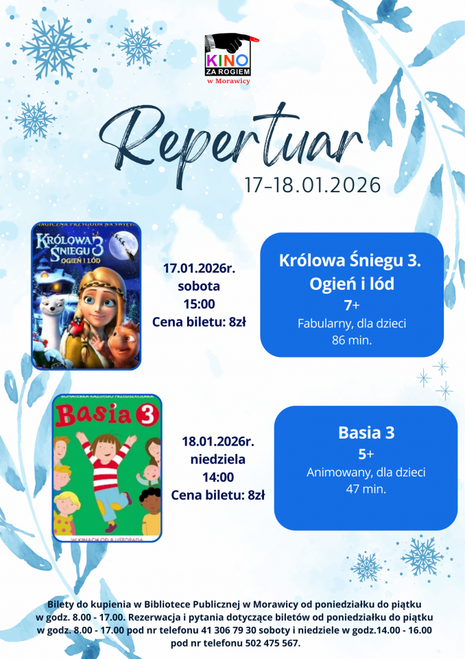 Strona głównaAktualnościAktualny repertuar ˝Kina za Rogiem˝ w Morawicy Aktualności Aktualny repertuar ˝Kina za Rogiem˝ w Morawicy CKinfo.pl 14 stycznia 2026 FacebookTwitterWhatsAppTelegram Repertuar 'Kina za Rogiem' w Morawicy na 17-18 stycznia 2026: 'Królowa Śniegu 3' i 'Basia 3'. Zobacz CKinfo.pl - 12 stycznia 2026Policyjne maskotki przekazane na licytacje WOŚP CKinfo.pl - 9 stycznia 2026XXIV sesja Sejmiku Województwa Świętokrzyskiego CKinfo.pl - 14 stycznia 2026˝Kolędowy Flow˝ – muzyczne święto tradycji w Gminie Morawica CKinfo.pl - 12 stycznia 2026Wkład w poczucie bezpieczeństwa – prewencyjne podsumowanie roku CKinfo.pl - 9 stycznia 2026System RESQL w szkołach gminy Daleszyce CKinfo.pl - 12 stycznia 2026Najbliższe 2,5 roku spędzi w areszcie CKinfo.pl - 9 stycznia 2026Sprawdź autokar przed wyjazdem na ferie! Poniżej prezentujemy repertuar „Kina za Rogiem” w Morawicy na nadchodzący weekend 17-18.01.2026 r. GminaGmina MorawicaŹRÓDŁOMiasto i Gmina Morawica Udział FacebookTwitterWhatsAppTelegram Poprzedni artykuł˝Kolędowy Flow˝ – muzyczne święto tradycji w Gminie MorawicaNastępny artykułUratowali wychłodzonego pieska Aktualności AktualnościCKinfo.pl - 14 stycznia 2026Uratowali wychłodzonego pieskaPolicjanci z Wydziału Ruchu Drogowego Komendy Powiatowej Policji w Staszowie podczas niedzielnej służby napotkali na jezdni psa, który był... Aktualności ˝Kolędowy Flow˝ – muzyczne święto tradycji w Gminie Morawica CKinfo.pl - 14 stycznia 2026 Aktualności III Rajd Karnawałowy w Morawicy CKinfo.pl - 14 stycznia 2026 Aktualności Podaruj przedmiot na licytację WOŚP! CKinfo.pl - 14 stycznia 2026 Aktualności Uwaga na drogach i chodnikach CKinfo.pl - 14 stycznia 2026 Polecamy Uratowali wychłodzonego pieska Aktualności CKinfo.pl - 14 stycznia 2026 III Rajd Karnawałowy w Morawicy Aktualności CKinfo.pl - 14 stycznia 2026 ˝Kolędowy Flow˝ – muzyczne święto tradycji w Gminie Morawica Aktualności CKinfo.pl - 14 stycznia 2026 Uwaga na drogach i chodnikach Aktualności CKinfo.pl - 14 stycznia 2026