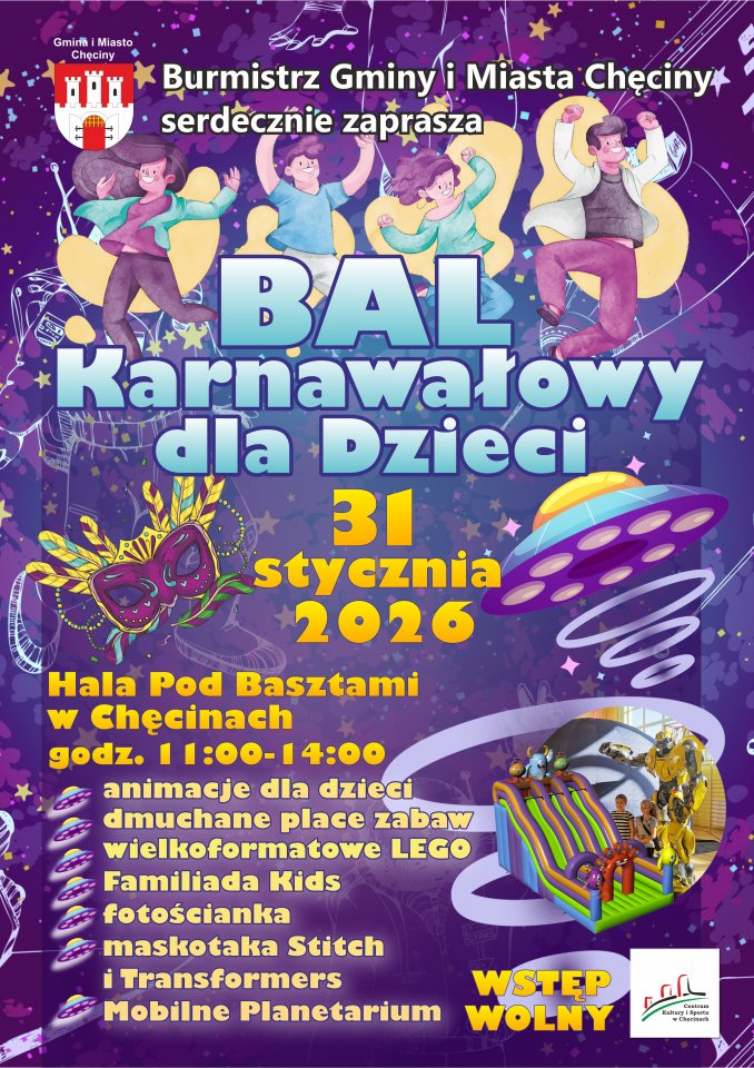 Burmistrz Gminy i Miasta Chęciny serdecznie zaprasza na Bal Karnawałowy dla Dzieci, który odbędzie się 31 stycznia w godz. 11:00-14:00 w hali „Pod Basztami” w Chęcinach. W programie moc atrakcji! Wstęp wolny.