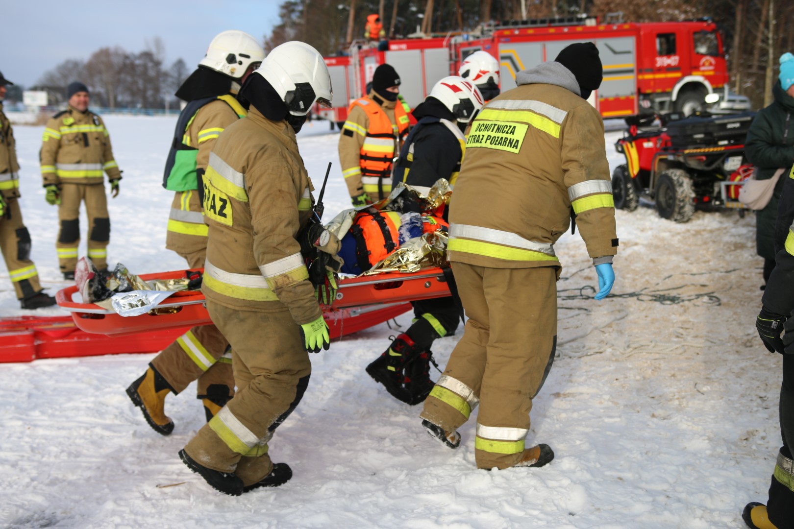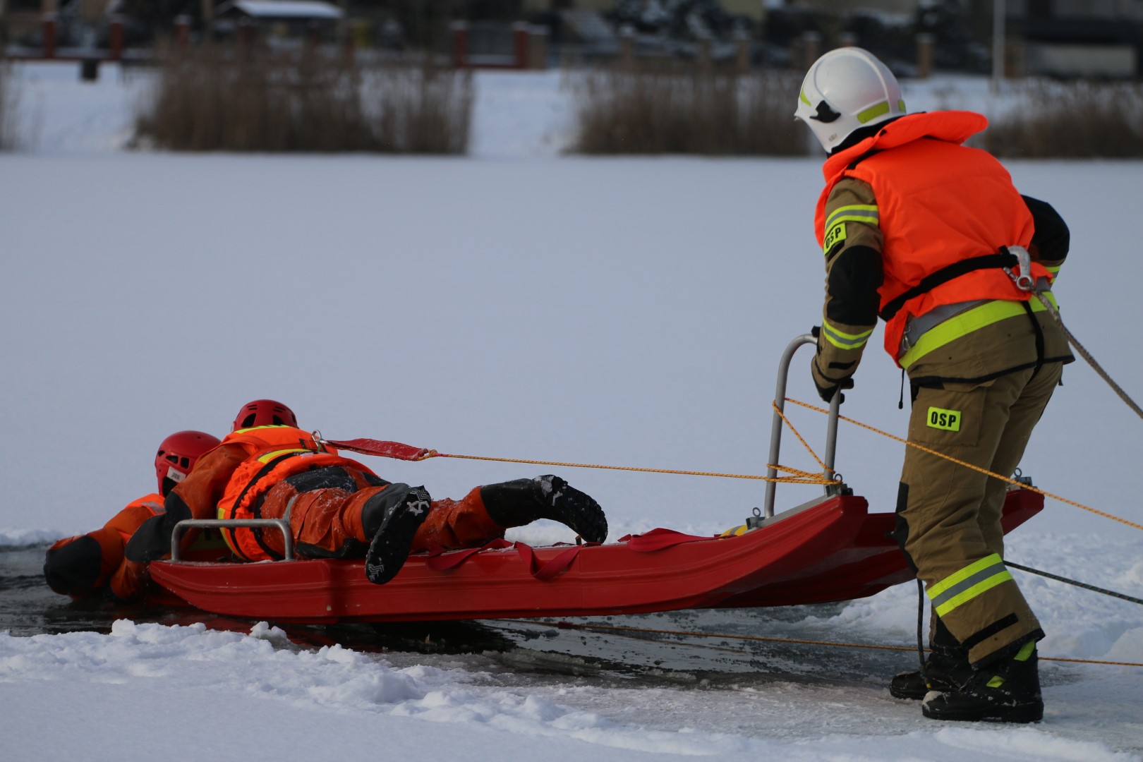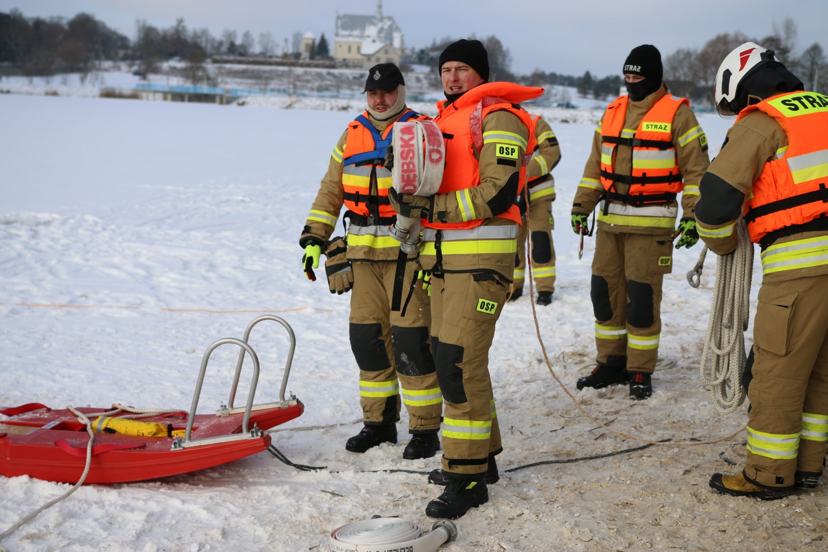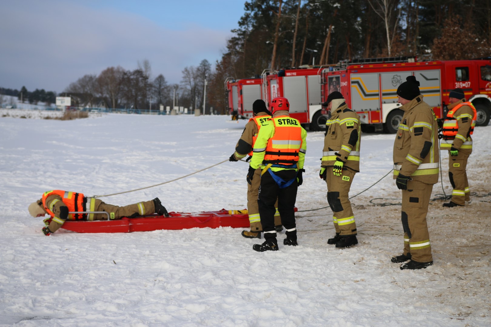 Strażacy prowadzili działania ratownicze z wykorzystaniem różnych technik i sprzętu, m.in. sanek, drabiny oraz węża strażackiego. Ćwiczenia miały na celu nie tylko podniesienie poziomu wyszkolenia, ale również rozwijanie współpracy pomiędzy jednostkami w trudnych, zimowych warunkach.