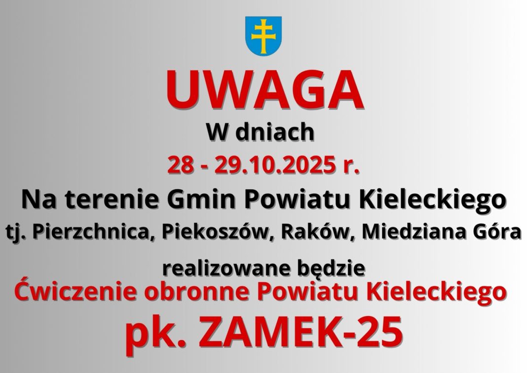 Uprzejmie informujemy, że w dniach 28 – 29 października 2025 r. na terenie Gmin Powiatu Kieleckiego tj. Pierzchnica, Piekoszów, Raków oraz Miedziana Góra realizowane będzie ćwiczenie obronne Powiatu Kieleckiego pk. ZAMEK-25.