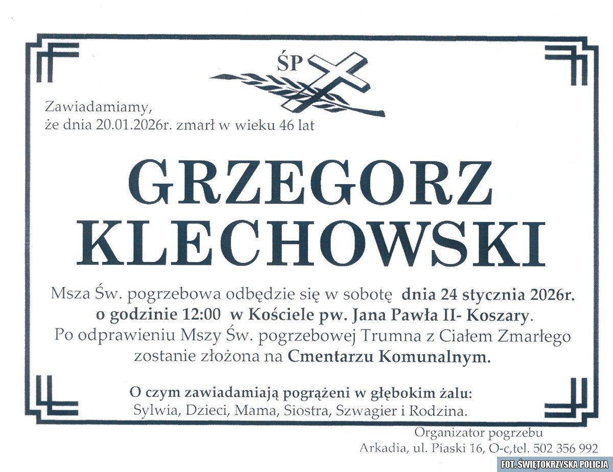 Z głębokim żalem zawiadamiamy, że 20 stycznia 2026 roku, nagle w wieku 46 lat, zmarł nasz Kolega asp. sztab. Grzegorz Klechowski – policjant Wydziału Prewencji Komendy Powiatowej Policji w Ostrowcu Świętokrzyskim.