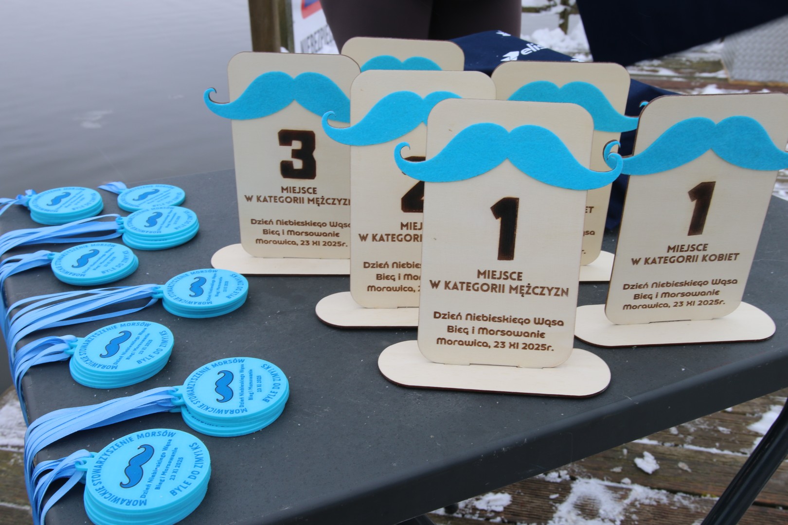 Każdy uczestnik biegu otrzymał charakterystyczne niebieskie wąsy, a także pamiątkowy medal. Najlepsi biegacze uhonorowani zostali statuetkami, które wręczyli przedstawiciel Morawickiego Stowarzyszenia Morsów „Byle do Zimy!” – Marcin Łazarczyk, oraz Kierownik Referatu Kultury, Sportu i Promocji Monika Malicka.