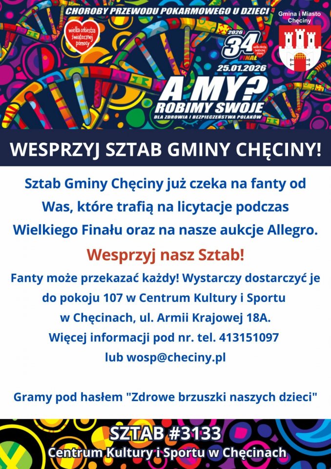 Wielki Finał WOŚP coraz bliżej, a Sztab #3133 – Gmina Chęciny już rozpoczyna zbiórkę fantów na licytacje! Masz coś wyjątkowego, ciekawego lub po prostu fajnego? Twoje fanty mogą pomóc ratować zdrowie i życie! Część z nich trafi na nasze licytacje online na Allegro, gdzie wystąpimy jako Gmina Chęciny. Gramy razem już 25 stycznia 2026 r.!