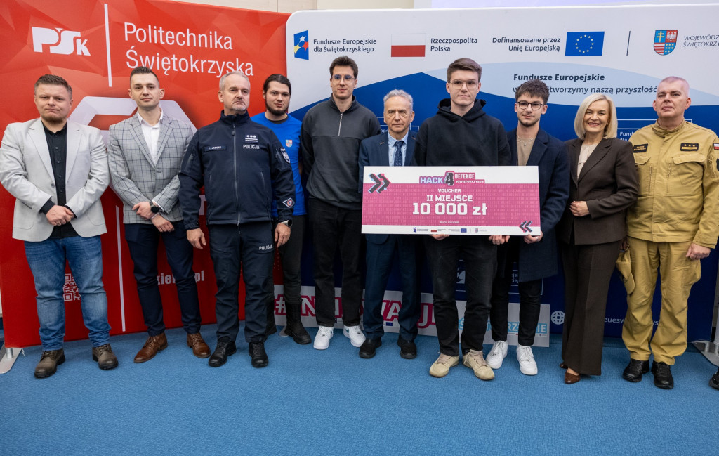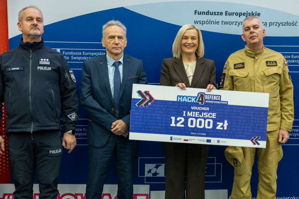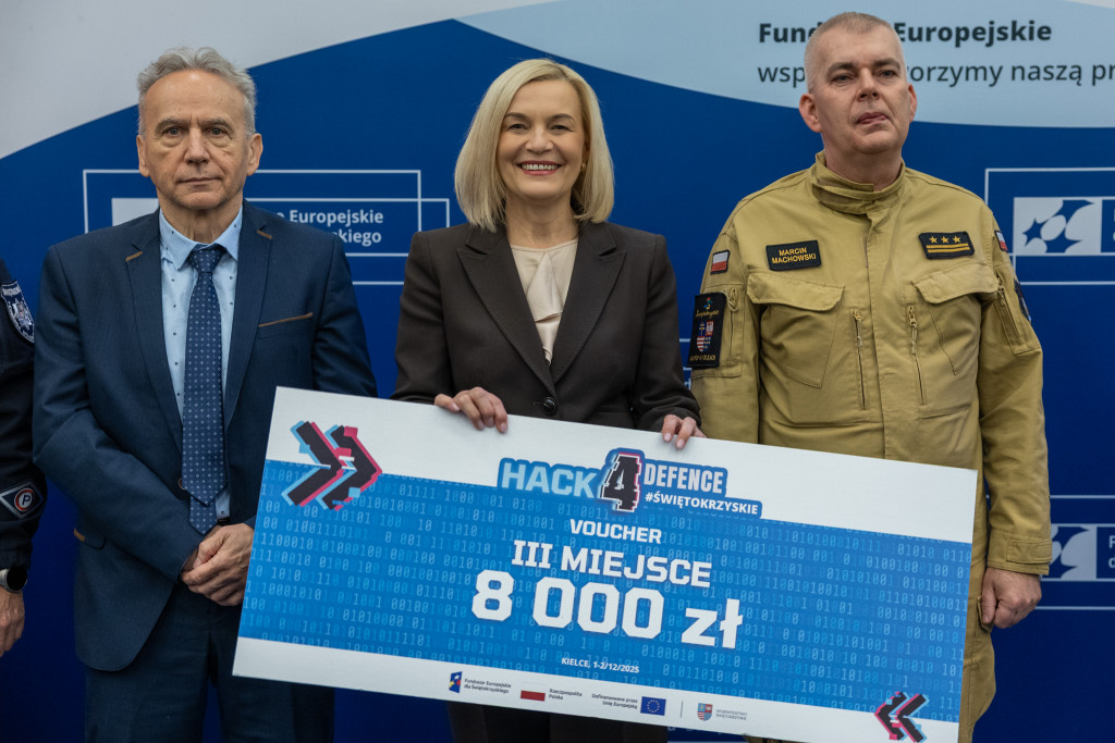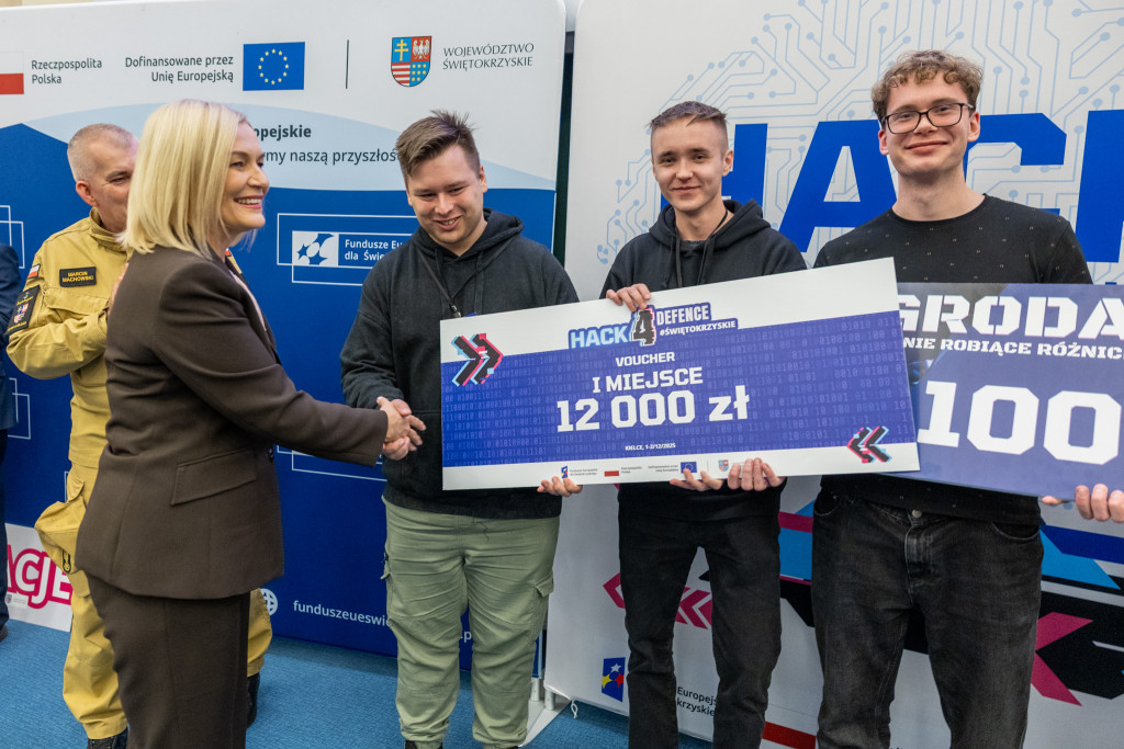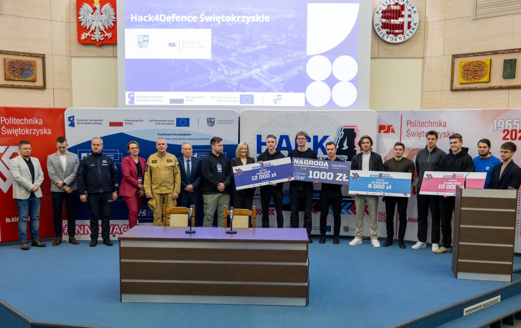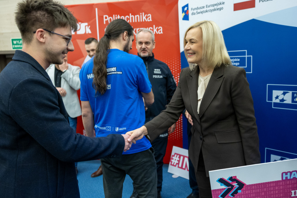 Po całonocnym maratonie programowania, drużyny zakończyły prace, a jury ogłosiło laureatów pierwszej edycji „Hack4Defence Świętokrzyskie”. Dziesięć zespołów złożonych ze studentów rywalizowało na Politechnice Świętokrzyskiej, tworząc innowacyjne aplikacje reagujące na kluczowe scenariusze zagrożeń – od pożaru i powodzi, po ataki hakerskie i incydenty z drona. Najlepsze drużyny odebrały zasłużone nagrody, które wręczyła marszałek Renata Janik. Organizowany przez Urząd Marszałkowski – we współpracy z kluczowymi służbami (Policja, PSP, CBZC) oraz partnerami technologicznymi – konkurs udowodnił, że świętokrzyskie ma potencjał w zakresie nowych technologii, które przyczynią się do zwiększenia bezpieczeństwa regionu. W wydarzeniu wzięli udział także zastępca dyrektora Departamentu Rozwoju Regionalnego Joanna Rudawska, rektor Politechniki Świętokrzyskiej prof. Zbigniew Koruba oraz przedstawiciele służb mundurowych: Komendy Wojewódzki Policji w Kielcach oraz Komendy Wojewódzkiej Państwowej Straży Pożarnej w Kielcach.