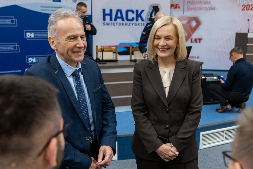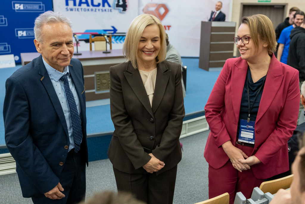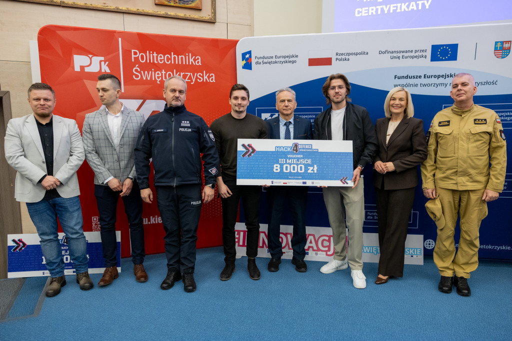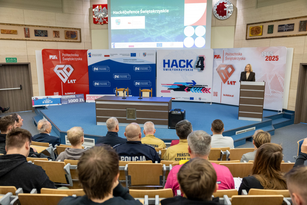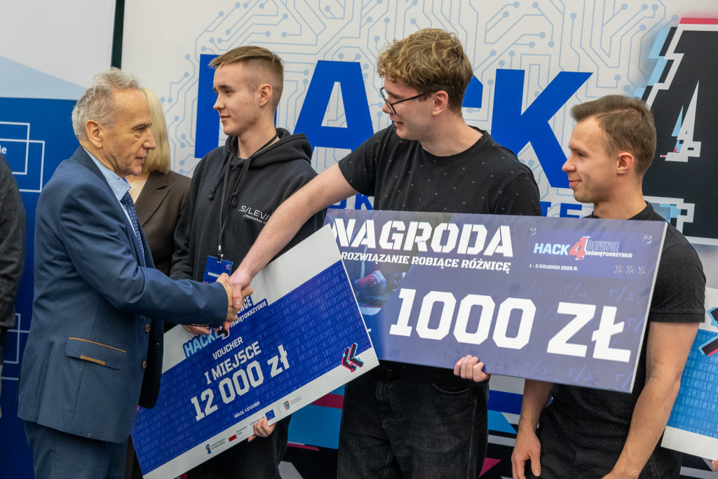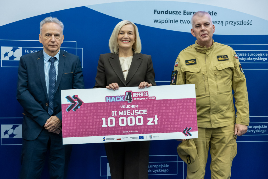 Po całonocnym maratonie programowania, drużyny zakończyły prace, a jury ogłosiło laureatów pierwszej edycji „Hack4Defence Świętokrzyskie”. Dziesięć zespołów złożonych ze studentów rywalizowało na Politechnice Świętokrzyskiej, tworząc innowacyjne aplikacje reagujące na kluczowe scenariusze zagrożeń – od pożaru i powodzi, po ataki hakerskie i incydenty z drona. Najlepsze drużyny odebrały zasłużone nagrody, które wręczyła marszałek Renata Janik. Organizowany przez Urząd Marszałkowski – we współpracy z kluczowymi służbami (Policja, PSP, CBZC) oraz partnerami technologicznymi – konkurs udowodnił, że świętokrzyskie ma potencjał w zakresie nowych technologii, które przyczynią się do zwiększenia bezpieczeństwa regionu. W wydarzeniu wzięli udział także zastępca dyrektora Departamentu Rozwoju Regionalnego Joanna Rudawska, rektor Politechniki Świętokrzyskiej prof. Zbigniew Koruba oraz przedstawiciele służb mundurowych: Komendy Wojewódzki Policji w Kielcach oraz Komendy Wojewódzkiej Państwowej Straży Pożarnej w Kielcach.