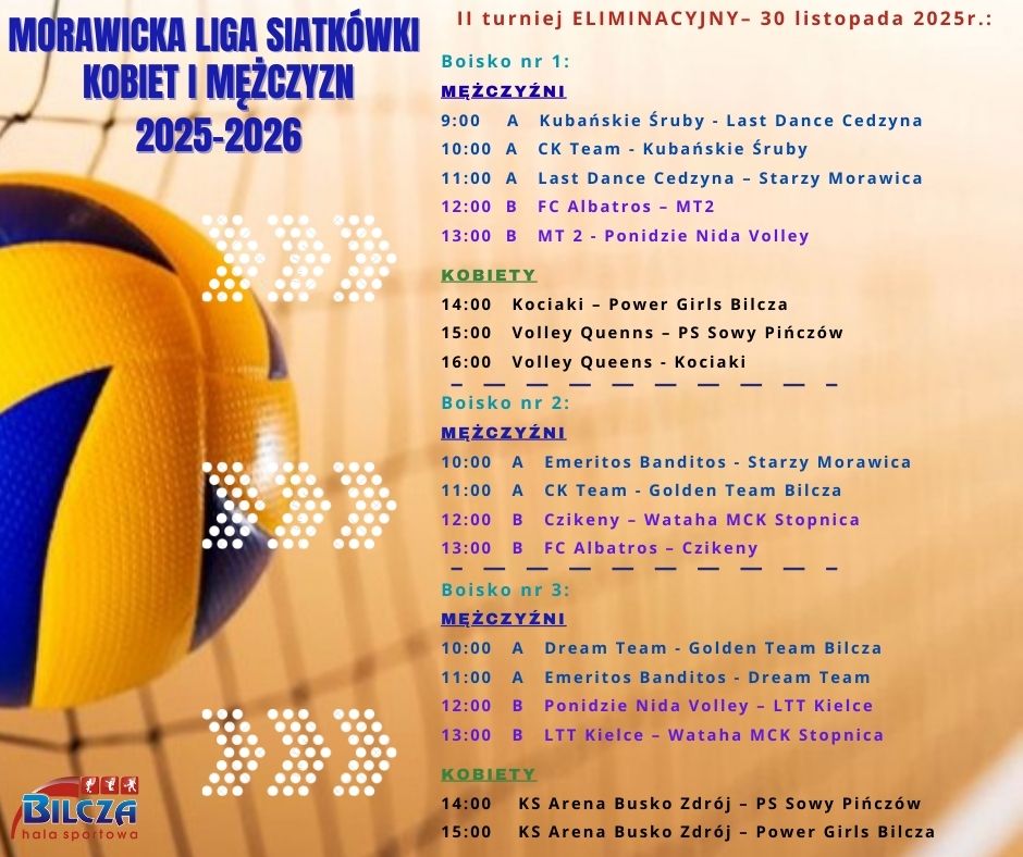 Po raz drugi w tym sezonie Morawickiej Ligi Siatkówki Kobiet i Mężczyzn spotkają się uczestnicy rozgrywek. Podczas turnieju w ostatnią niedziele listopada zostanie rozegranych 18 spotkań i będzie to półmetek rozgrywek organizowanych przez Zakład Gospodarki Komunalnej i Rekreacji. Początek rywalizacji w Hali Sportowej Bilcza o godzinie 9:00. Szczegóły poniżej.
