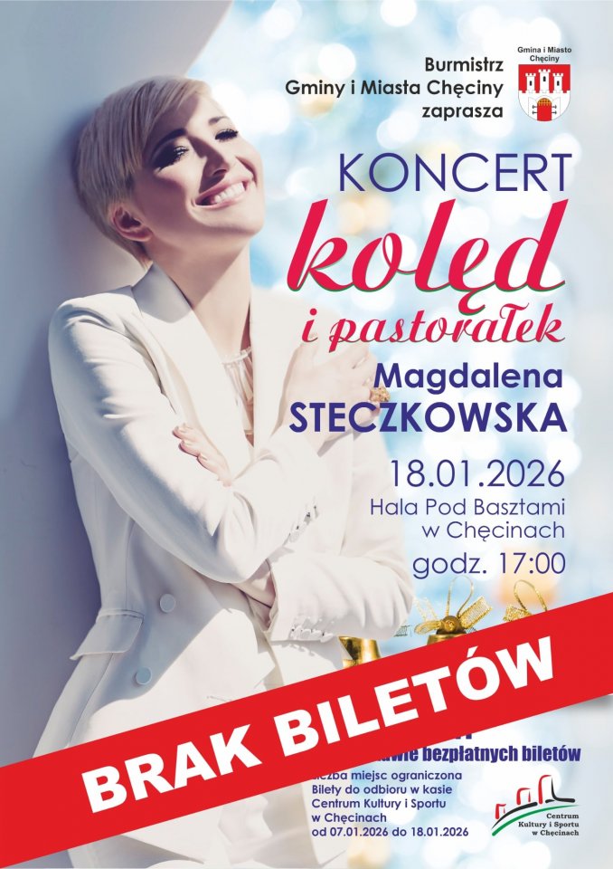 Informujemy, że wszystkie bezpłatne bilety na koncert kolęd i pastorałek w wykonaniu Magdaleny Steczkowskiej, który odbędzie się 18 stycznia 2026 r. o godz. 17:00 w hali „Pod Basztami” w Chęcinach, zostały już wyczerpane.