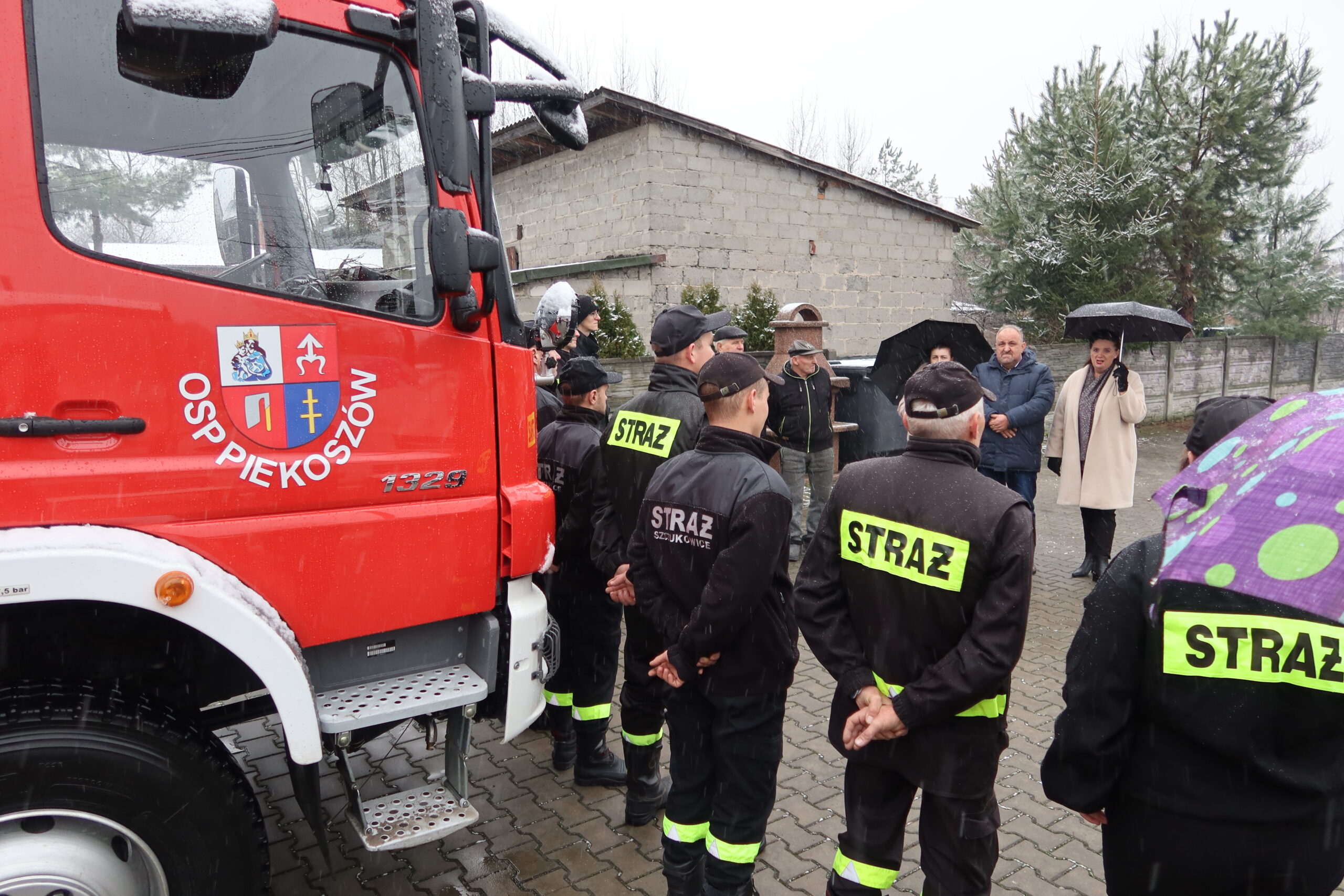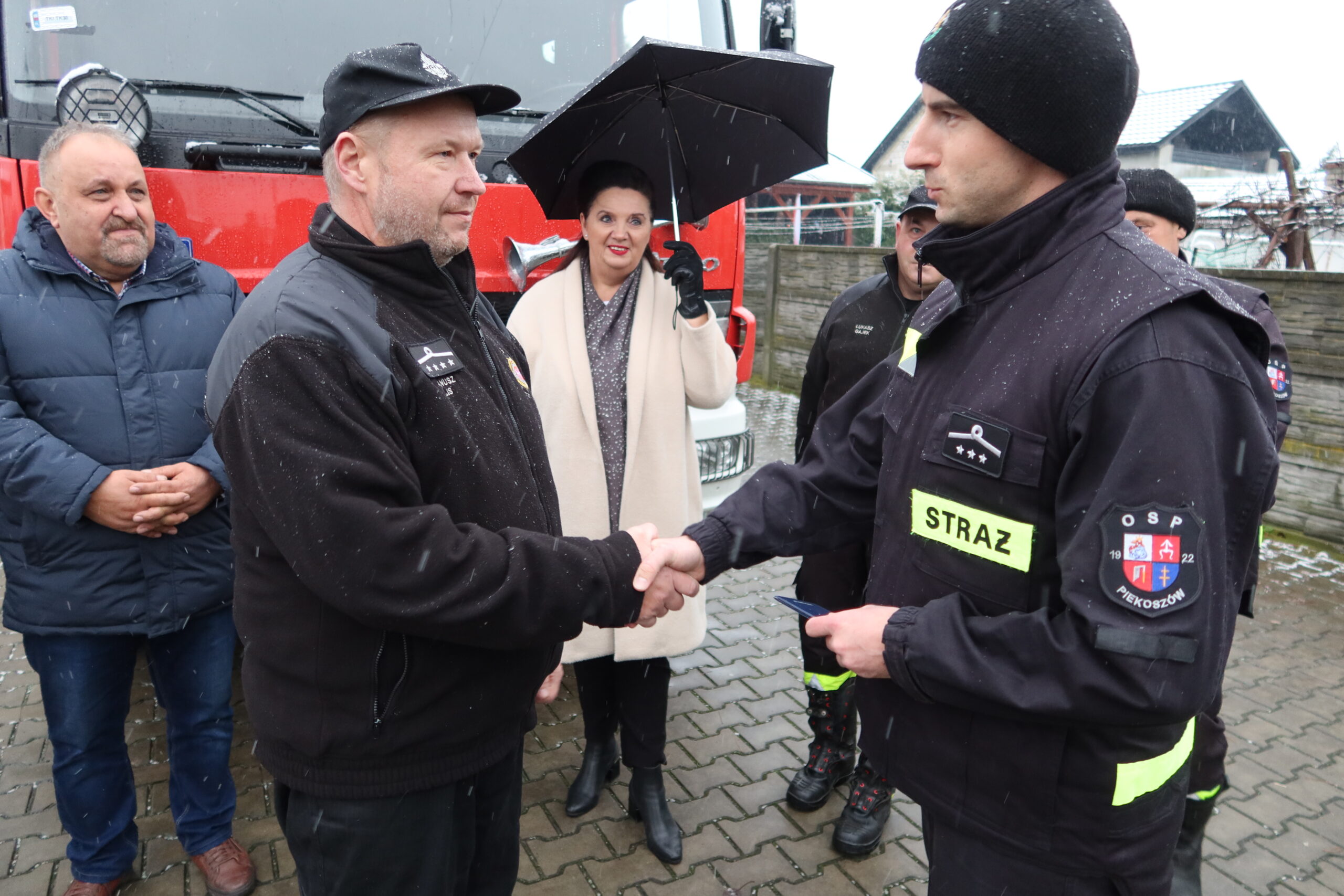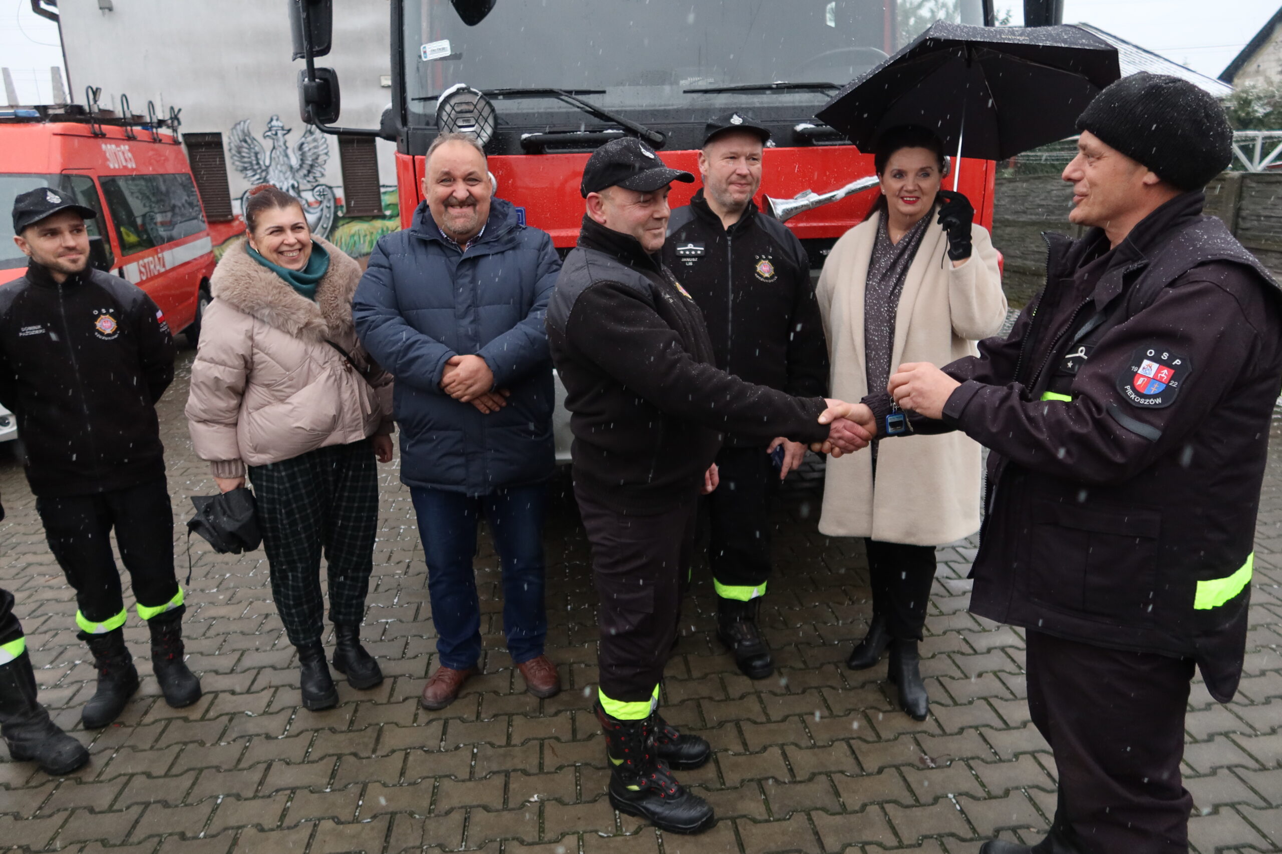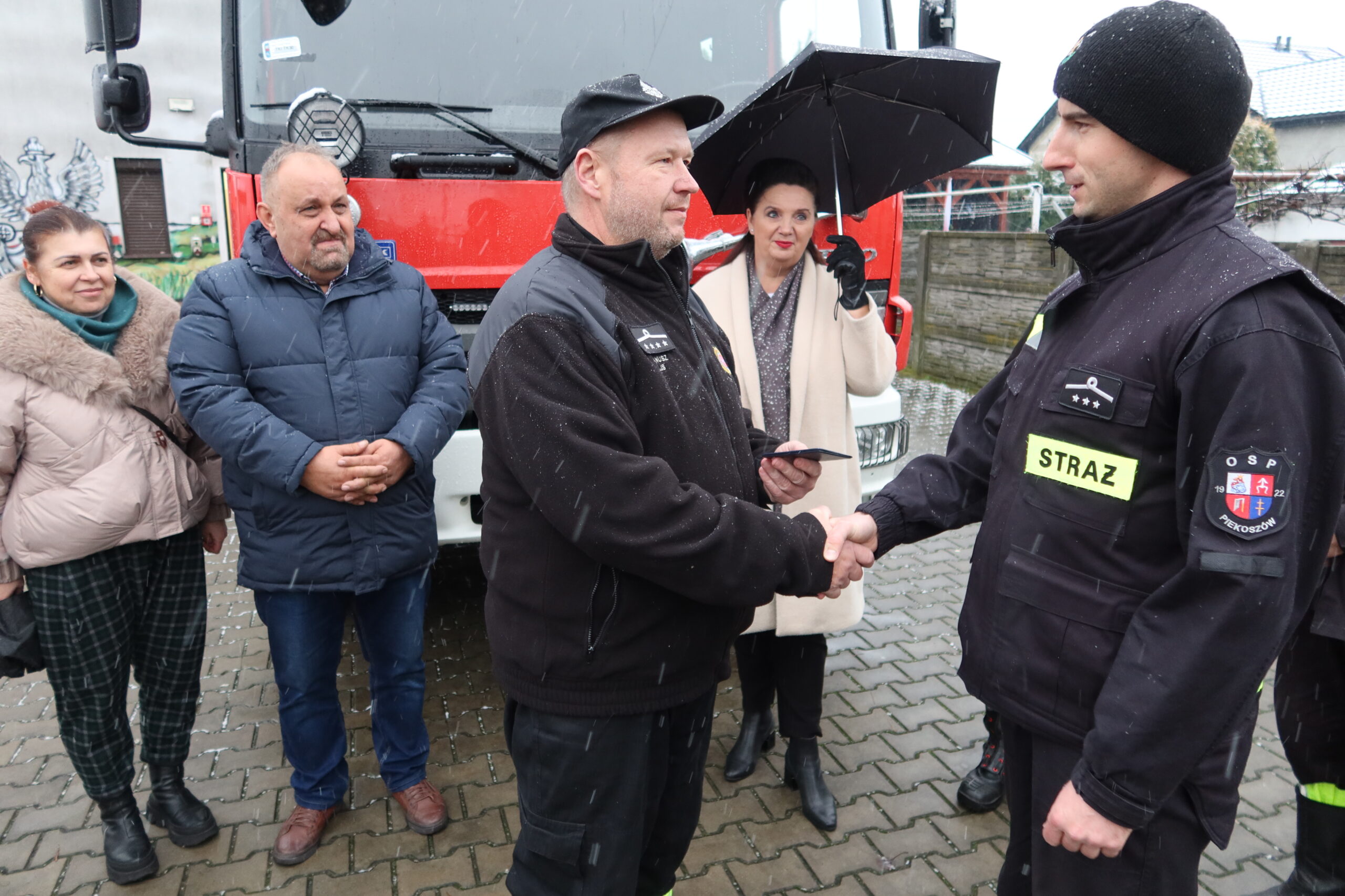 Podczas oficjalnego przekazania naczelnik OSP Piekoszów Piotr Sorbian wręczył dowód rejestracyjny prezesowi OSP Szczukowice Januszowi Lisowi, natomiast kluczyki do pojazdu przekazał zastępca naczelnika OSP Piekoszów Tomasz Smolarczyk na ręce naczelnika OSP Szczukowice Łukasza Gajka.
