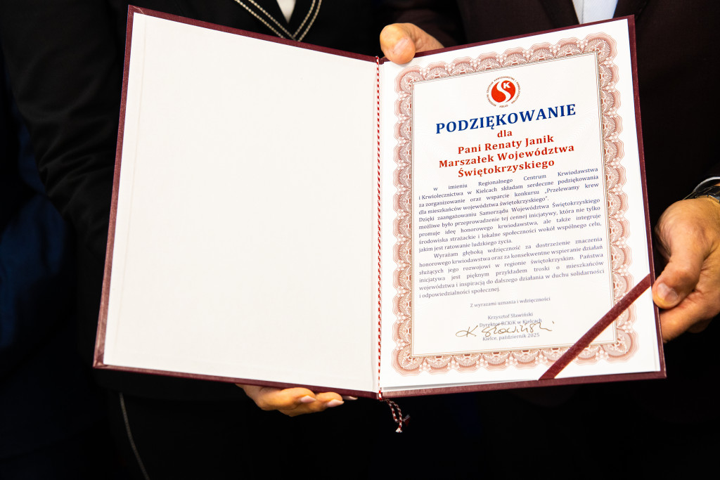 Dyrektor Regionalnego Centrum Krwiodawstwa i Krwiolecznictwa Krzysztof Sławiński wręczył marszałek Renacie Janik specjalne podziękowania za inicjatywę i wsparcie w organizacji konkursu. Podkreślono w nim, że akcja “Przelewamy krew dla mieszkańców WS” ma kluczowe znaczenie dla zabezpieczenia zapasów krwi w regionie i nie byłaby możliwa bez aktywnego zaangażowania władz samorządowych.