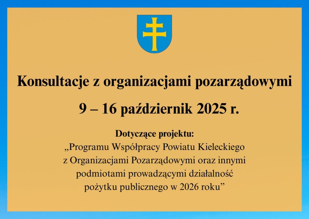 Zarząd Powiatu w Kielcach ogłasza konsultacje z organizacjami pozarządowymi. Przedmiotem konsultacji jest projekt „Programu Współpracy Powiatu Kieleckiego z Organizacjami Pozarządowymi oraz innymi podmiotami prowadzącymi działalność pożytku publicznego w 2026 roku”.