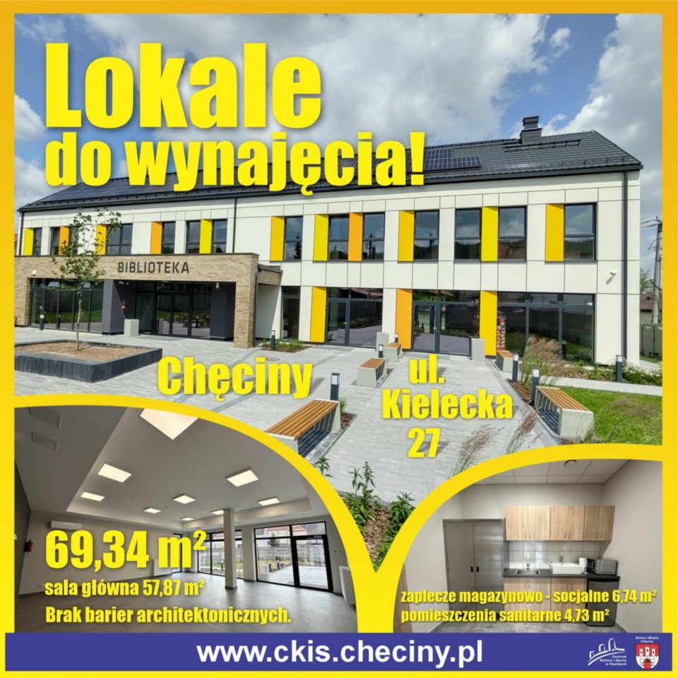 1. Dyrektor Centrum Kultury i Sportu w Chęcinach ogłasza zamiar zawarcia umowy najmu na dwa lokale użytkowe o powierzchni 69,34 m2 każdy, znajdujące się w budynku pod adresem Chęciny 26-060; ul. Kielecka 27 (budynek pomiędzy ulicami tj. ul. Kielecką i Aleją Marszałka Józefa Piłsudskiego w Chęcinach).