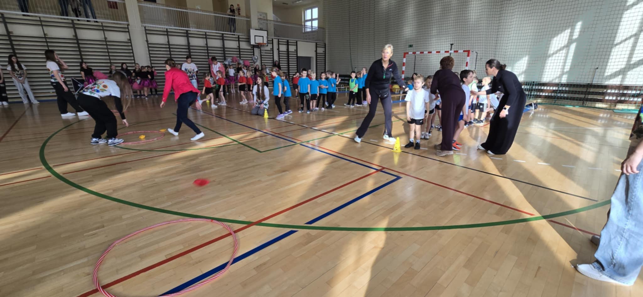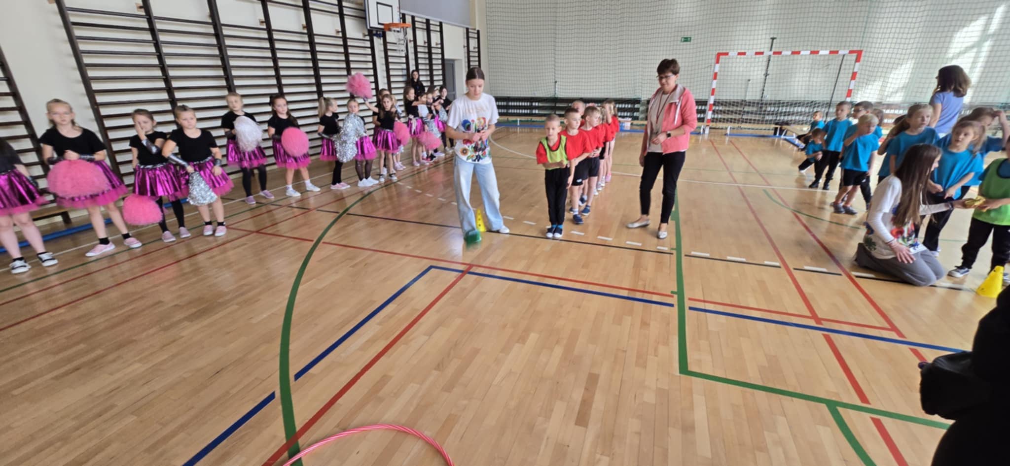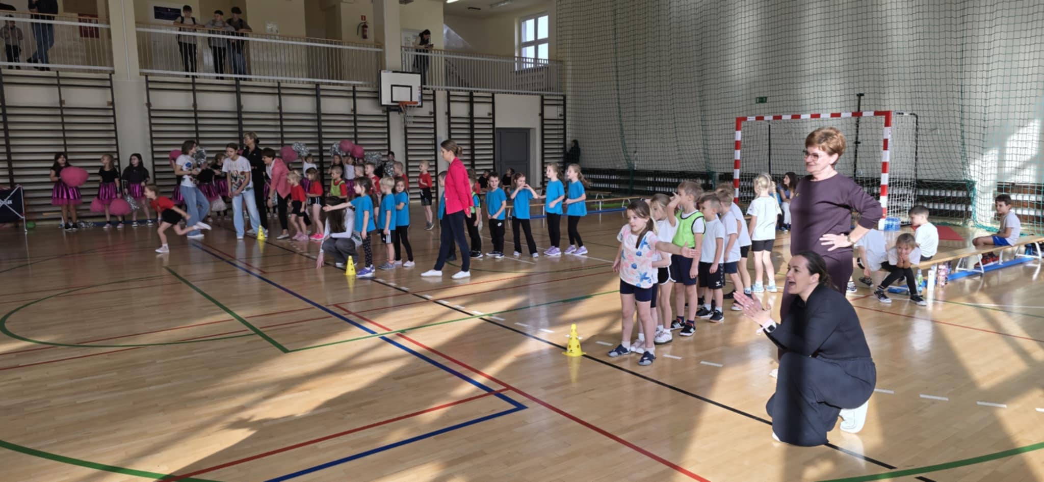Od samego rana w szkole panowała wyjątkowa atmosfera. Z korytarzy rozbrzmiewały okrzyki dopingu, a najmłodsi sportowcy z zapałem przystępowali do kolejnych konkurencji. Dzieci rywalizowały w biegu z przenoszeniem piłek, biegu z przekładaniem szarfy, skoku w dal z miejsca oraz w rzutach woreczkami do celu. Towarzyszyły im ogromne emocje, uśmiechy i ogromna dawka dobrej energii. Nie zabrakło także wspaniałego dopingu. Uczniowie młodszych klas kibicowali swoim kolegom z ogromnym entuzjazmem, a zespół cheerleaderek z klas I–III dodał wydarzeniu wyjątkowego uroku.