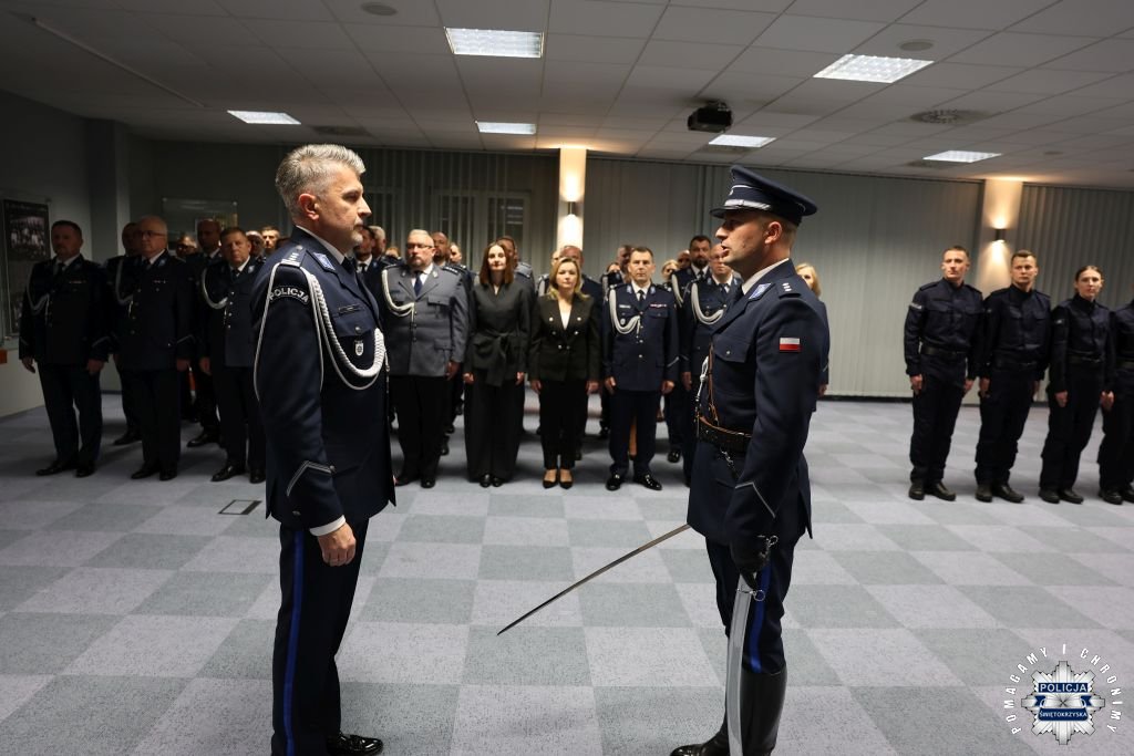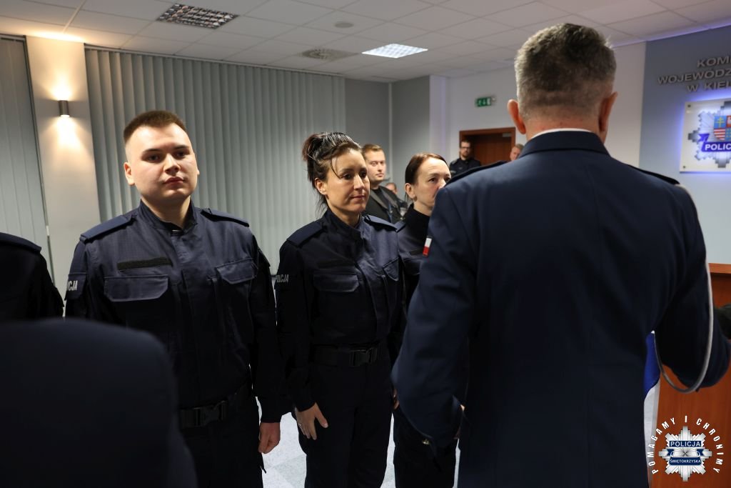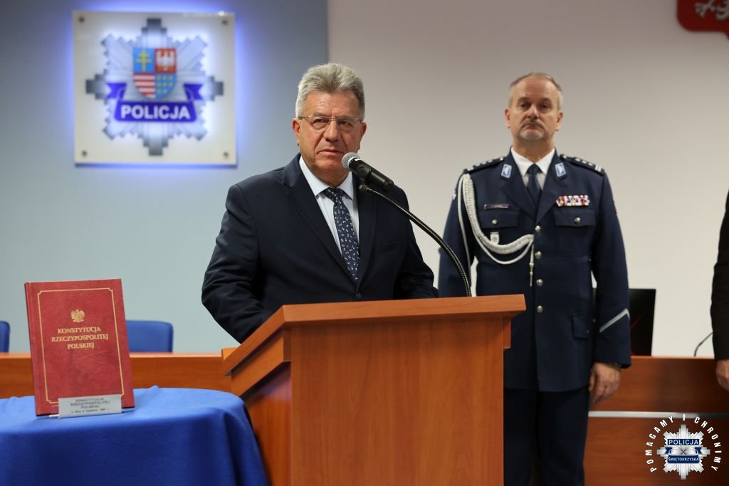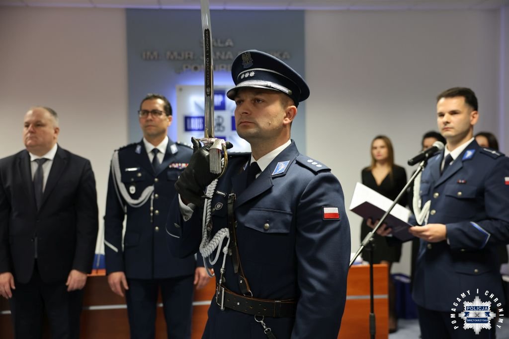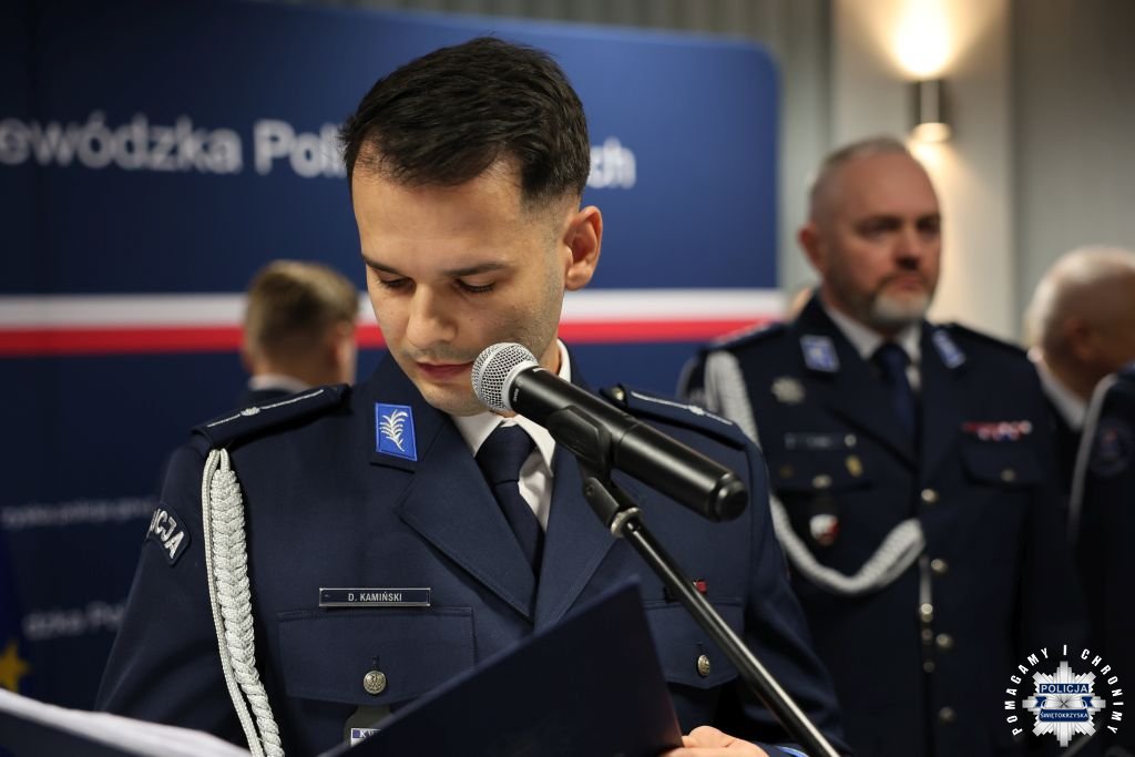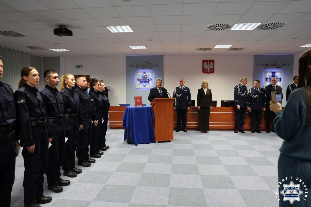 Niezwykle istotnym punktem dzisiejszej uroczystości było ślubowanie nowo przyjętych funkcjonariuszy. Ośmiu policjantów powitał dziś komendant w naszych szeregach. Przed nimi szkolenie zawodowe podstawowe, po którym, za kilka miesięcy, powrócą by pełnić codzienną służbę w naszym garnizonie.
