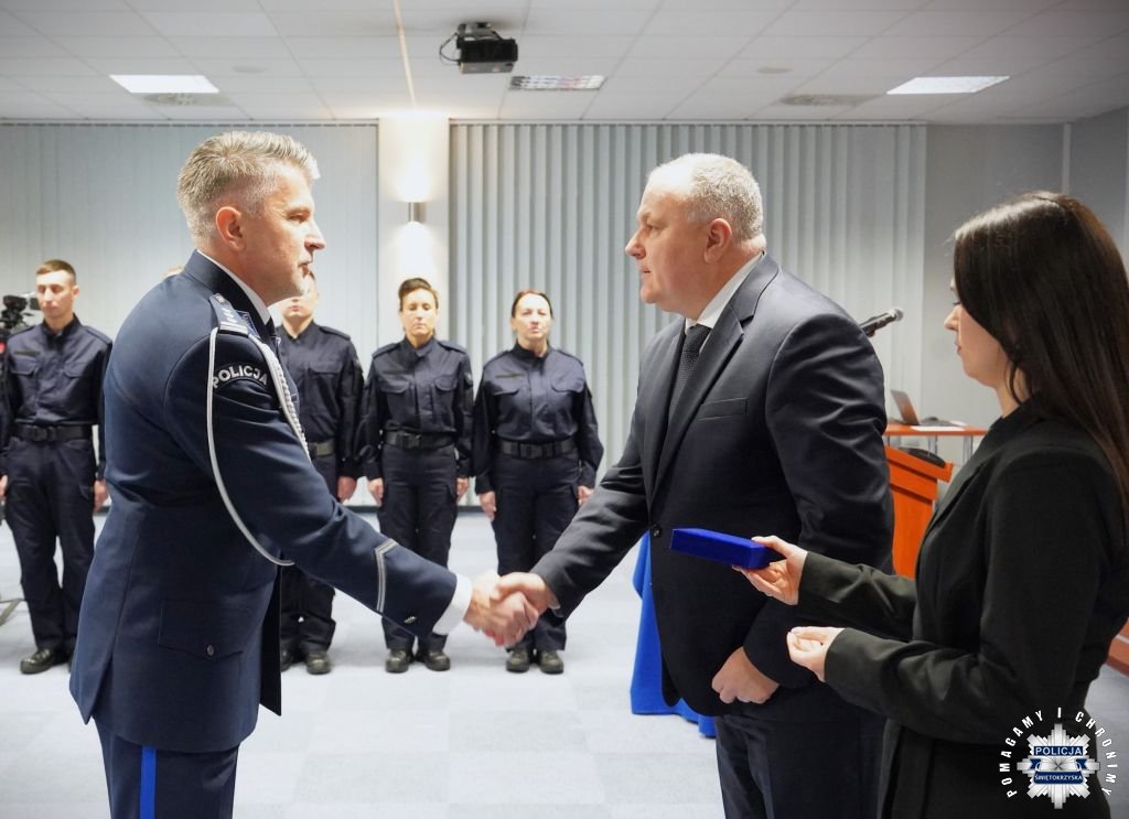 Kolejnym istotnym punktem uroczystości było nadanie Złotej Odznaki „Zasłużony dla Krajowej Administracji Skarbowej” Komendantowi Wojewódzkiemu Policji w Kielcach inspektorowi Zbigniewowi Nowakowi. Wyróżnienie wręczył Dyrektor Izby Administracji Skarbowej w Kielcach Pan Paweł Cymbalak.