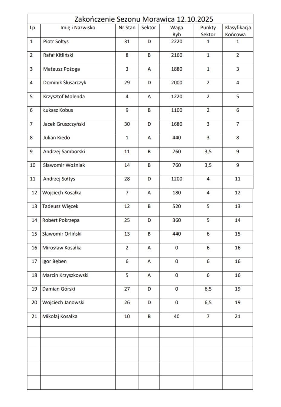W niedzielę, 12.10.2025 r. nad morawickim zalewem odbyły się zawody na zakończenie sezonu, zorganizowane przez koło PZW Morawica. Do rywalizacji przystąpiło 21 seniorów oraz 10 juniorów. Tytuły „Wędkarzy roku 2025” zdobyli Dominik Ślusarczyk (kat. dorosłych) oraz Kacper Molenda (kat. dzieci). Zawody odbyły się pod patronatem Burmistrza Miasta i Gminy Morawica.