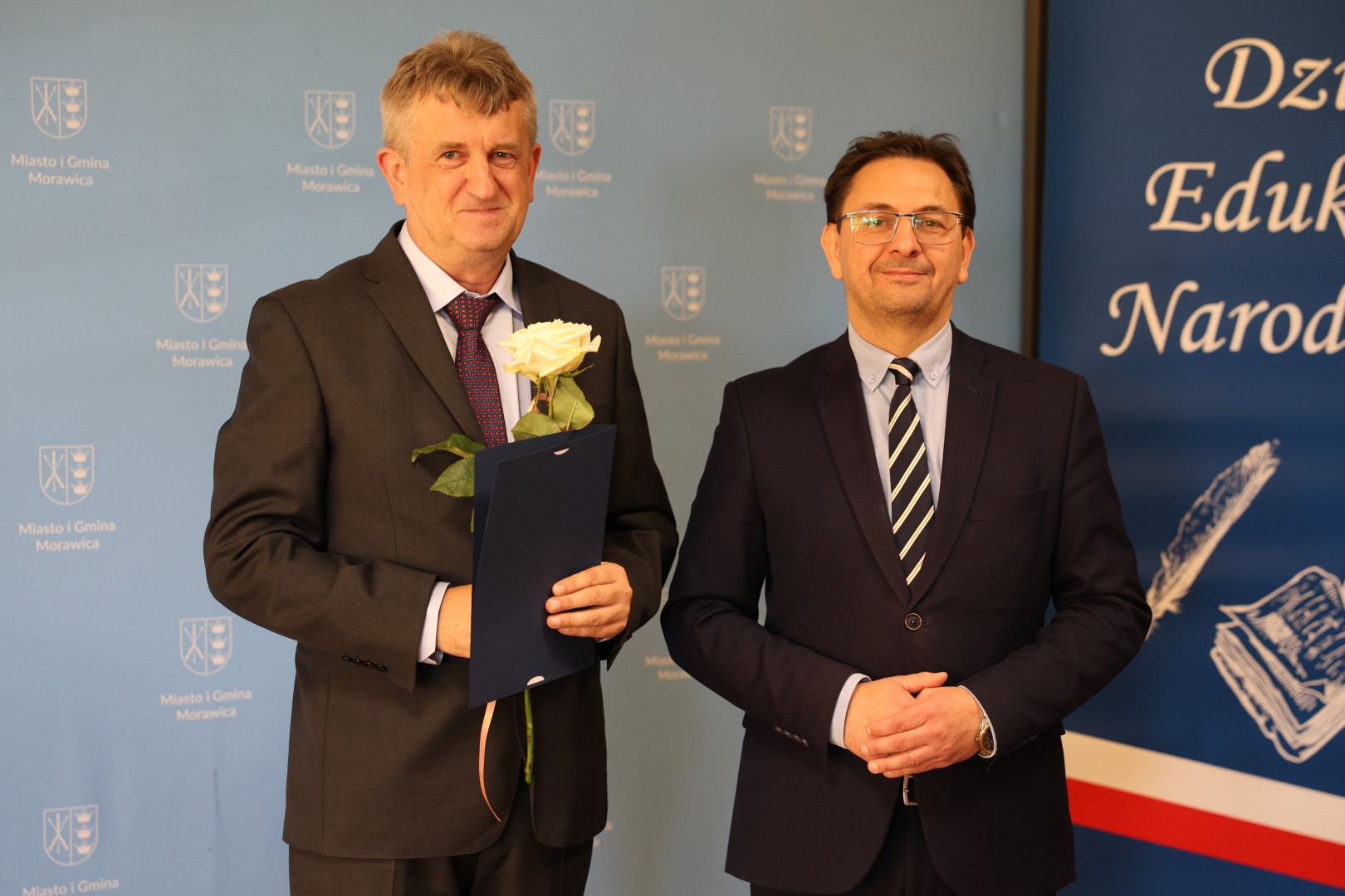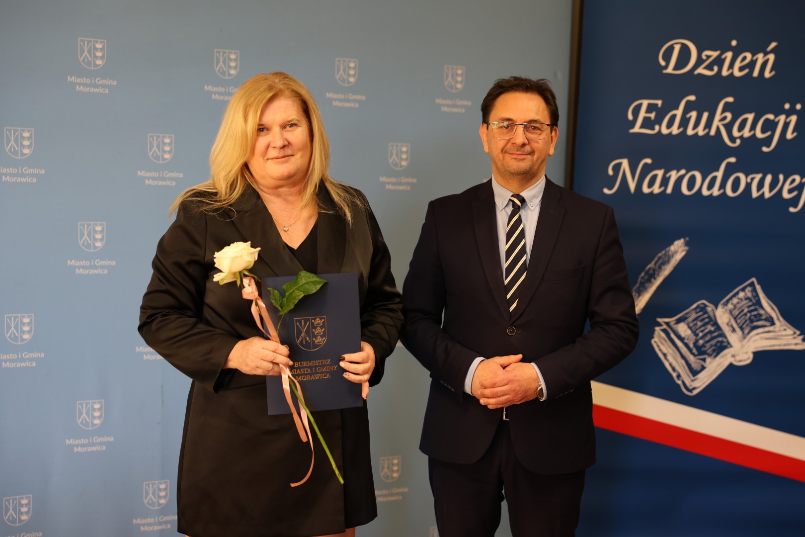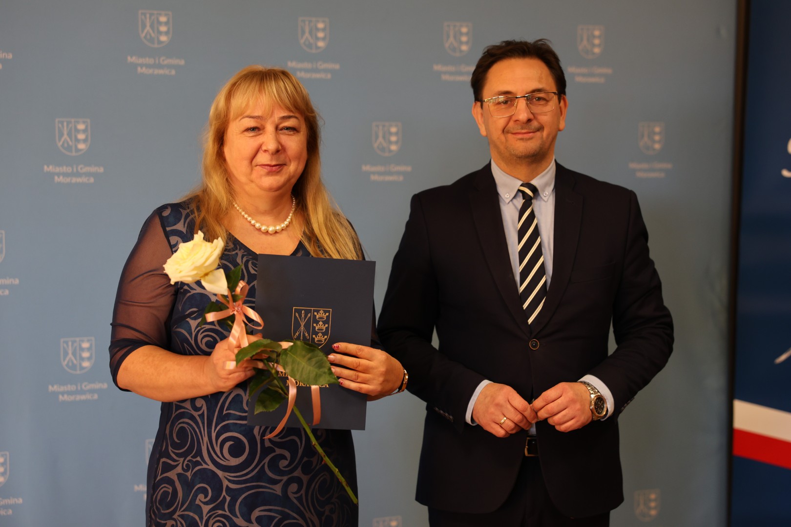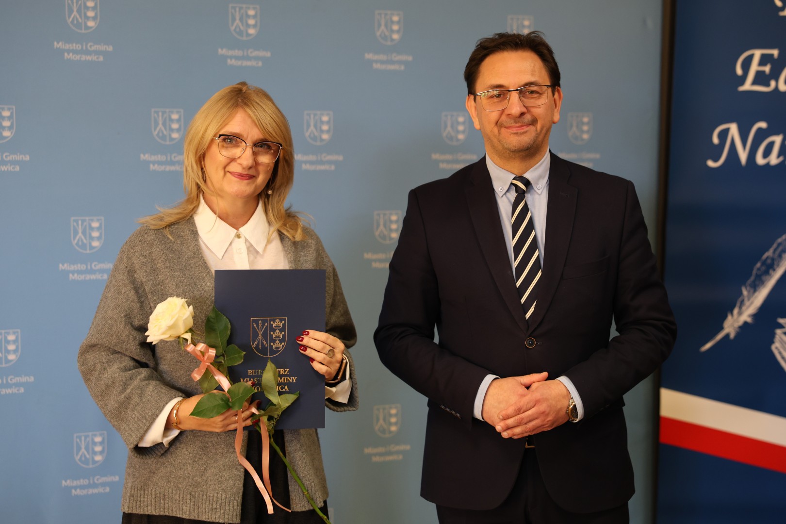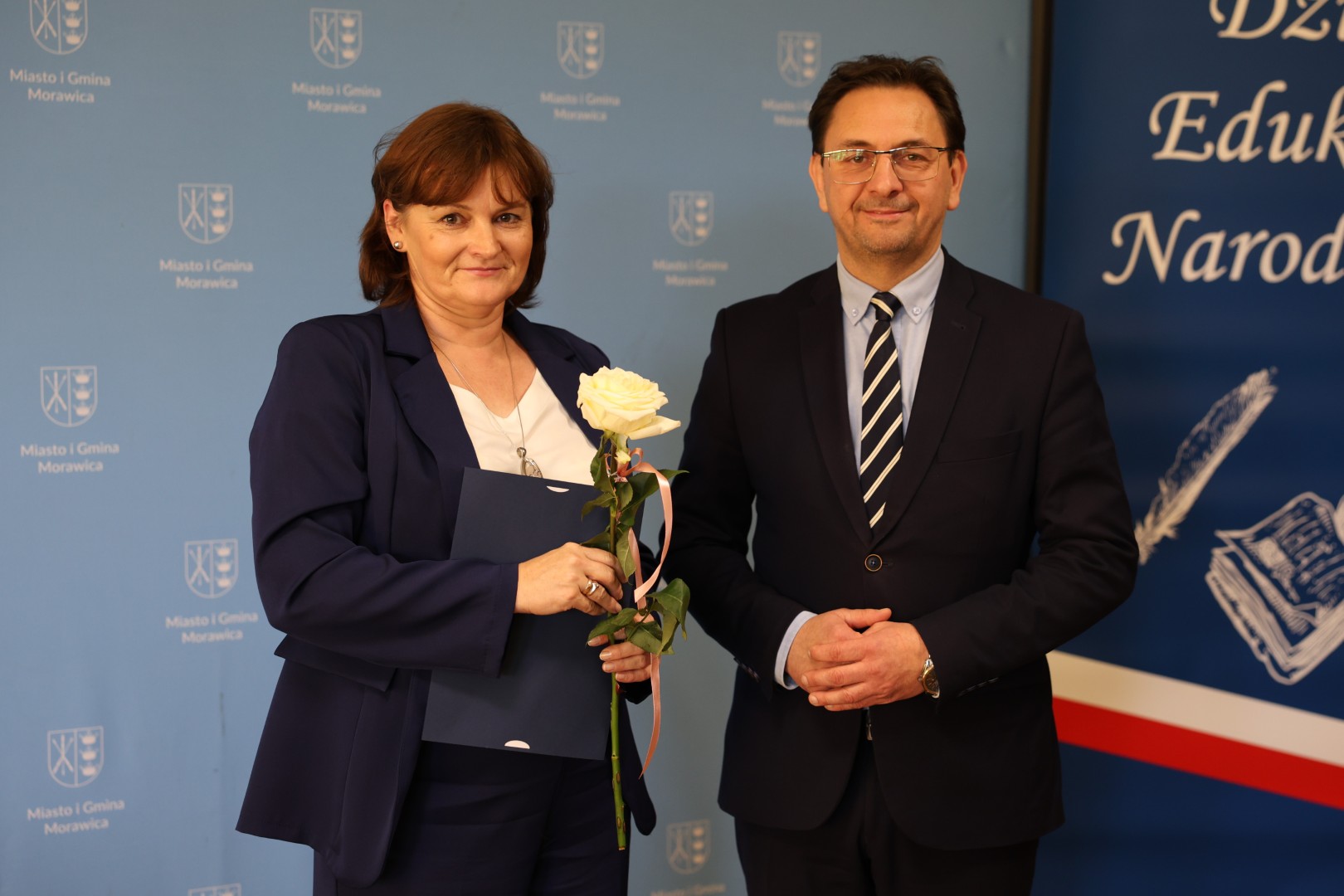 Pamiątkowe listy gratulacyjne oraz róże dla nauczycieli i dyrektorów wręczyli Zastępca Burmistrza Miasta i Gminy Morawica Marcin Dziewięcki oraz Sekretarz Miasta i Gminy Morawica Anna Kowalska.