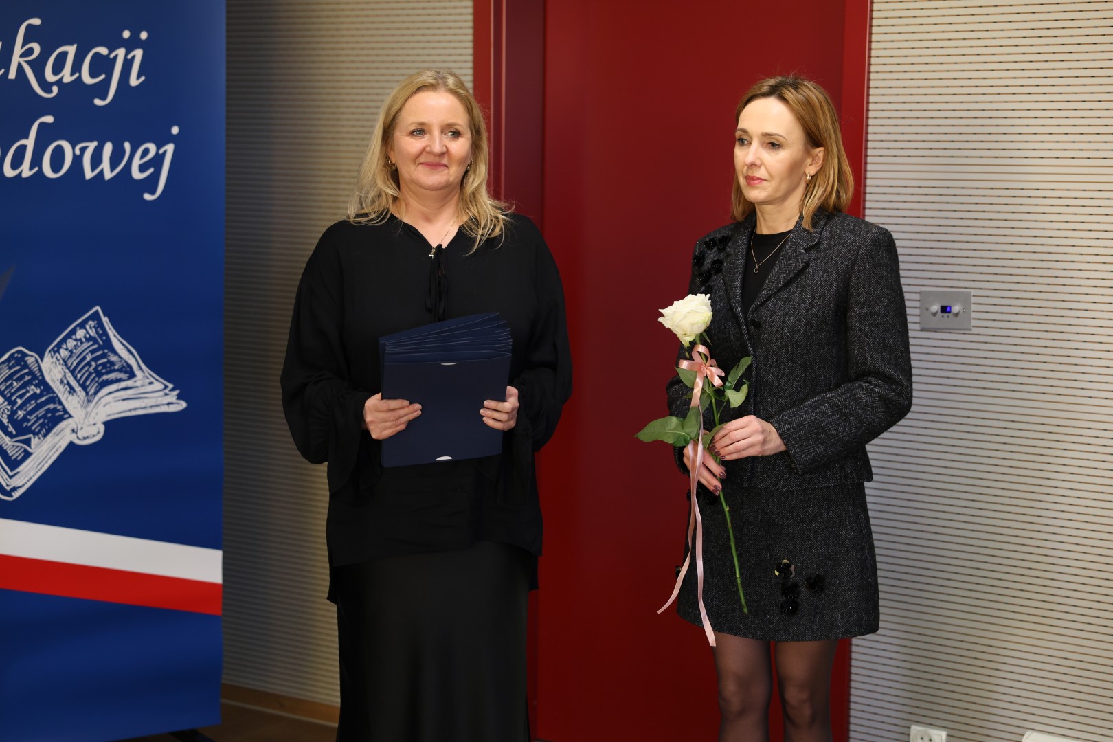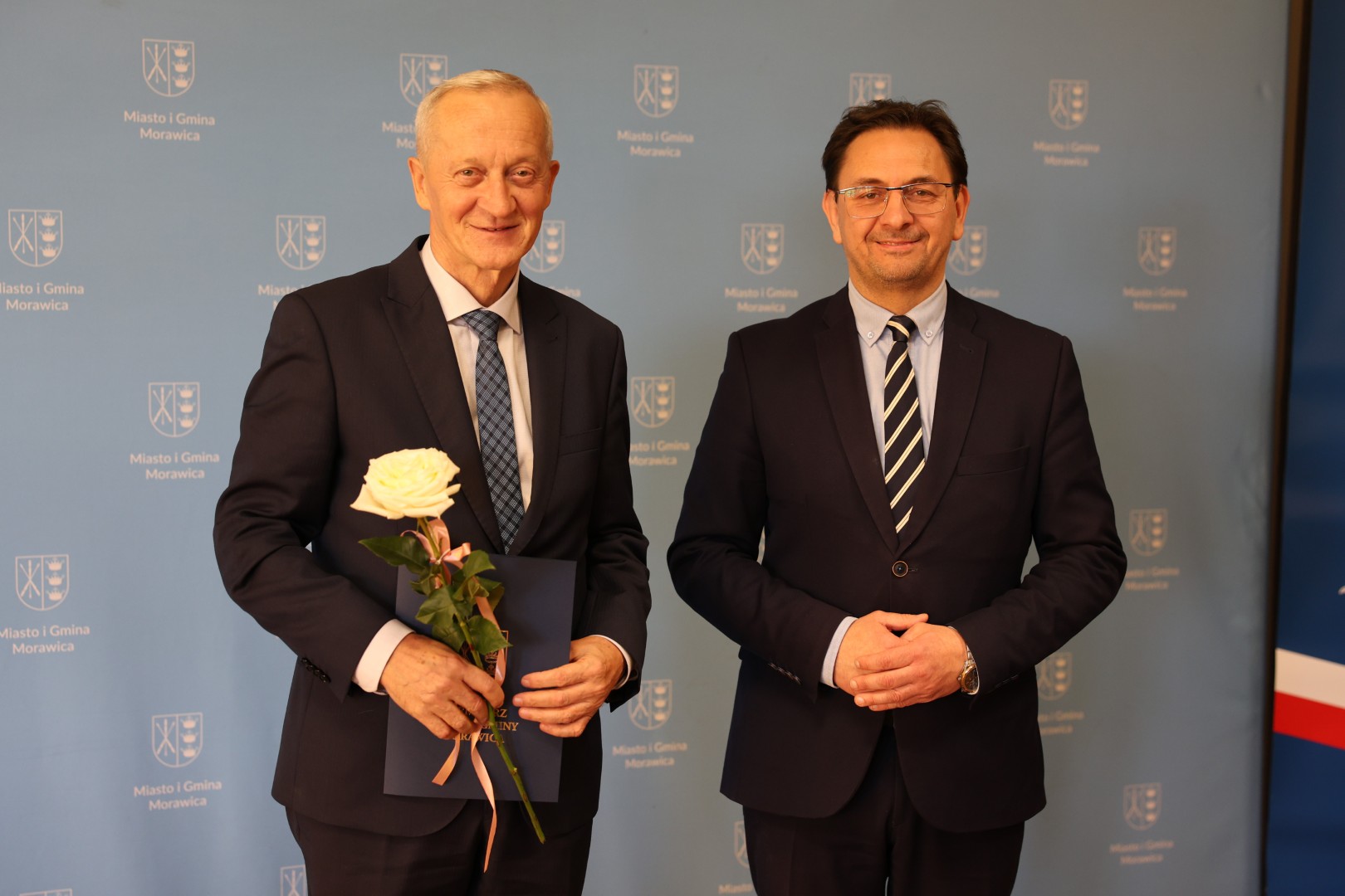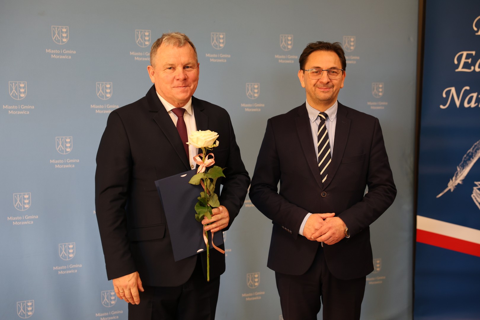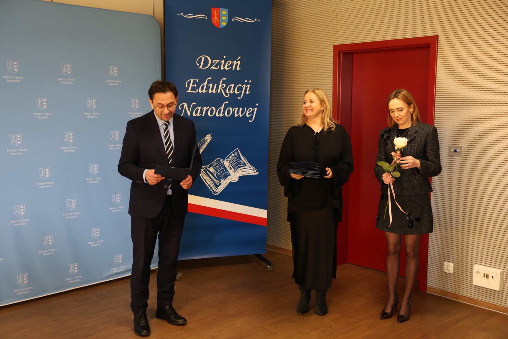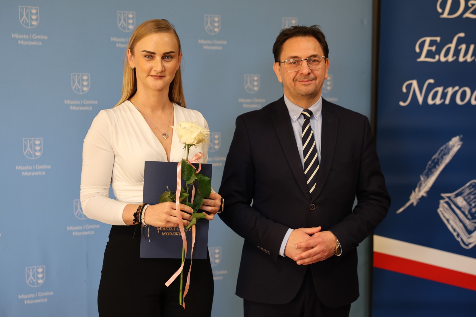 Pamiątkowe listy gratulacyjne oraz róże dla nauczycieli i dyrektorów wręczyli Zastępca Burmistrza Miasta i Gminy Morawica Marcin Dziewięcki oraz Sekretarz Miasta i Gminy Morawica Anna Kowalska.