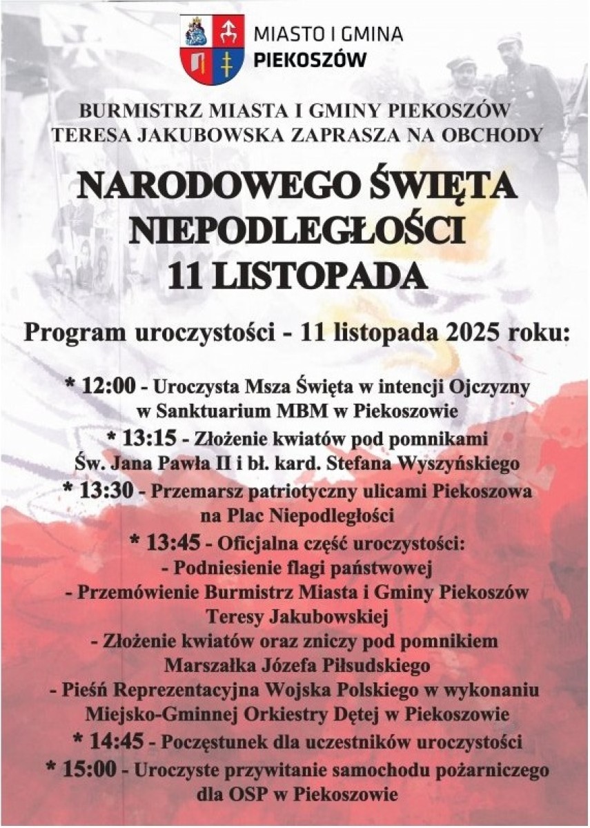 Gmina Piekoszów – 11 listopadamieszkańcy gminy Piekoszów spotkają się, aby wspólnie uczcić 107. rocznicę odzyskania przez Polskę niepodległości. W programie zaplanowano mszę świętą o godz 12:00, patriotyczny przemarsz oraz złożenie kwiatów pod pomnikami upamiętniającymi wielkich Polaków.