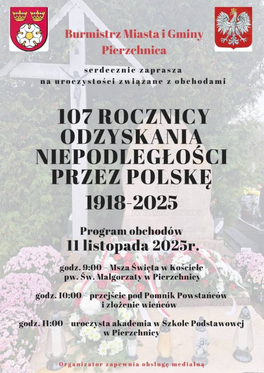 Miasto i Gmina Pierzchnica – 11 listopada zaplanowano uroczysta Mszę Świętą o godz. 09:00 w kościele w Pierzchnicy, a także złożenie wieńców przed Pomnikiem Powstańców.