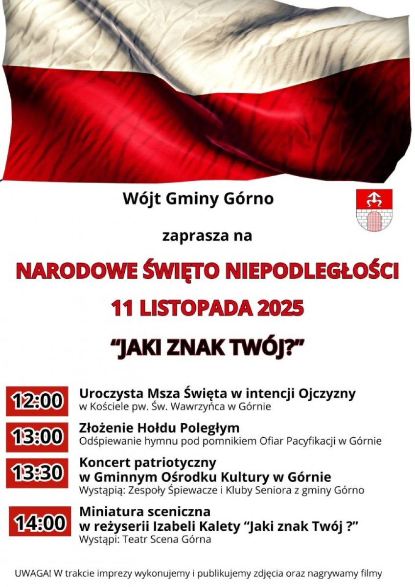 Gmina Górno- już 8 listopada odbędzie się Patriotyczny Rajd Pieszy z okazji Narodowego Święta Niepodległości. Uroczyste obchody rozpocznie 11 listopada o godz.12:00 uroczysta Msza Święta w Intencji Ojczyzny w kościele pw. Św. Wawrzyńca w Górnie. W programie także m.in. Koncert Patriotyczny w sali widowiskowej Gminnego Ośrodka Kultury w Górnie oraz miniatura sceniczna w reżyserii Izabeli Kalety pt. „Jaki znak Twój?” w wykonaniu Teatru Scena Górna.