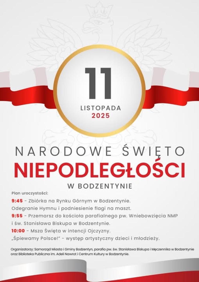 Gmina Bodzentyn zaprasza do wspólnego udziału w uroczystościach patriotycznych! Początek uroczystości o godz.9.45 – zbiórka na Rynku Górnym, odegranie hymnu narodowego i wciągnięcie flagi na maszt. Następnie przemarsz do kościoła św. Stanisława. Po mszy zaplanowano występ artystyczny dzieci i młodzieży „Śpiewamy Polsce!”