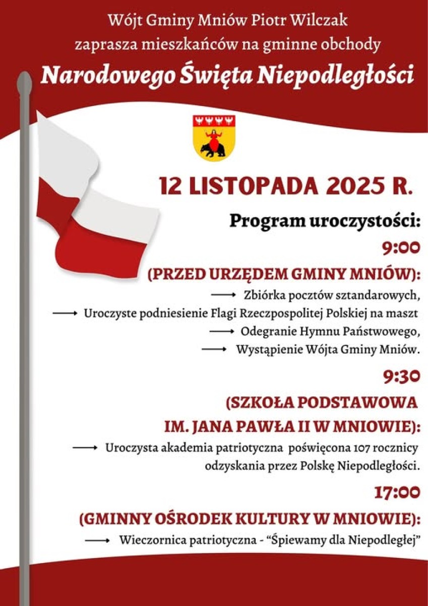 Gmina Mniów – uroczystości odbędą się 12 listopada przed Urzędem Gminy od godz. 9:00. Następnie dalsza część uroczystych obchodów Narodowego Święta Niepodległości będzie odbywać się w szkole podstawowej gdzie zaplanowano uroczysta akademie patriotyczną. O godz. 17:00 wieczornica patriotyczna w Gminnym Ośrodku Kultury.