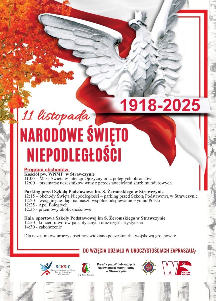 Gmina Strawczyn – uroczyste obchody rozpoczną się Mszą Świętą o godz. 11:00. Następnie uczestniczy przemaszerują na plac przed szkołą w Strawczynie, gdzie odbędą się oficjalne obchody. Następnie organizatorzy zapraszają na koncert i występy artystyczne na sali gimnastycznej w ZPO.
