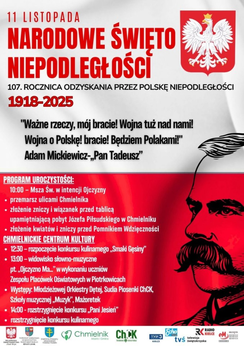 Miasto i Gmina Chmielnik – uroczystości rozpocznie o godz. 10:00 Msza Święta w intencji Ojczyzny w kościele parafialnym w Chmielniku. W programie: przemarsz ulicami miasta, złożenie kwiatów i zniczy przed tablicą upamiętniającą pobyt Józefa Piłsudskiego w Chmielniku. Uroczyste podniesienie na maszt flagi państwowej w Parku Niepodległości. Złożenie kwiatów i zniczy przed Pomnikiem Wdzięczności. W Chmielnickim Centrum Kultury będzie odbywał się m.in. XIV KONKURS KULINARNY „SMAKI GĘSINY” .