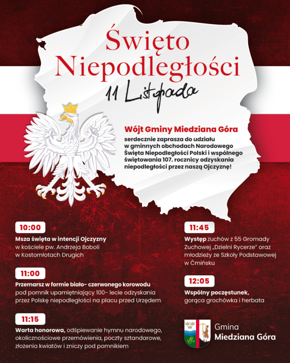 Gmina Miedziana Góra – gminne obchody rozpocznie Msza Święta w intencji Ojczyzny o godz. 10:00. Następnie uczestnicy uroczystości przemaszerują w formie biało- czerwonego korowodu pod pomnik upamiętniający 100 – lecie odyskania Niepodległości, przed urzędem, gdzie odbędą się oficjalne obchody.