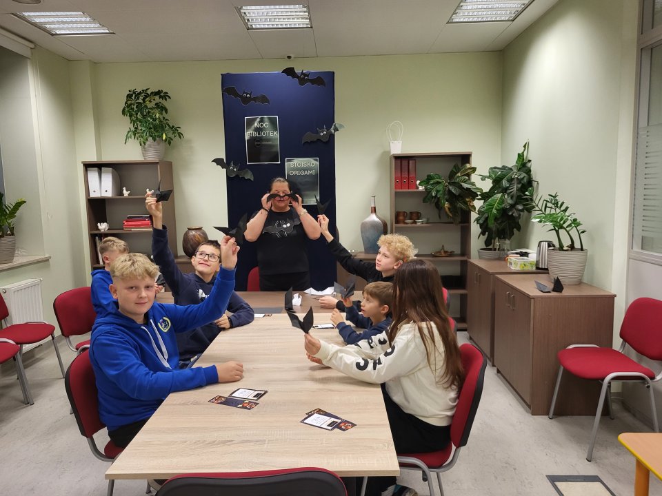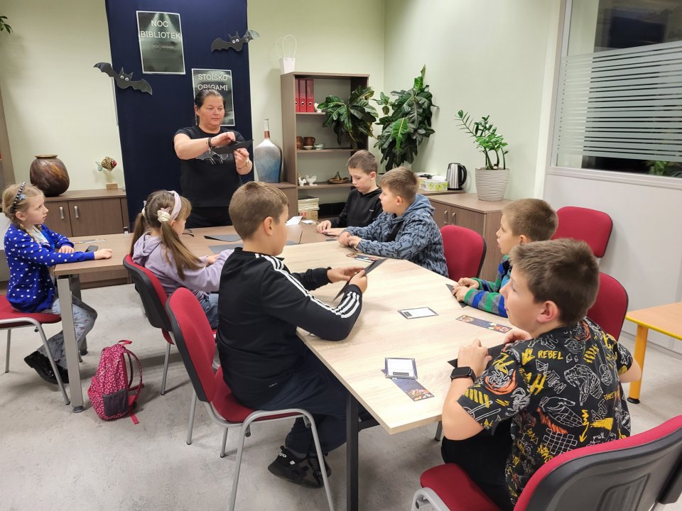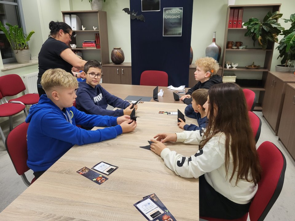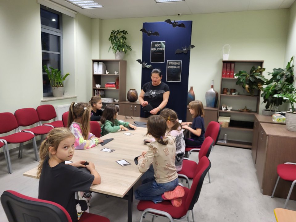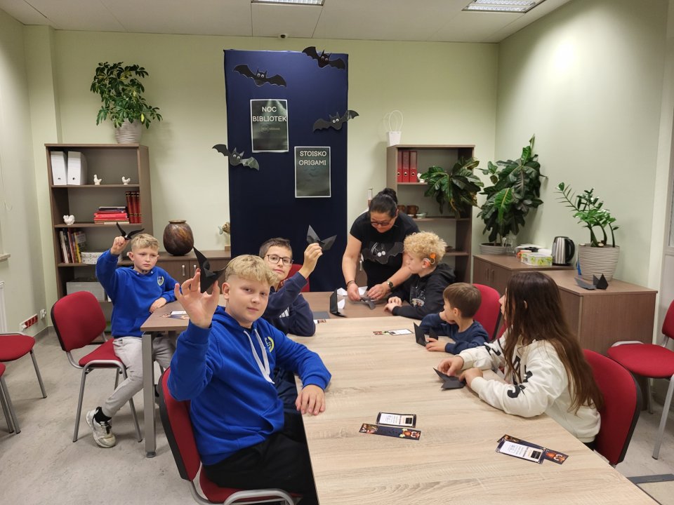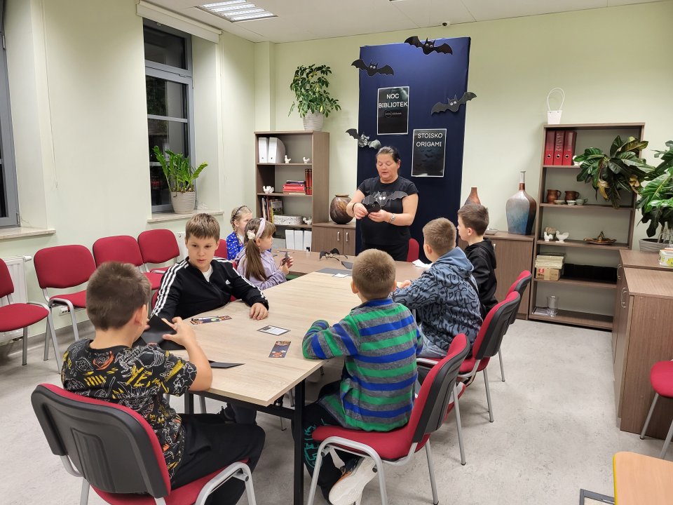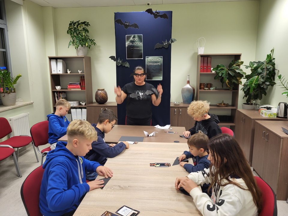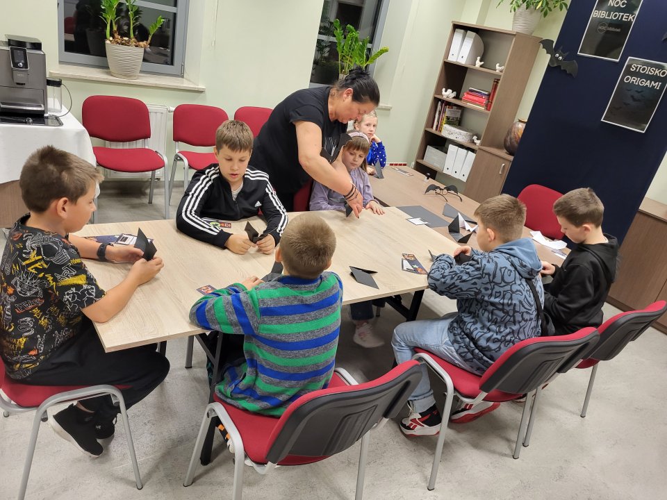 Stoisko origami – pod czujnym okiem bibliotekarki mali artyści składali z czarnego papieru króla nocy –