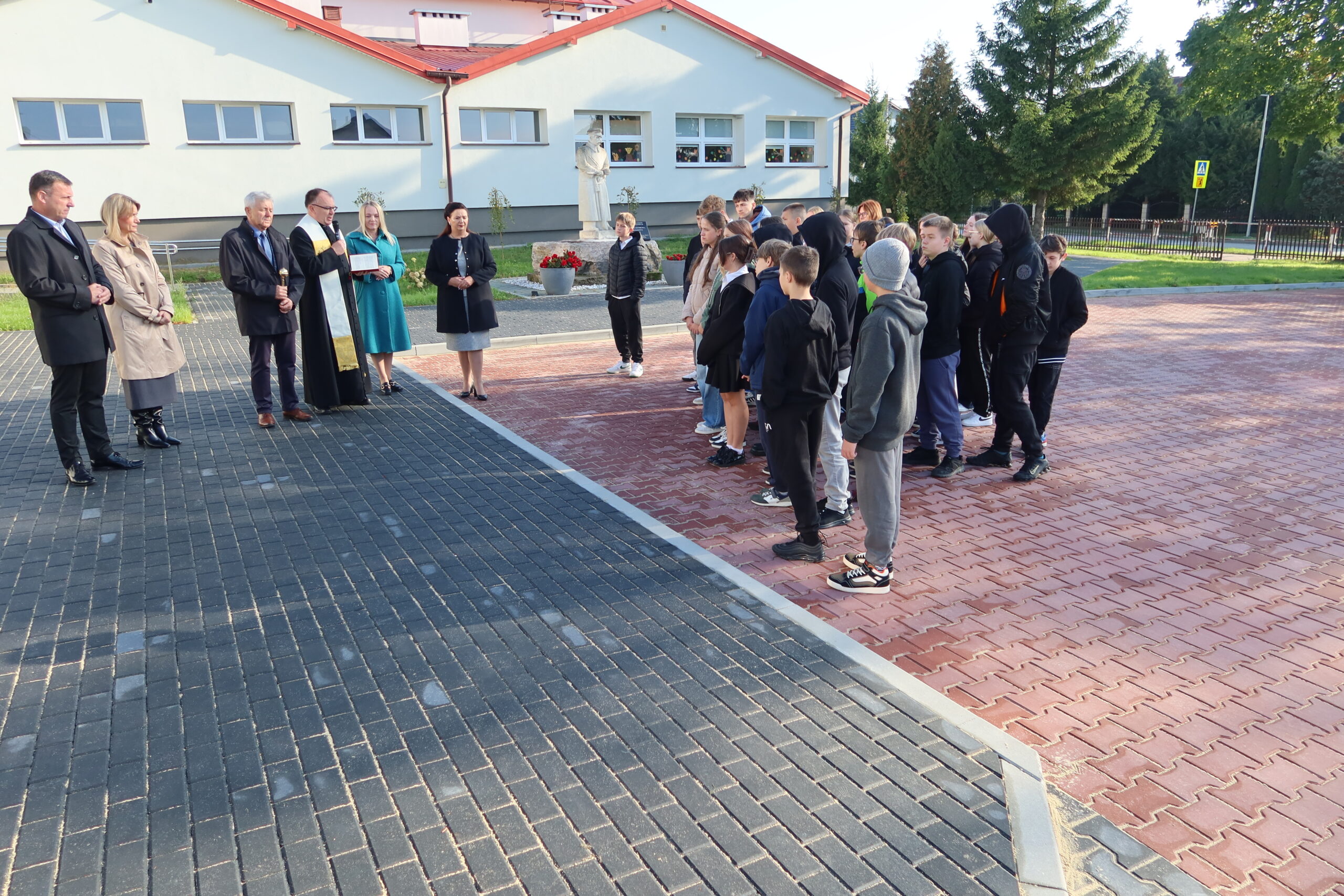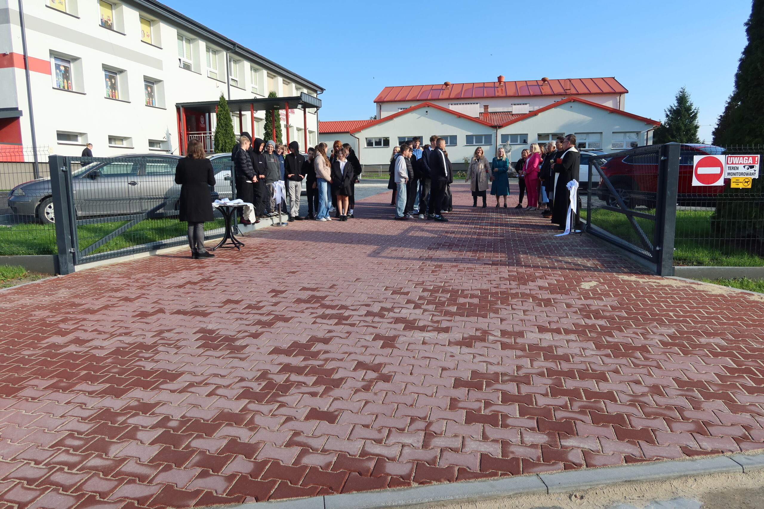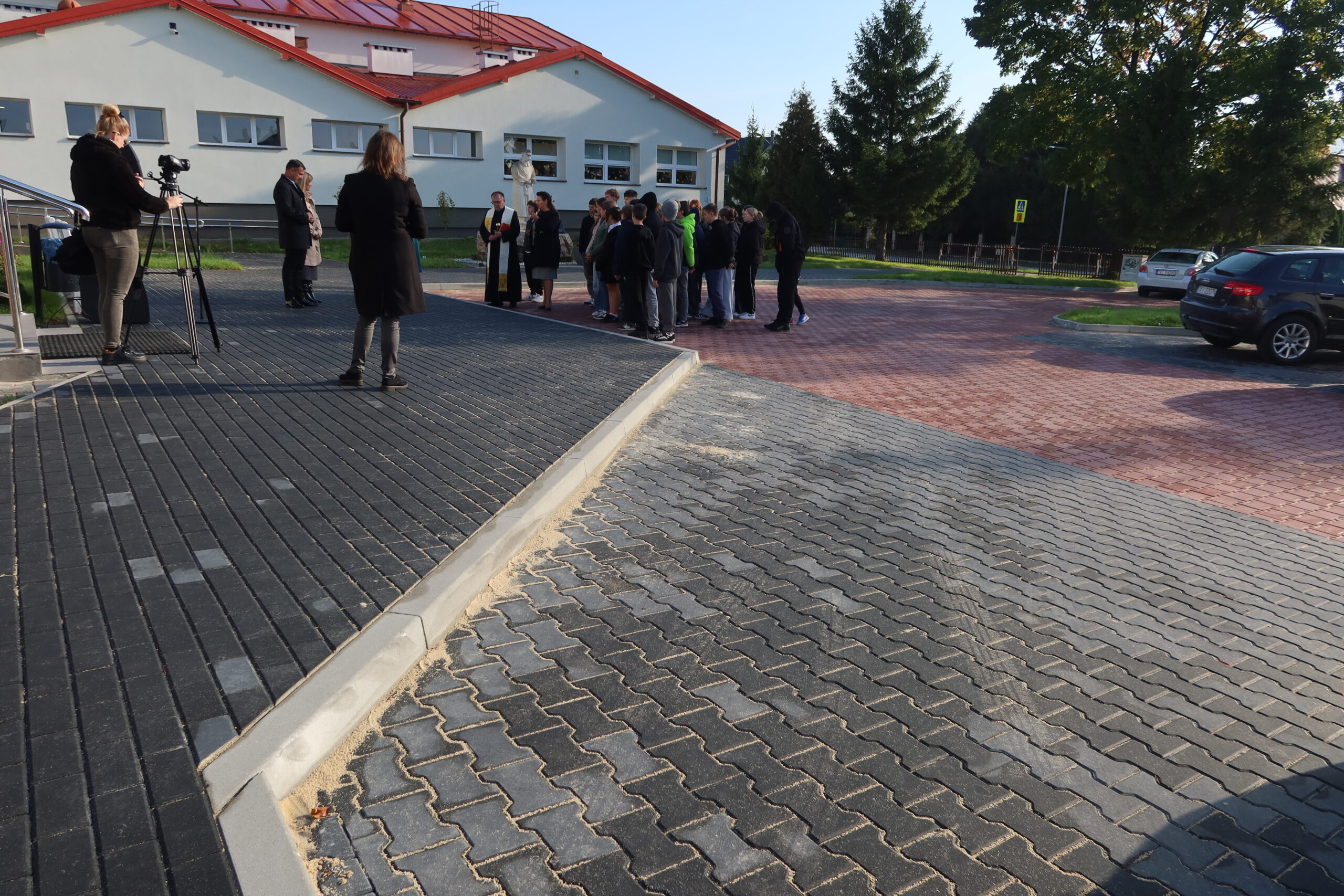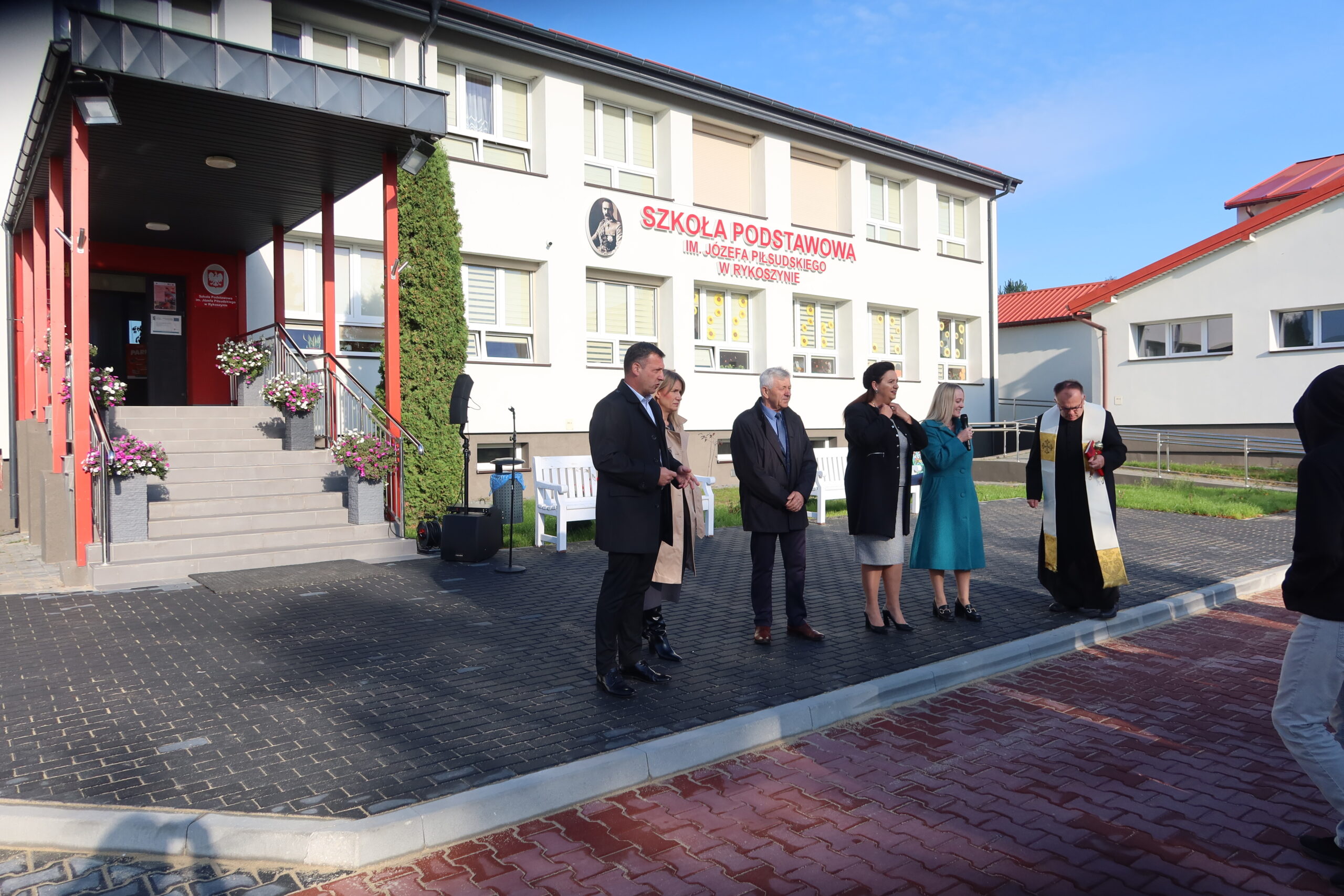 Proboszcz parafii pw. Świętego Maksymiliana Marii Kolbego w Rykoszynie, ks. Tadeusz Lalewicz, dokonał poświęcenia parkingu w obecności uczniów, rodziców, nauczycieli, dyrekcji oraz władz samorządowych, wśród których poza burmistrz Teresą Jakubowską obecny był także radny Łukasz Podsiadły i sołtys Waldemar Kotwica.