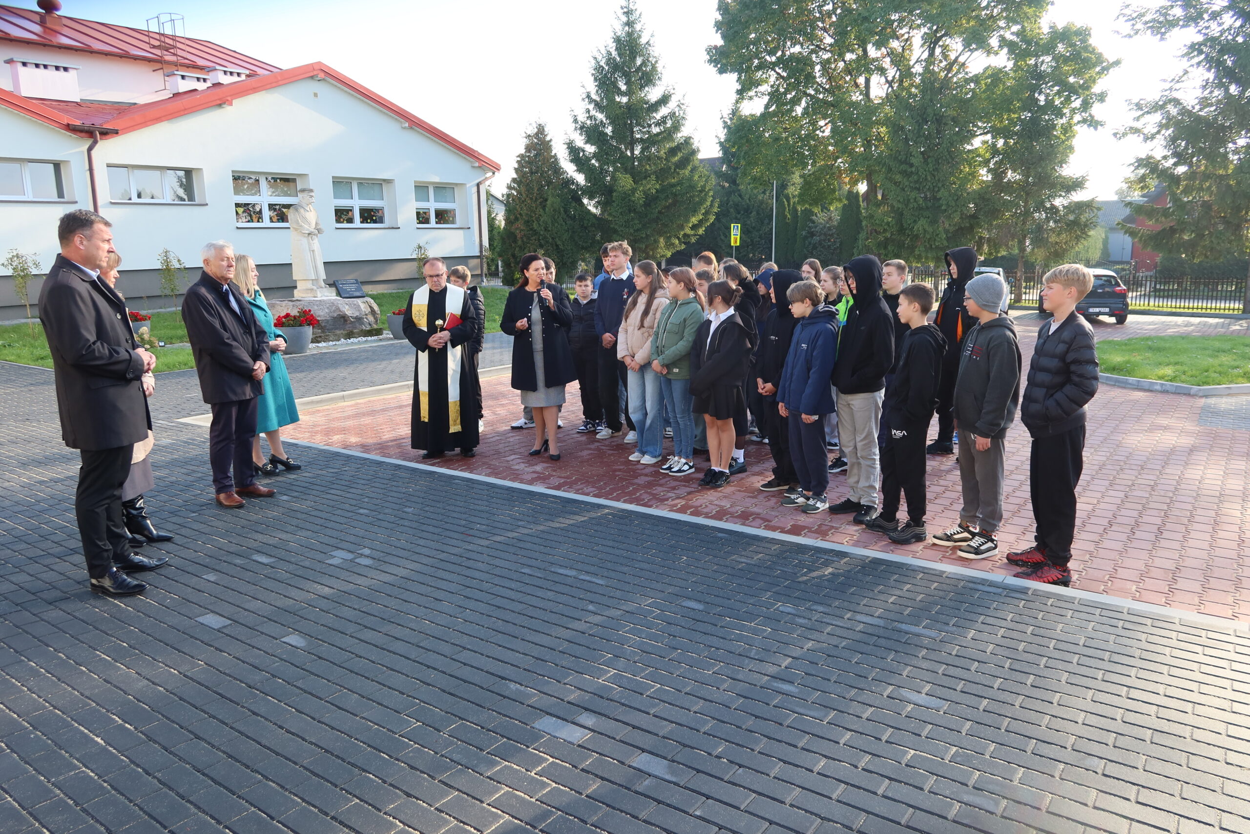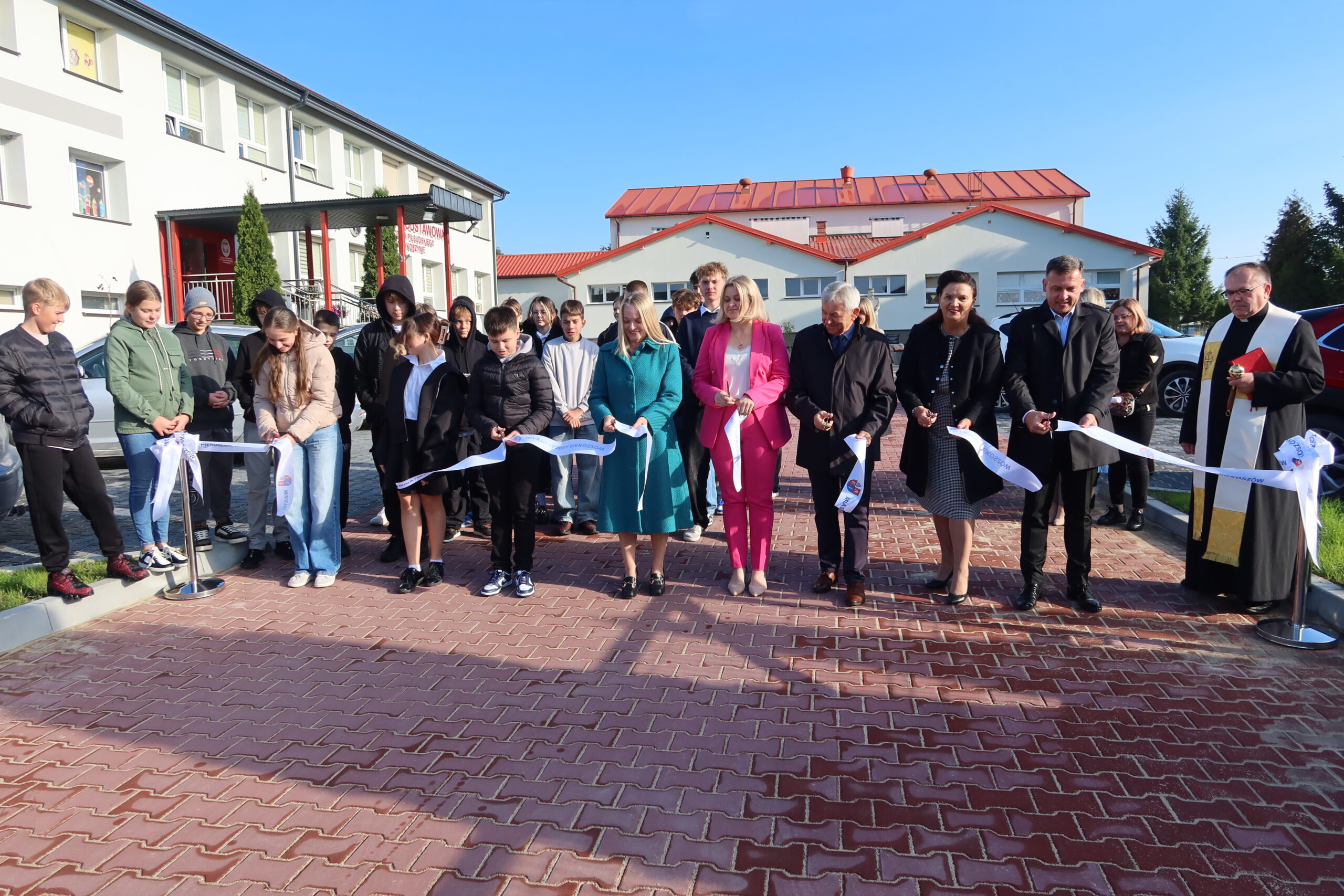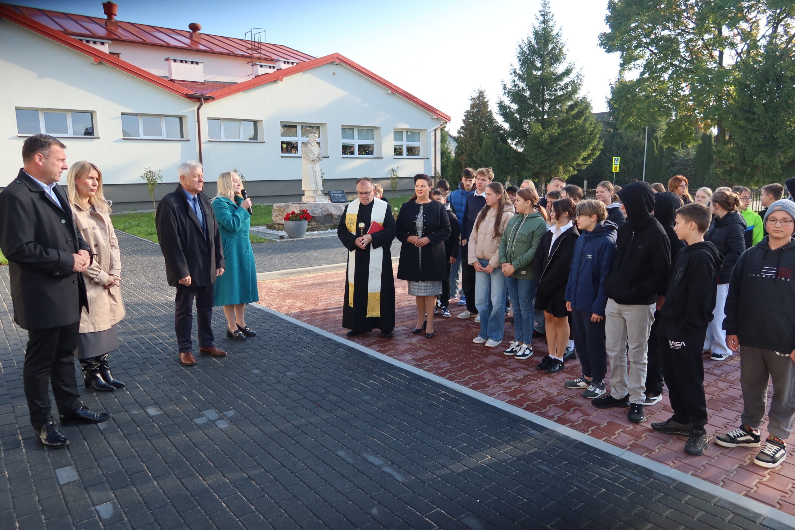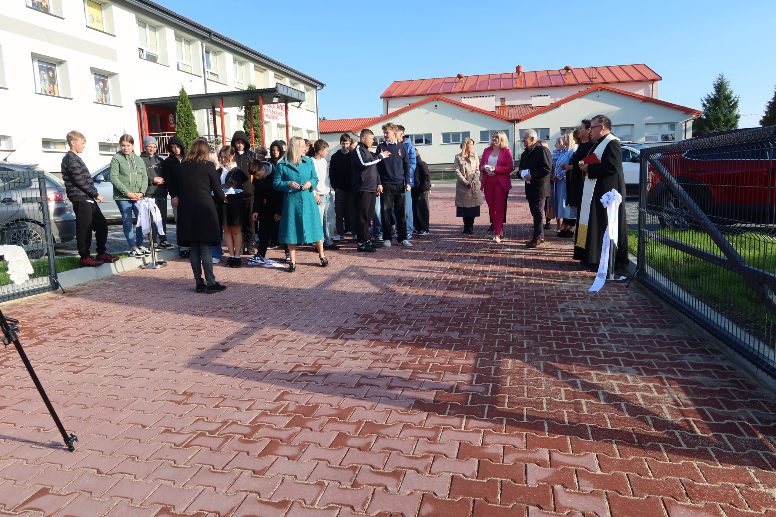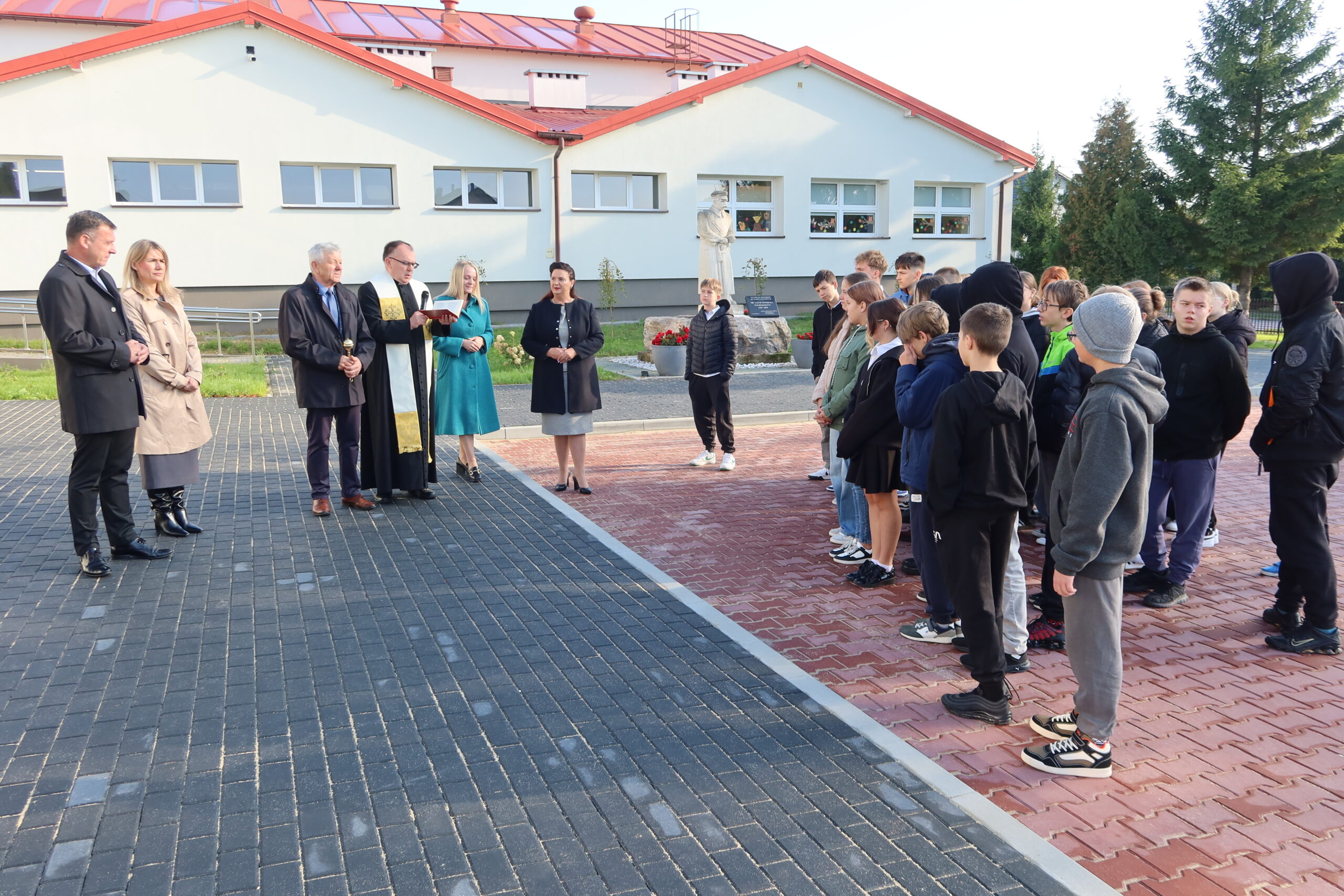 Proboszcz parafii pw. Świętego Maksymiliana Marii Kolbego w Rykoszynie, ks. Tadeusz Lalewicz, dokonał poświęcenia parkingu w obecności uczniów, rodziców, nauczycieli, dyrekcji oraz władz samorządowych, wśród których poza burmistrz Teresą Jakubowską obecny był także radny Łukasz Podsiadły i sołtys Waldemar Kotwica.