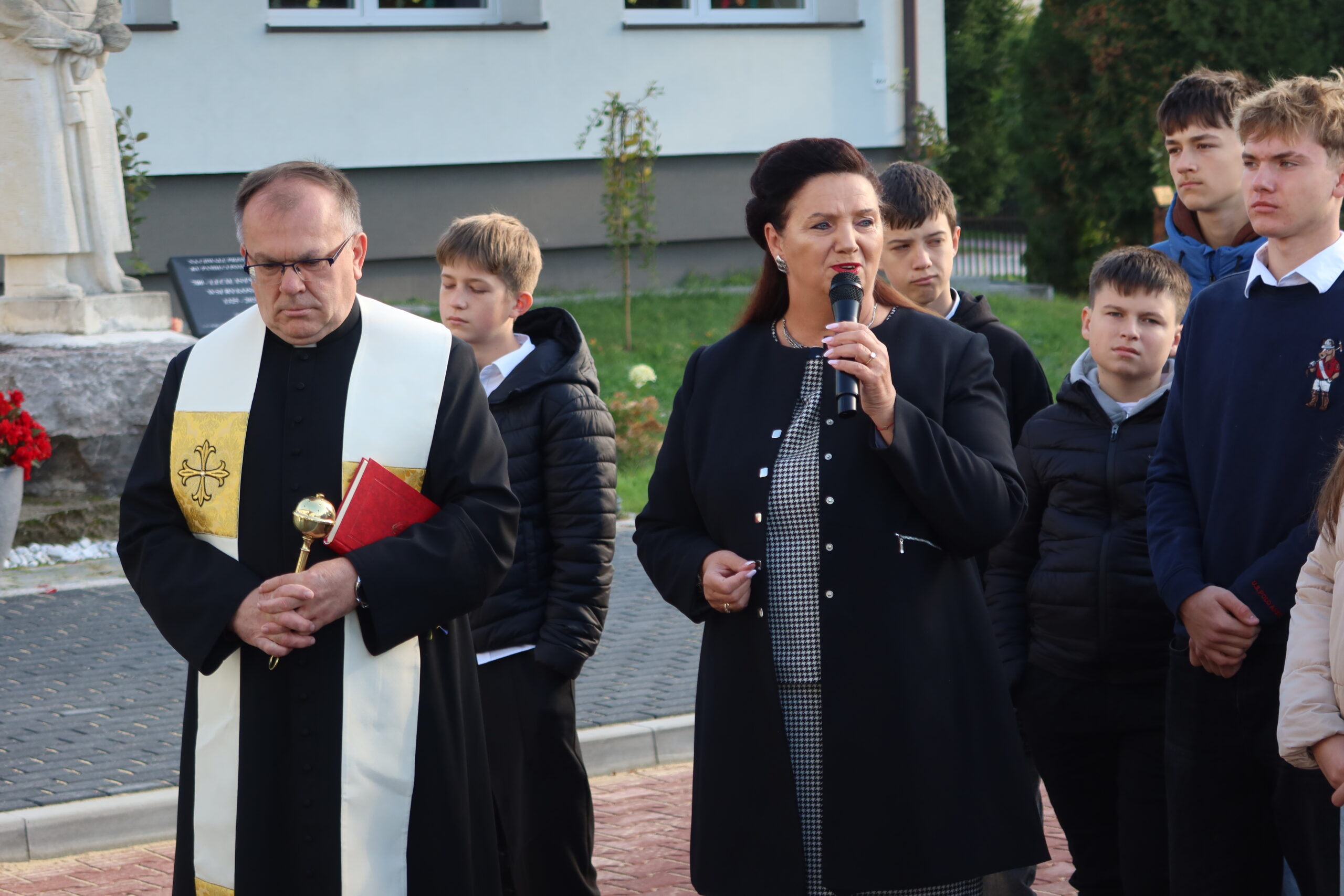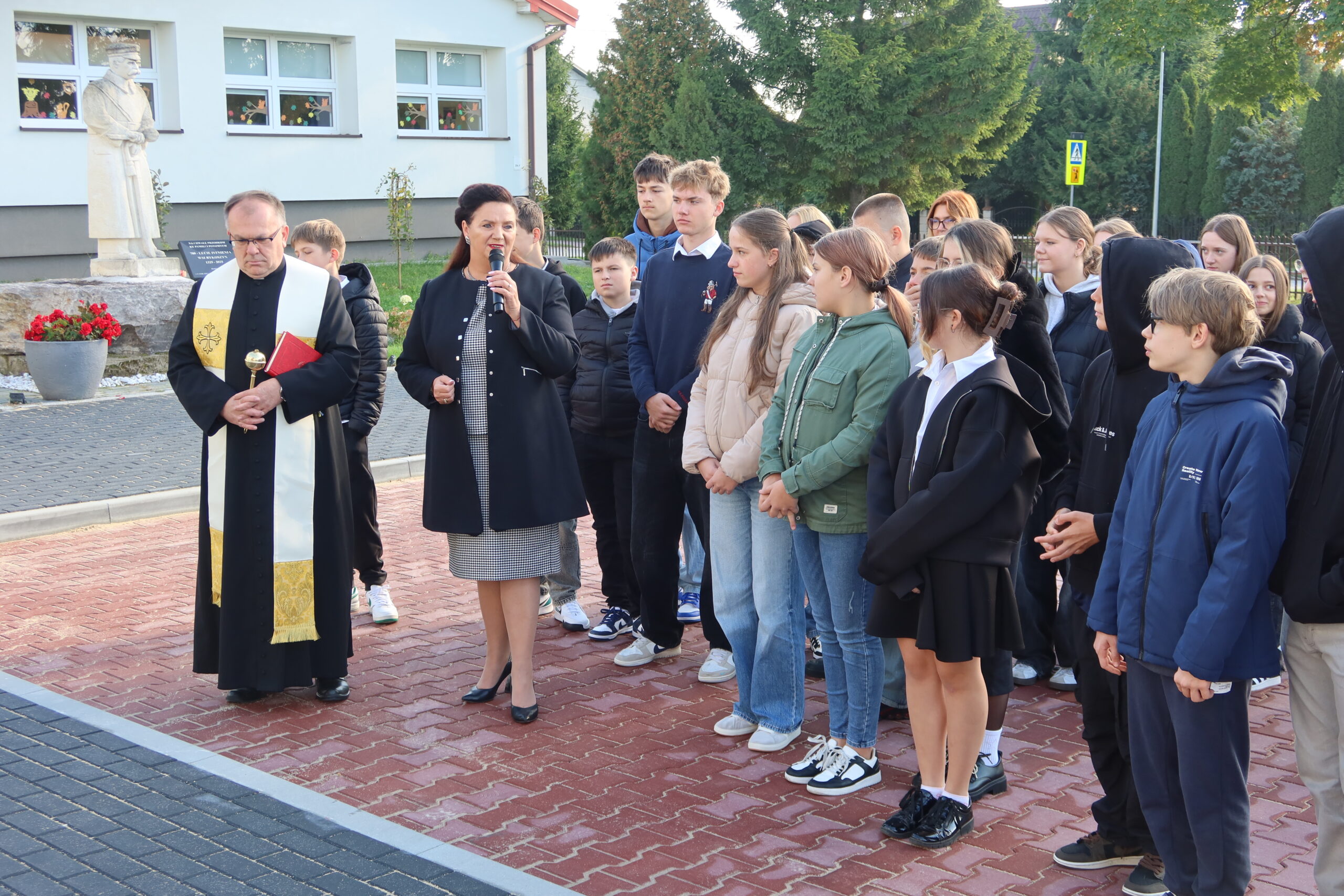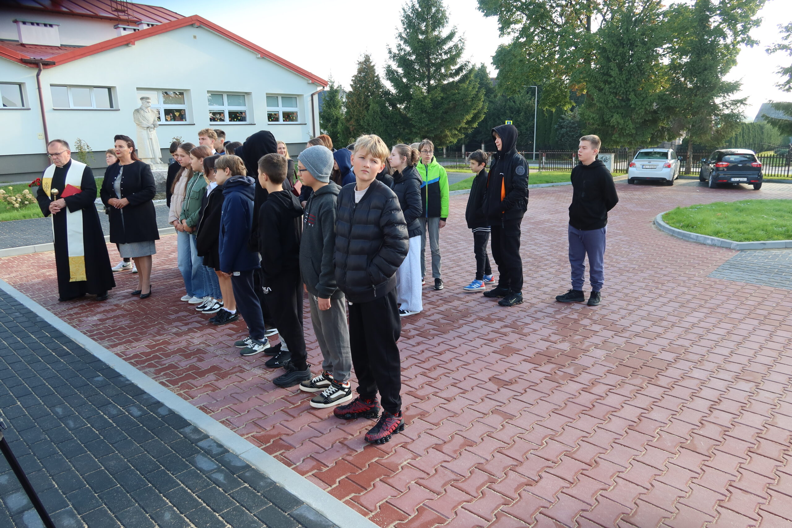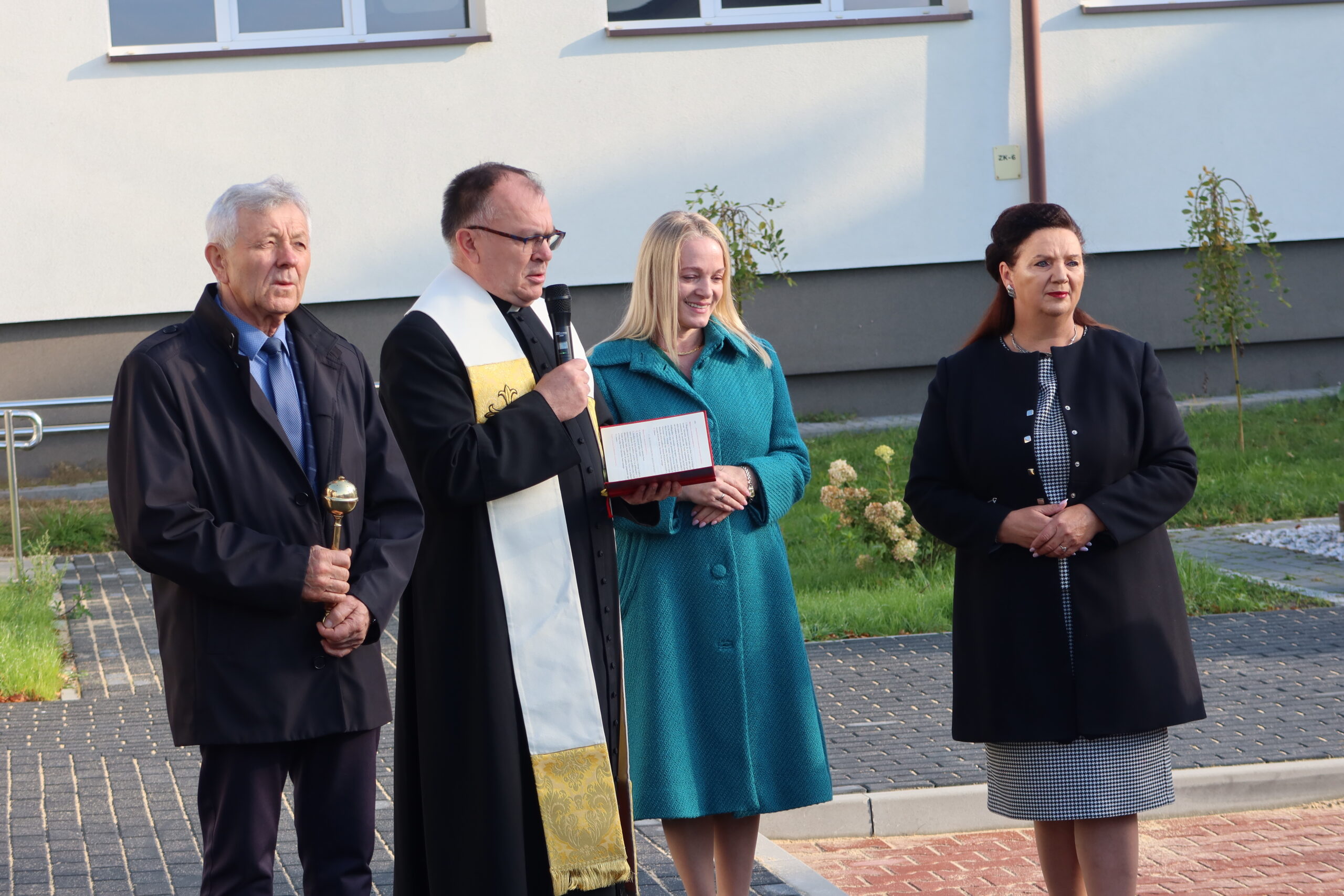 Proboszcz parafii pw. Świętego Maksymiliana Marii Kolbego w Rykoszynie, ks. Tadeusz Lalewicz, dokonał poświęcenia parkingu w obecności uczniów, rodziców, nauczycieli, dyrekcji oraz władz samorządowych, wśród których poza burmistrz Teresą Jakubowską obecny był także radny Łukasz Podsiadły i sołtys Waldemar Kotwica.