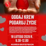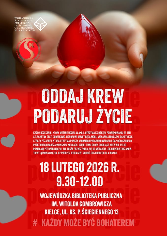 Wojewódzka Biblioteka Publiczna im. Witolda Gombrowicza w Kielcach zaprasza do udziału w akcji honorowego oddawania krwi, która odbędzie się 18 lutego 2026 r. w godzinach 9:30–12:00 w siedzibie Biblioteki.
