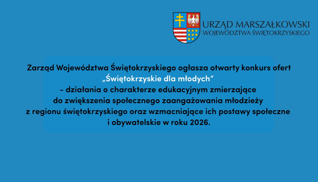 Zarząd Województwa Świętokrzyskiego ogłasza otwarty konkurs ofert „Świętokrzyskie dla młodych” – działania o charakterze edukacyjnym zmierzające do zwiększenia społecznego zaangażowania młodzieży z regionu świętokrzyskiego oraz wzmacniające ich postawy społeczne i obywatelskie w roku 2026. Oferty można składać do 31 marca 2026 r.