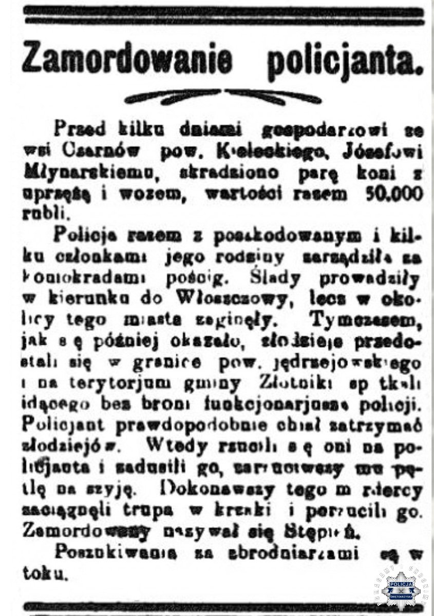 Podczas pełnienia służby 20 czerwca 1920 r. został zamordowany post. Józef Stępień z Posterunku w Nagłowicach. Na podstawie dokumentów można odtworzyć przebieg zdarzenia. Gospodarzowi Józefowi Młynarskiemu, zamieszkałemu we wsi Czarnów pow. kielecki, skradziono parę koni z uprzężą i wozem o wartości łącznej 50 000 rubli. Policja wspólnie z poszkodowanym i członkami jego rodziny zarządziła za koniokradami pościg. Ślady prowadziły w kierunku Włoszczowy, lecz w okolicy tego miasta zaginęły. Jak się okazało, złodzieje skierowali się na teren pow. pow. jędrzejowskiego. W okolicach gminy Złotniki napotkali idącego bez broni funkcjonariusza Policji Państwowej. Był to post. Józef Stępień. Policjant prawdopodobnie chciał zatrzymać złodziei, którzy rzucili się na niego i udusili go poprzez zarzuceni mu pętli na szyję, a następnie zaciągnęli ofiarę w krzaki. Post. Stępień osierocił żonę Agnieszkę i pięcioro dzieci. Działania policji doprowadziły do ujęcia sprawców mordu, Franciszka Mitrę vel Skalskiego zatrzymano w domu, a Jana Imiałka w Częstochowie.