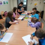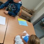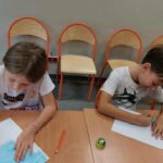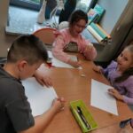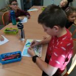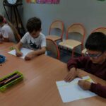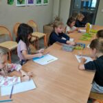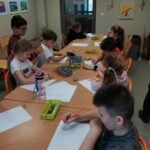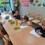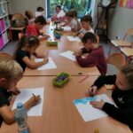 Na zajęciach plastycznych dzieci wspominały wakacje, wykonując prace na temat: „Najwspanialsze wydarzenie z wakacji”. Używały ołówków, kredek oraz suchych pasteli, tworząc barwne i pełne radości rysunki, które przypomniały letnie przygody.