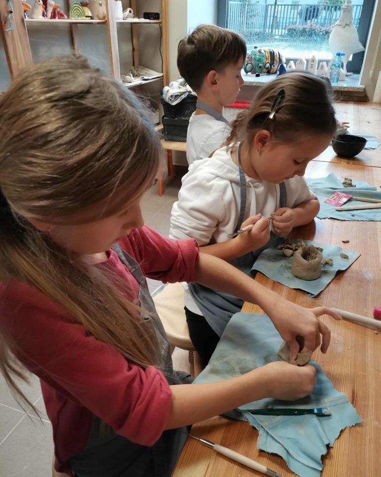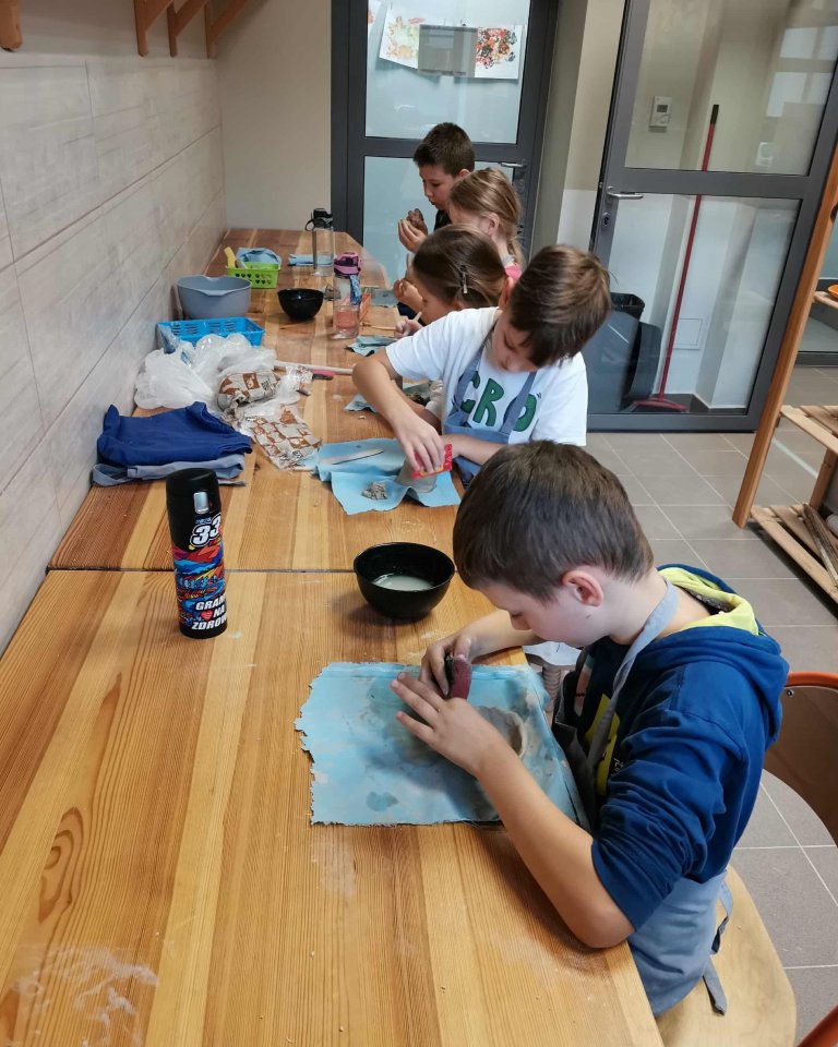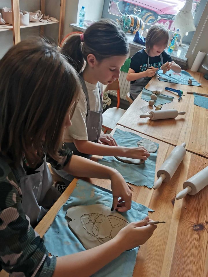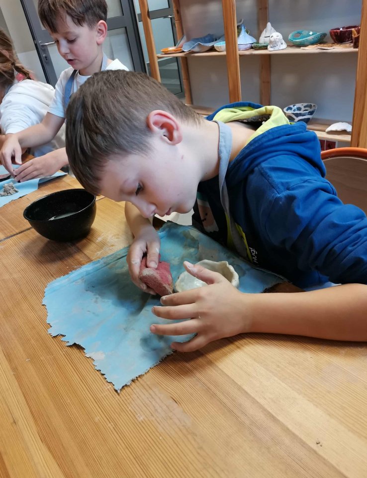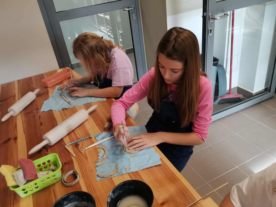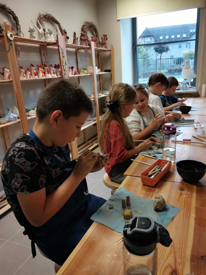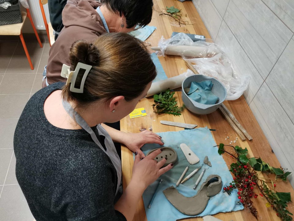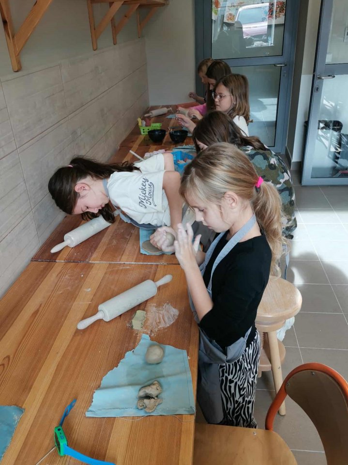 Podczas zajęć ceramicznych dzieci zapoznały się z wyposażeniem pracowni, narzędziami do ceramiki oraz zasadami pracy z gliną. Wykonywały swoje pierwsze w tym roku prace, tworząc figurki zwierząt — kotki, pieski, osiołki, motylki — a także miseczki i kubeczki. Dorośli uczestnicy poznali podstawowe techniki formowania ręcznego. Odbijali na glinie gałązki, liście, kwiaty i inne rośliny, ozdabiając w ten sposób własnoręcznie wykonane mydelniczki.