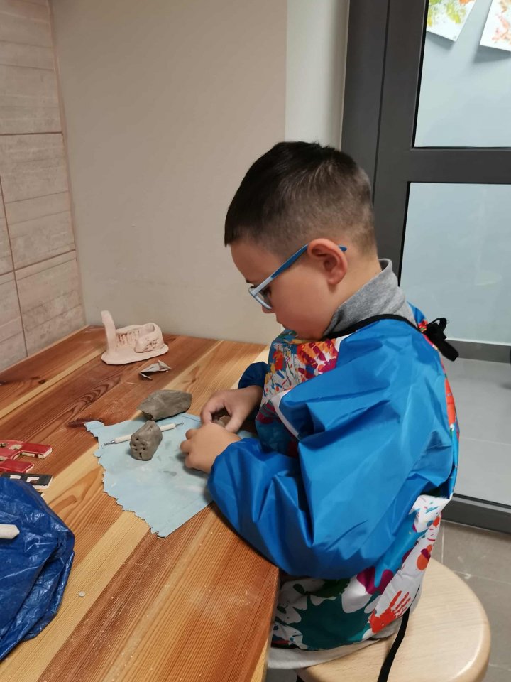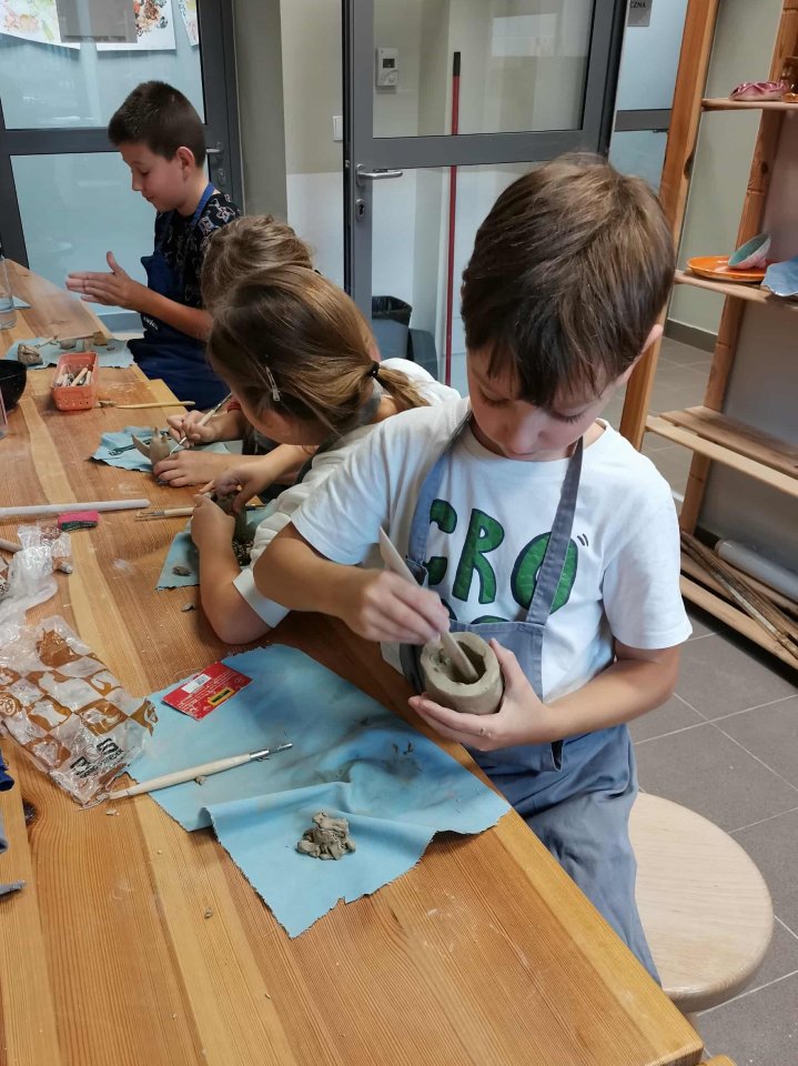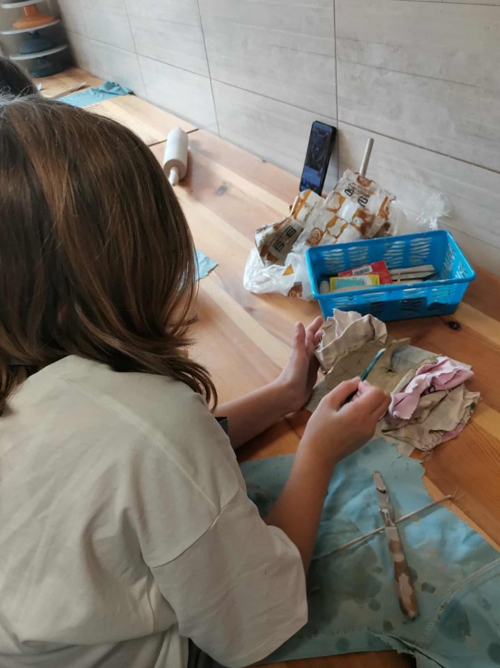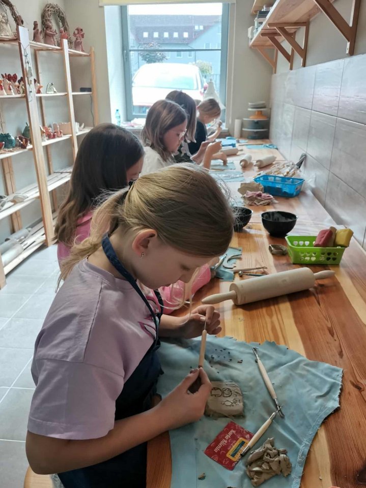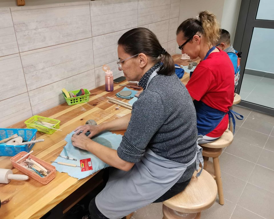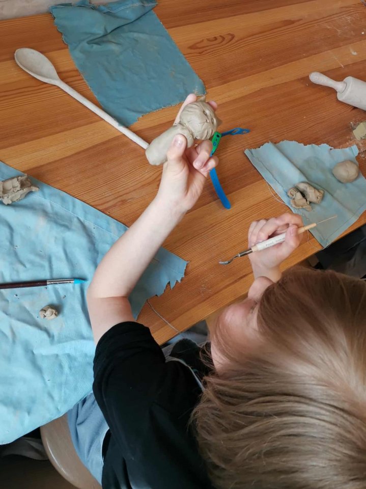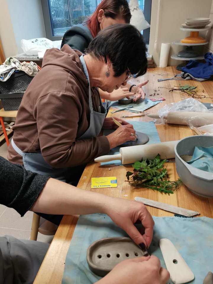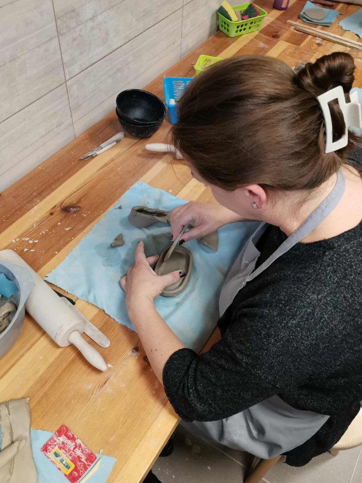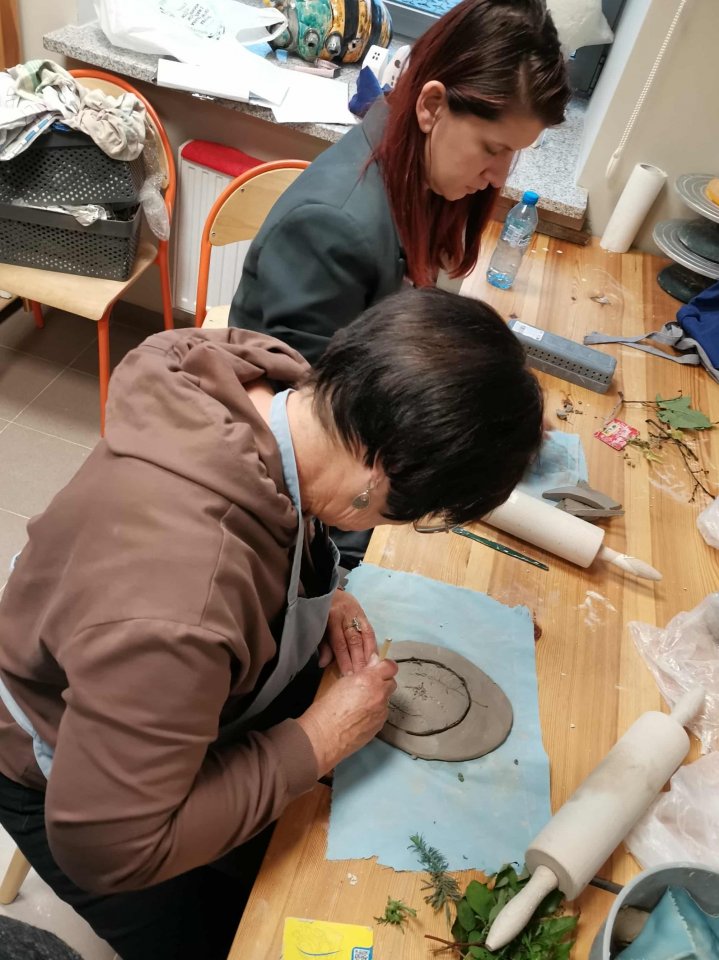Podczas zajęć ceramicznych dzieci zapoznały się z wyposażeniem pracowni, narzędziami do ceramiki oraz zasadami pracy z gliną. Wykonywały swoje pierwsze w tym roku prace, tworząc figurki zwierząt — kotki, pieski, osiołki, motylki — a także miseczki i kubeczki. Dorośli uczestnicy poznali podstawowe techniki formowania ręcznego. Odbijali na glinie gałązki, liście, kwiaty i inne rośliny, ozdabiając w ten sposób własnoręcznie wykonane mydelniczki.