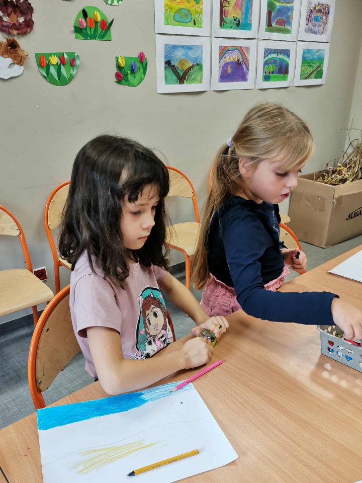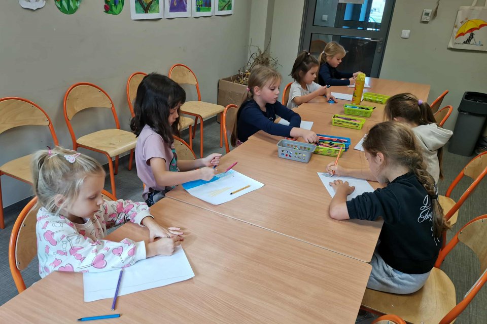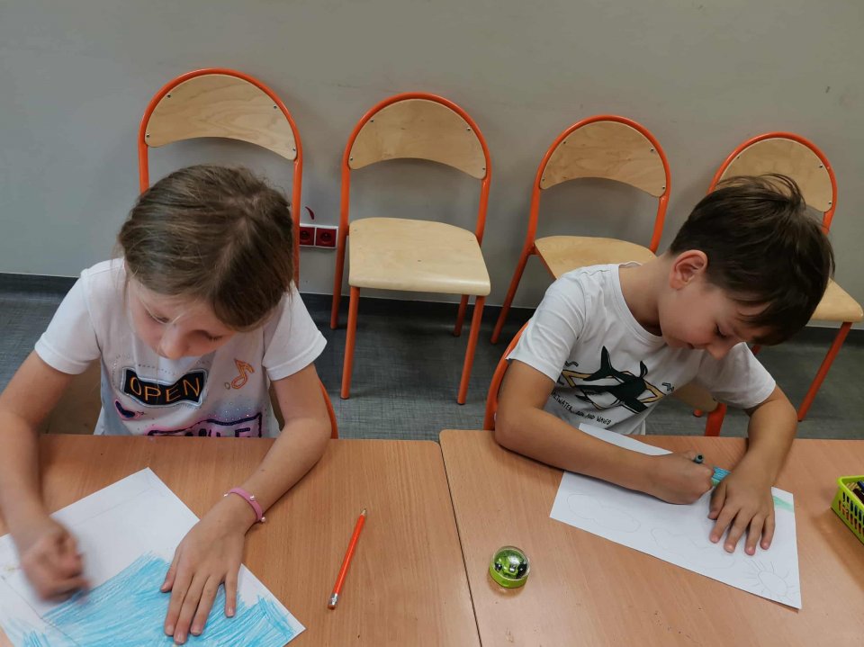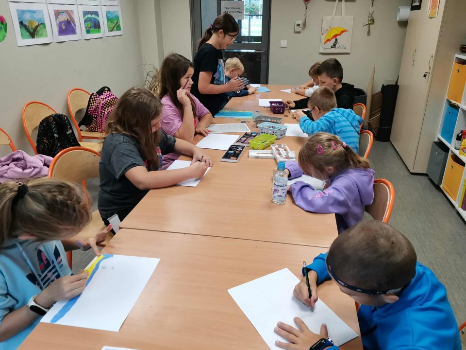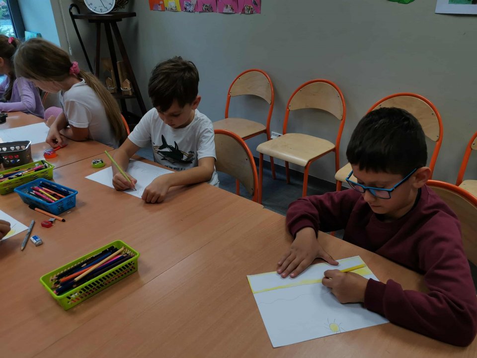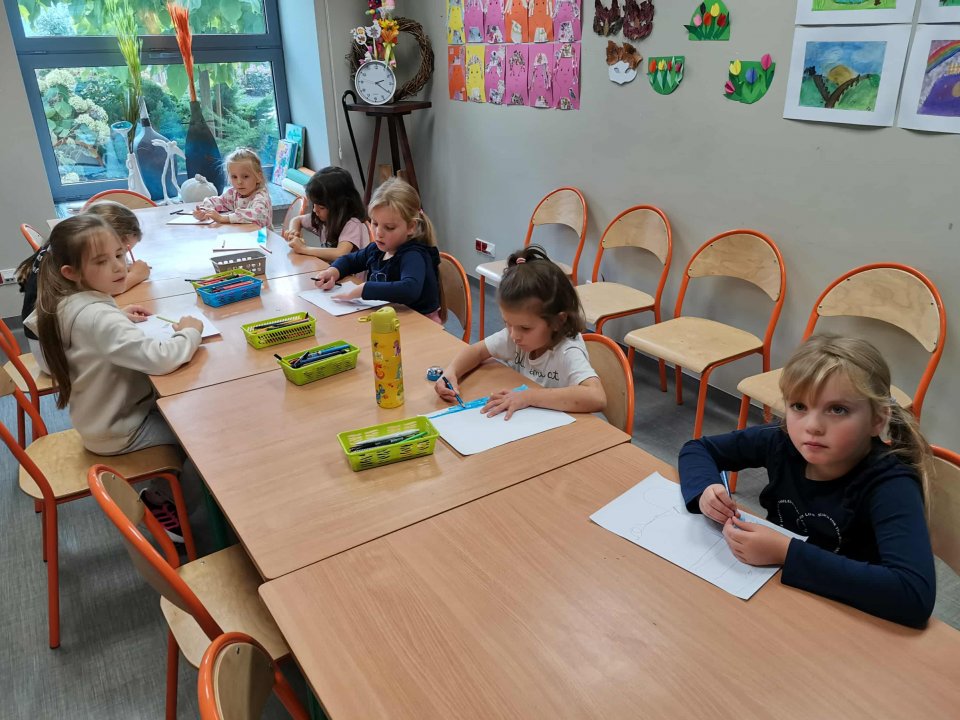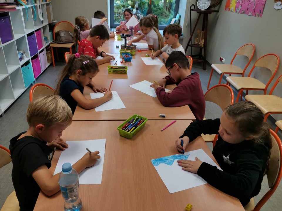 Na zajęciach plastycznych dzieci wspominały wakacje, wykonując prace na temat: „Najwspanialsze wydarzenie z wakacji”. Używały ołówków, kredek oraz suchych pasteli, tworząc barwne i pełne radości rysunki, które przypomniały letnie przygody.