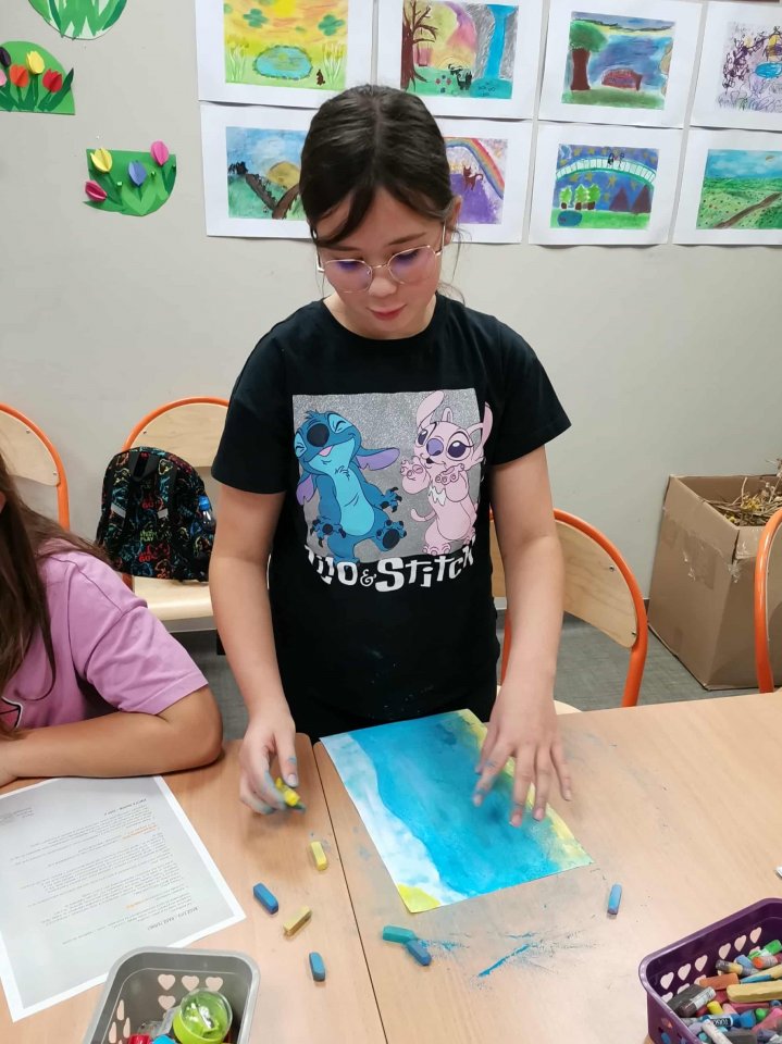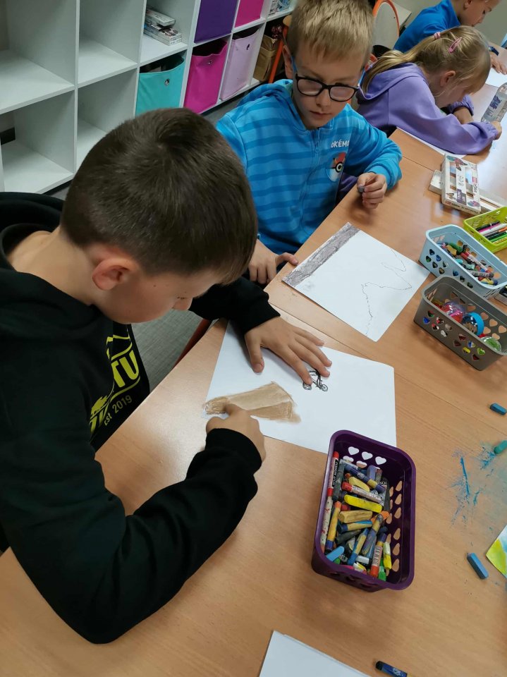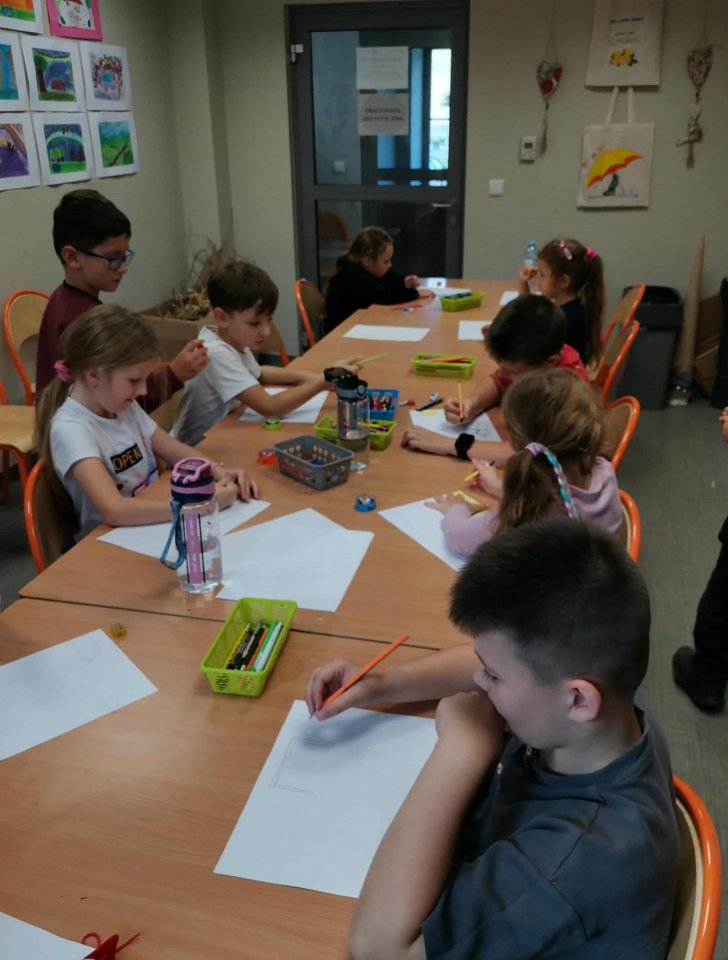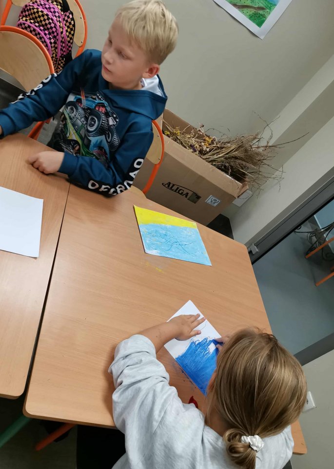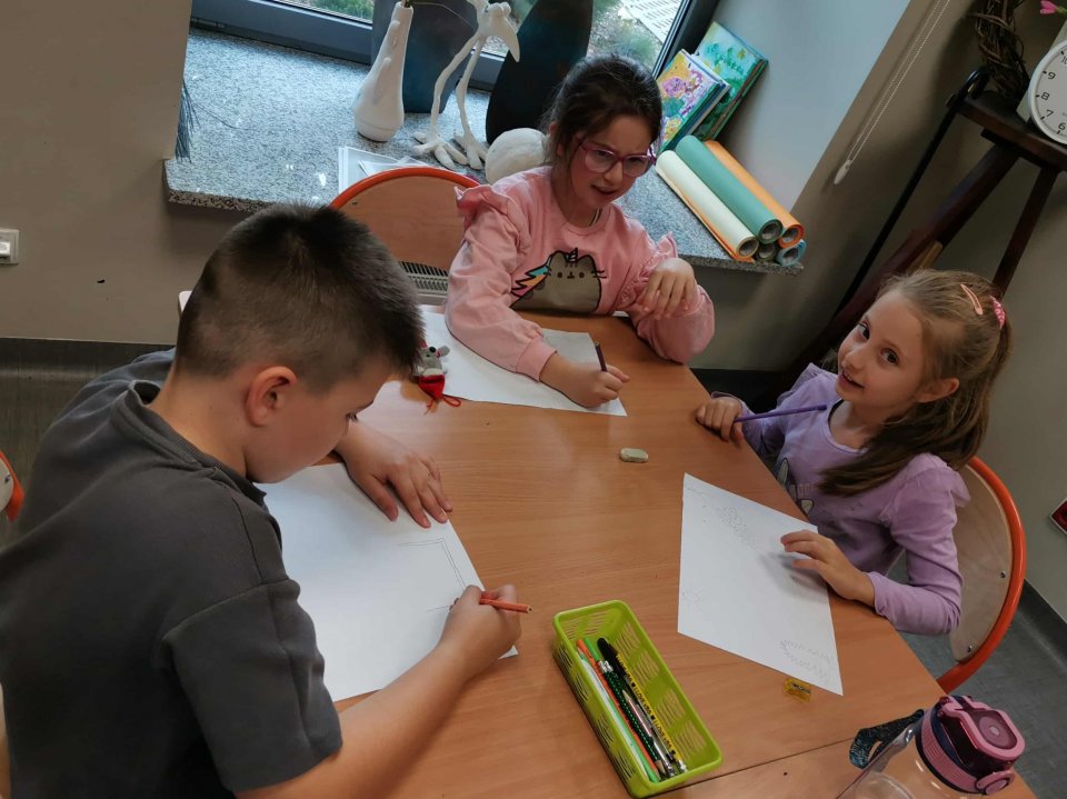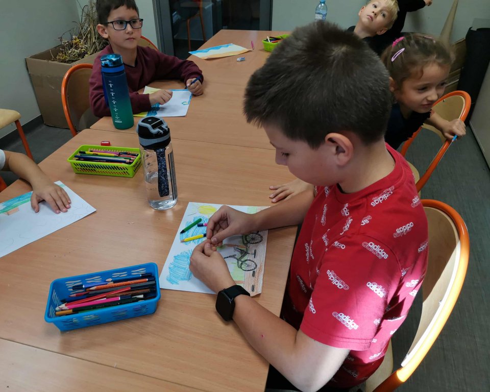 Na zajęciach plastycznych dzieci wspominały wakacje, wykonując prace na temat: „Najwspanialsze wydarzenie z wakacji”. Używały ołówków, kredek oraz suchych pasteli, tworząc barwne i pełne radości rysunki, które przypomniały letnie przygody.