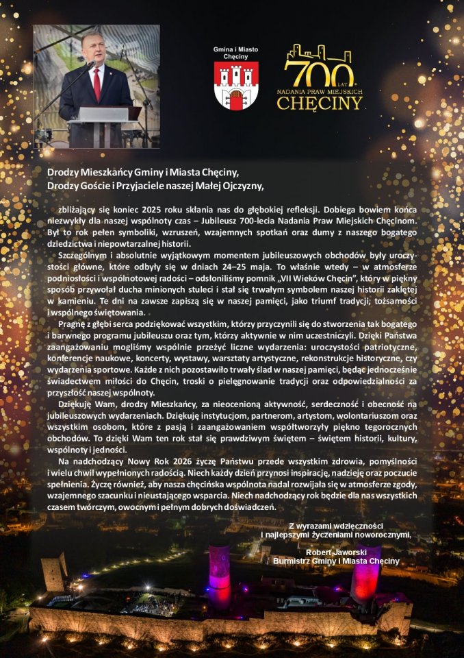 Podsumowanie roku jubileuszowego 700-lecia Nadania Praw Miejskich Chęcinom oraz życzenia noworoczne od burmistrza Gminy i Miasta Chęciny, Roberta Jaworskiego