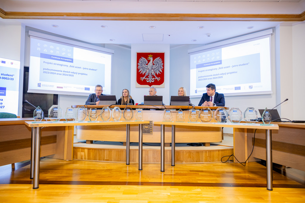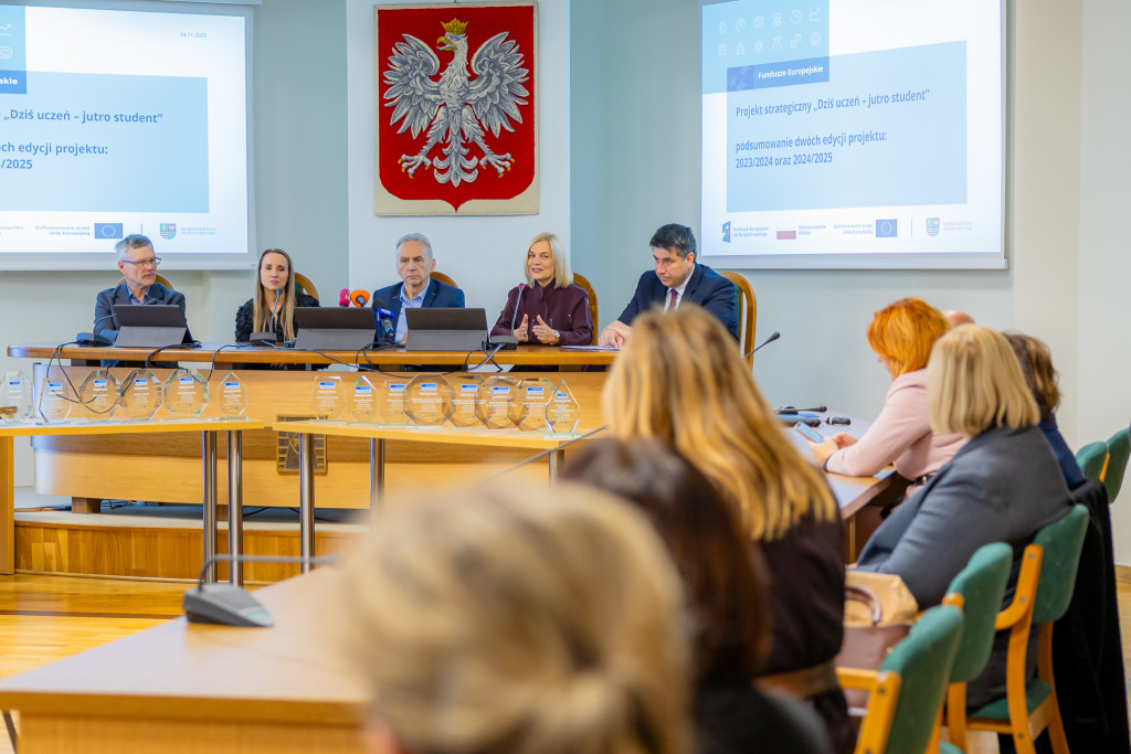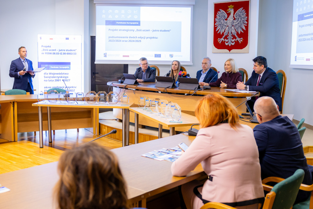 W siedzibie Politechniki Świętokrzyskiej podsumowano dziś efekty realizowanego od 2 lat projektu edukacyjnego “Dziś uczeń – jutro student”, kierowanego do młodzieży szkół ponadpodstawowych z terenu województwa świętokrzyskiego. W spotkaniu uczestniczyła marszałek województwa Renata Janik, przedstawiciele 2 świętokrzyskich państwowych uczelni wyższych: Uniwersytetu Jana Kochanowskiego i Politechniki Świętokrzyskiej oraz starostowie powiatów i dyrektorzy szkół, uczestniczących w projekcie.