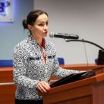 Pani Dyrektor przywitała zgromadzonych na Sali, dziękowała policjantom oraz ich rodzinom. Zwracając się do ślubujących, gratulowała i życzyła szczęścia. „Przed Wami trudna i niebezpieczna droga.” – mówiła Pani Dyrektor. „Pomagajcie i chrońcie!” – dodawała.