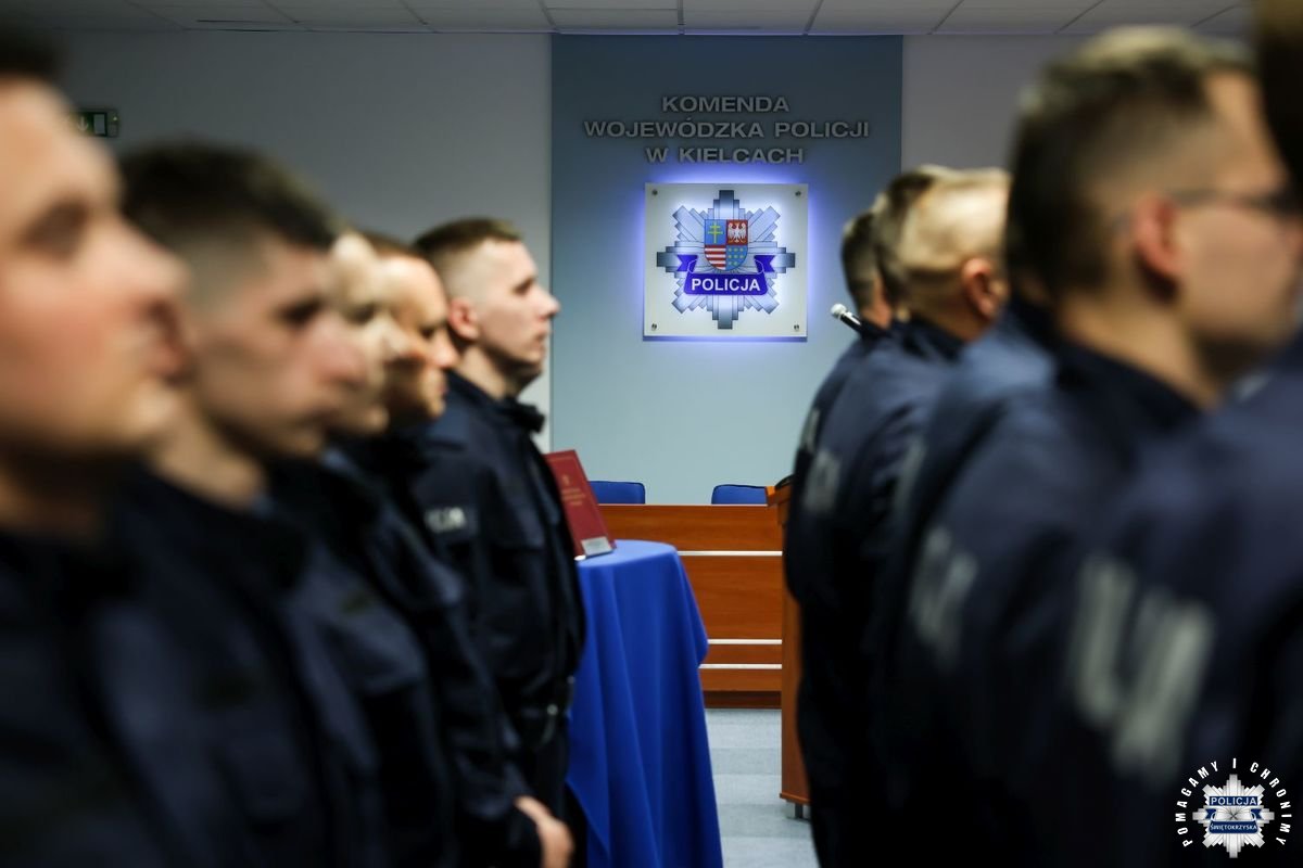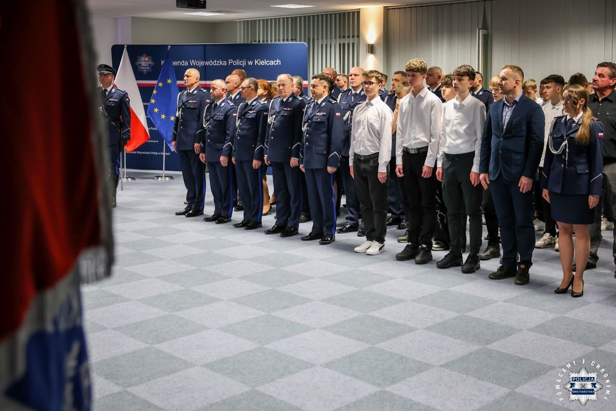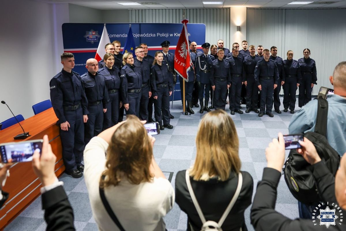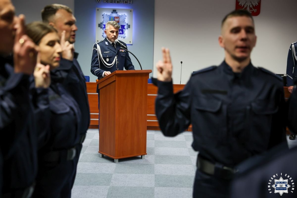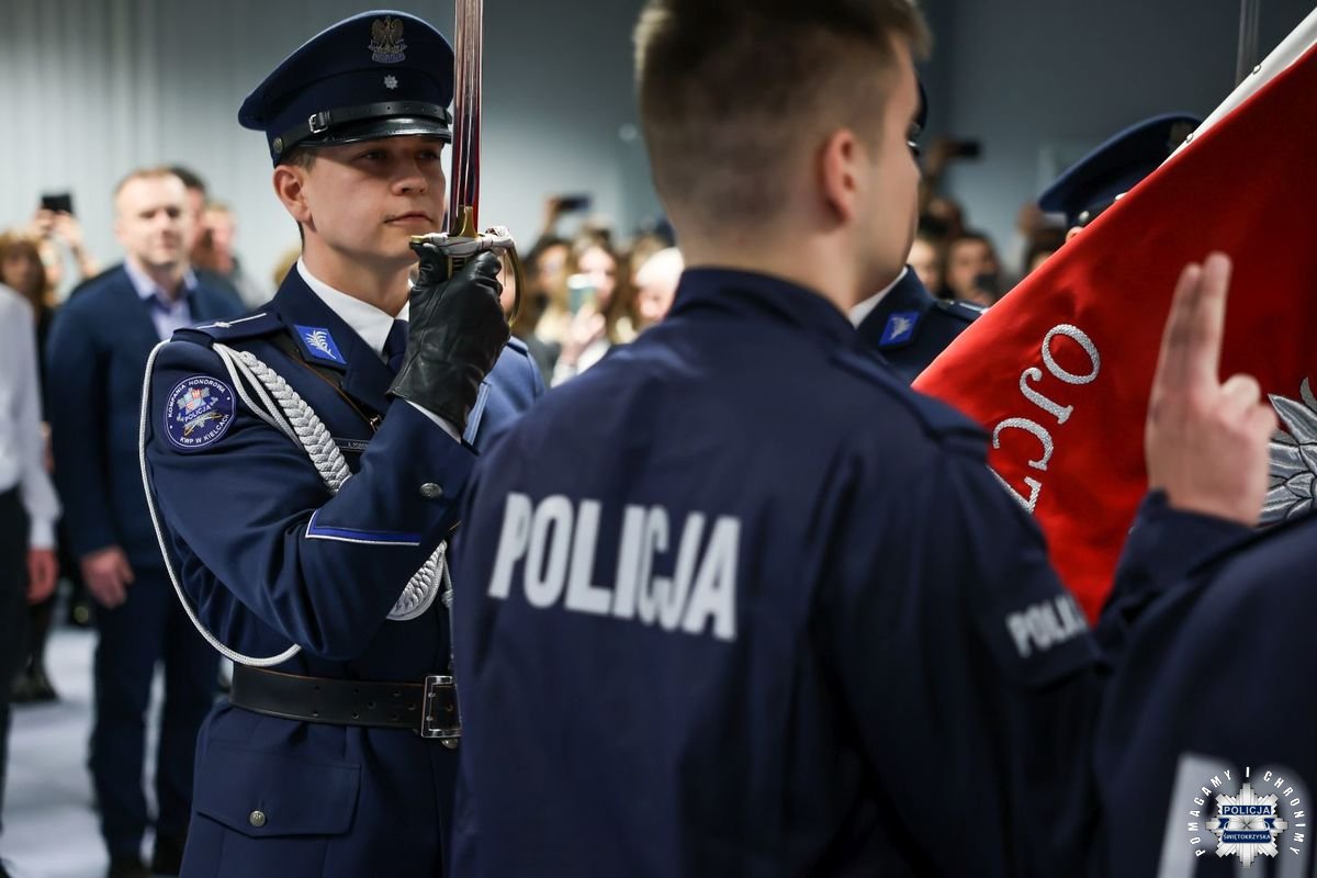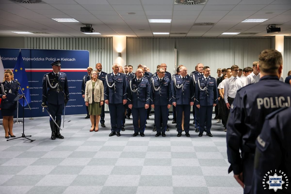 Uczestnicy wydarzenia zebrali się w Sali Narad im. mjr. Jana Piwnika „Ponurego”, to właśnie tu odbyła się uroczystość ślubowania nowo przyjętych policjantów. Jak zawsze atmosfera była podniosła. Kiedy na salę przybył Komendant Wojewódzki Policji w Kielcach insp. Zbigniew Nowak w asyście Zastępcy insp. Marcina Chatysa, dowódca uroczystości złożył stosowny meldunek rozpoczynając tym samym wydarzenie. A w nim uczestniczyła Pani Edyta Bucka – Dyrektor Wydziału Prawnego, Nadzoru i Kontroli Świętokrzyskiego Urzędu Wojewódzkiego w Kielcach, komendanci powiatowi i miejski, dowódcy i naczelnicy poszczególnych wydziałów, policjanci, a także zaproszone rodziny i bliscy nowo przyjętych funkcjonariuszy. Obecni byli także uczniowie oddziału o profilu mundurowym z Technikum w Zespole Szkół im. Stanisława Staszica w Staszowie z opiekunem podpułkownikiem rezerwy Damianem Potyrało.