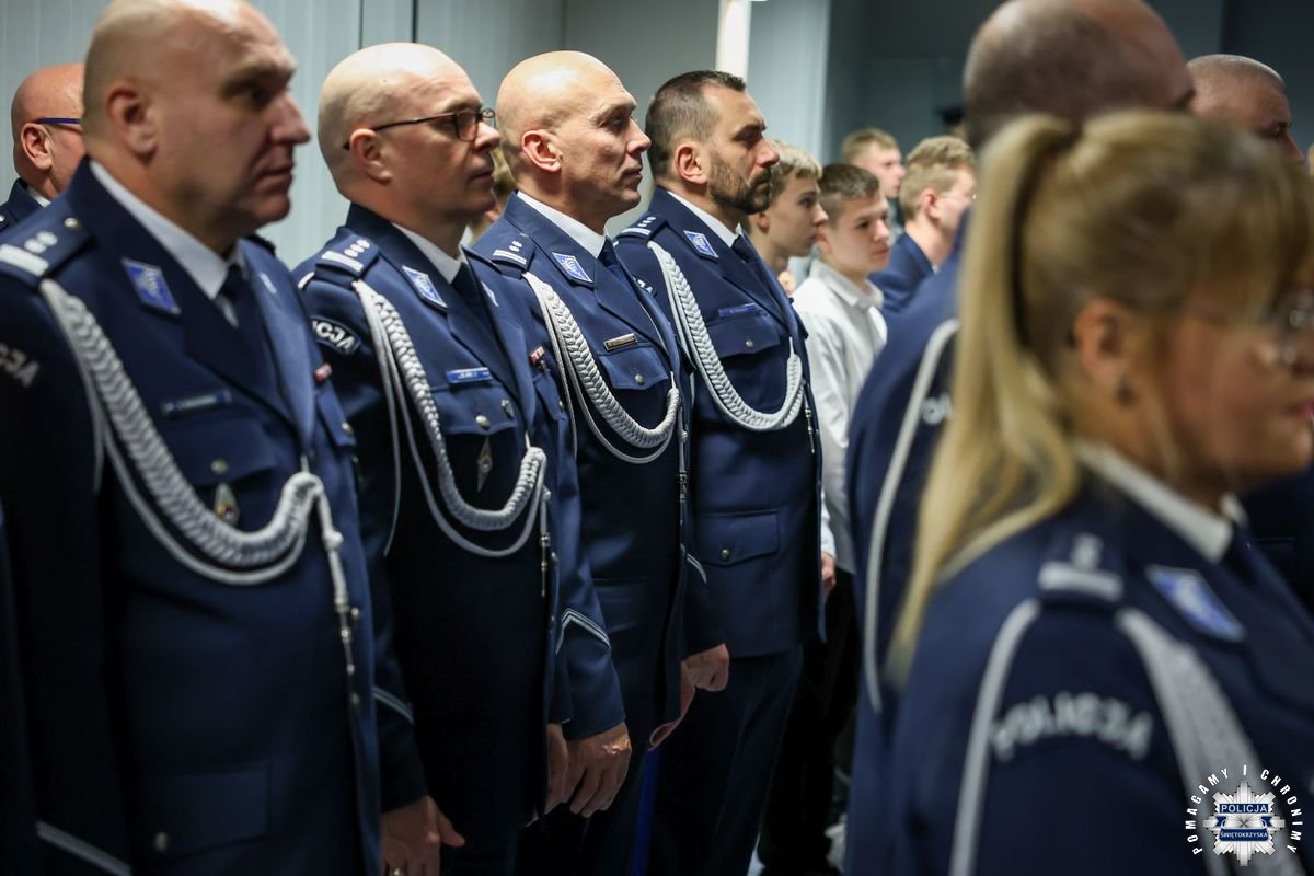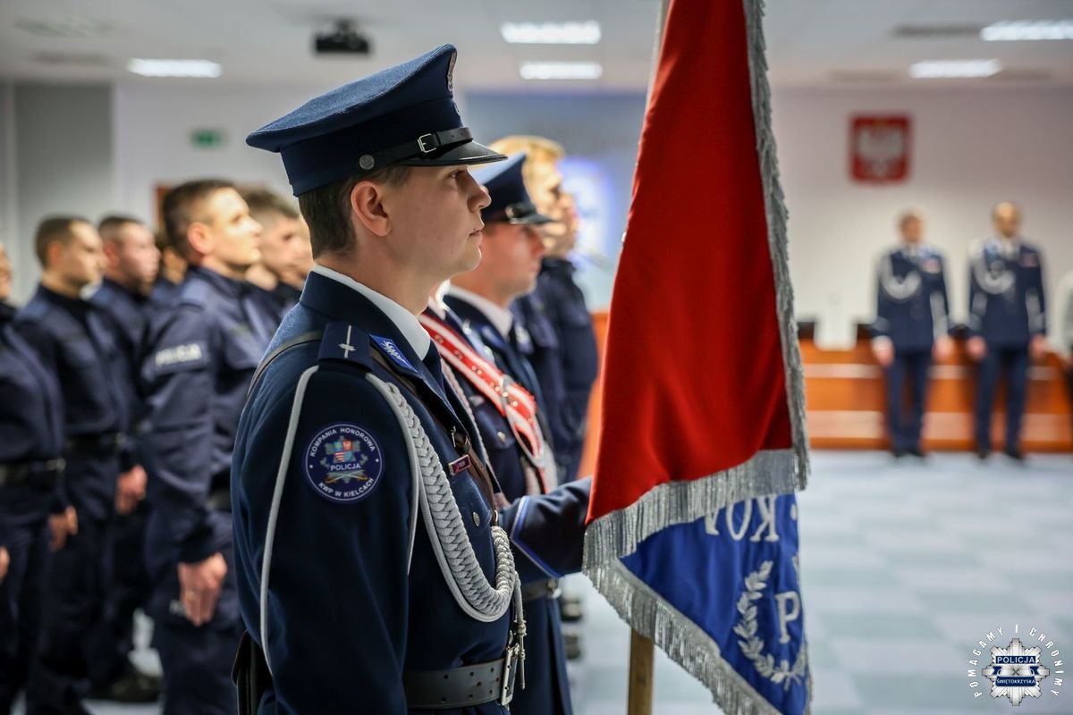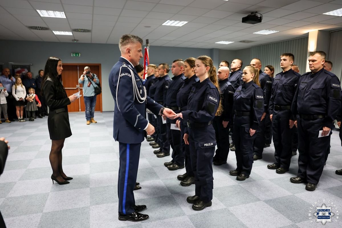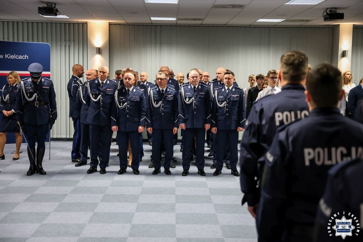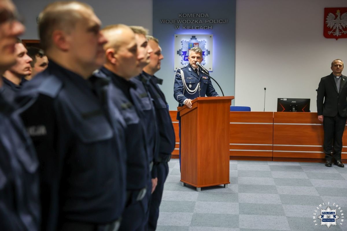 Uczestnicy wydarzenia zebrali się w Sali Narad im. mjr. Jana Piwnika „Ponurego”, to właśnie tu odbyła się uroczystość ślubowania nowo przyjętych policjantów. Jak zawsze atmosfera była podniosła. Kiedy na salę przybył Komendant Wojewódzki Policji w Kielcach insp. Zbigniew Nowak w asyście Zastępcy insp. Marcina Chatysa, dowódca uroczystości złożył stosowny meldunek rozpoczynając tym samym wydarzenie. A w nim uczestniczyła Pani Edyta Bucka – Dyrektor Wydziału Prawnego, Nadzoru i Kontroli Świętokrzyskiego Urzędu Wojewódzkiego w Kielcach, komendanci powiatowi i miejski, dowódcy i naczelnicy poszczególnych wydziałów, policjanci, a także zaproszone rodziny i bliscy nowo przyjętych funkcjonariuszy. Obecni byli także uczniowie oddziału o profilu mundurowym z Technikum w Zespole Szkół im. Stanisława Staszica w Staszowie z opiekunem podpułkownikiem rezerwy Damianem Potyrało.