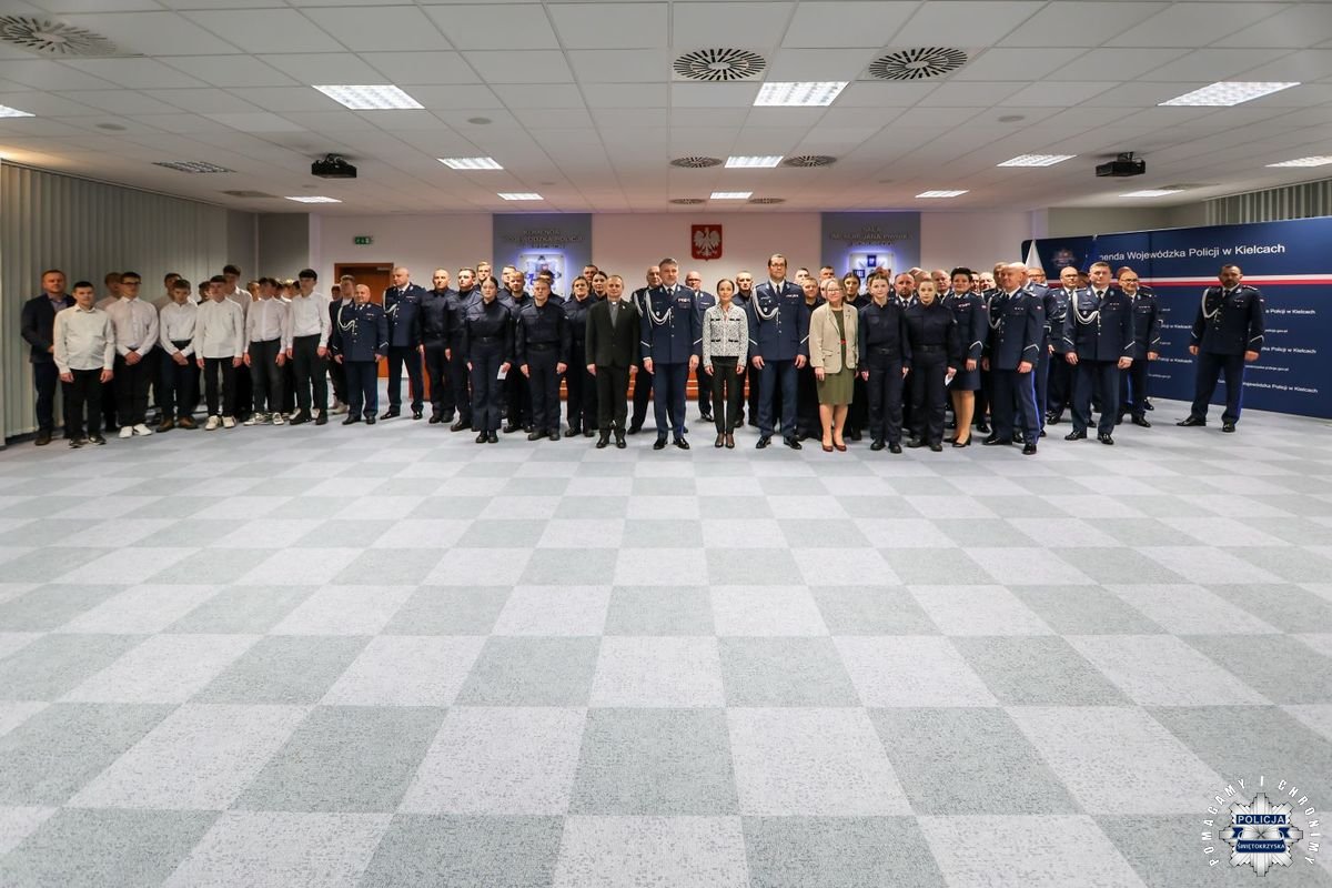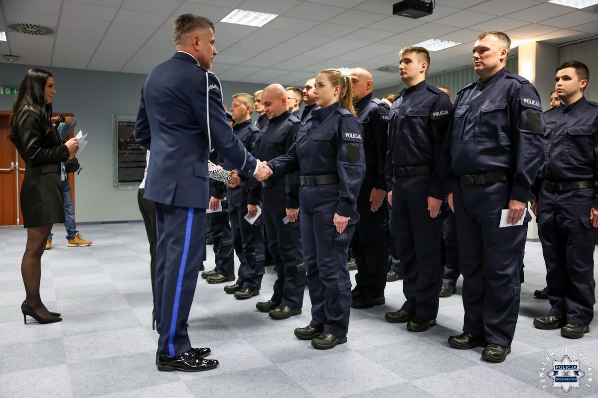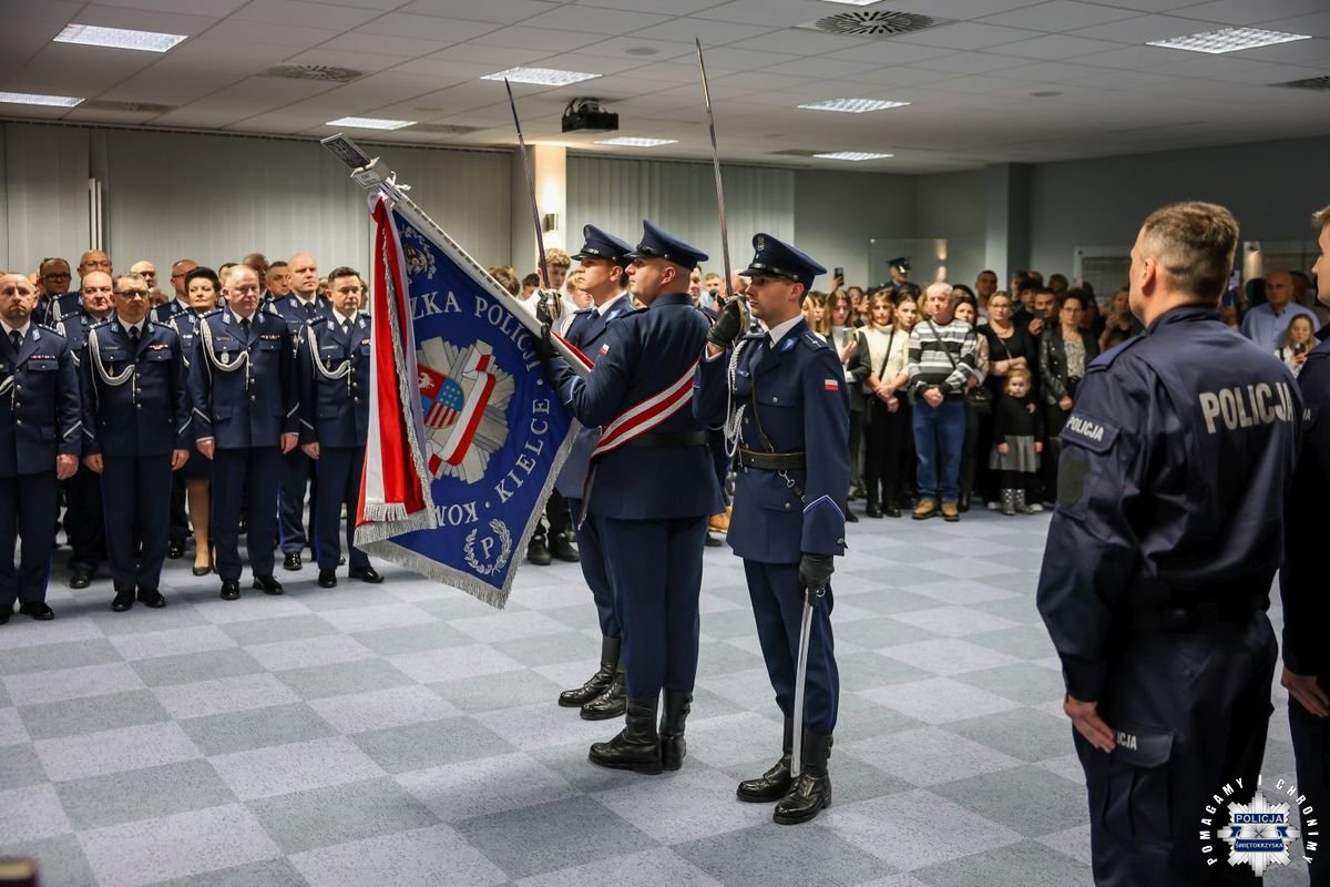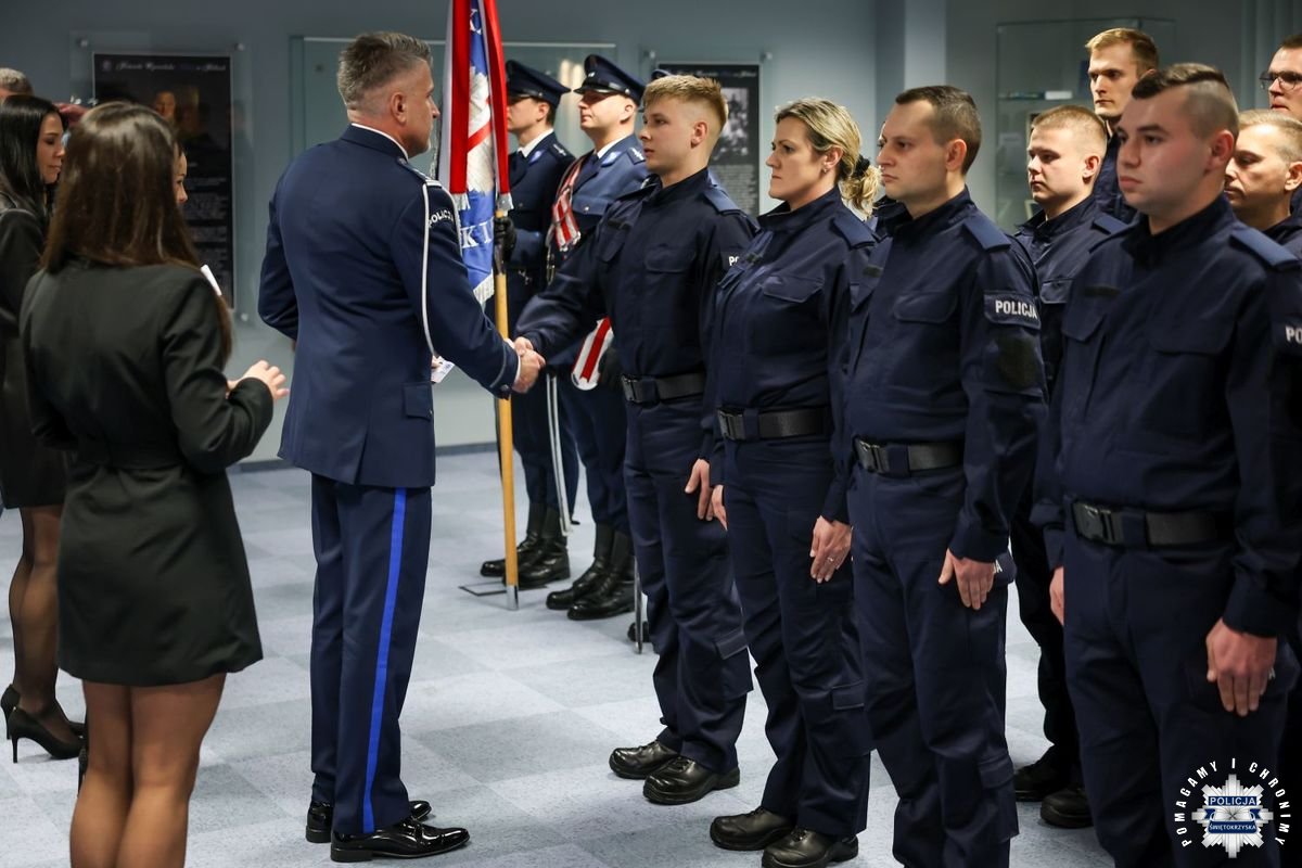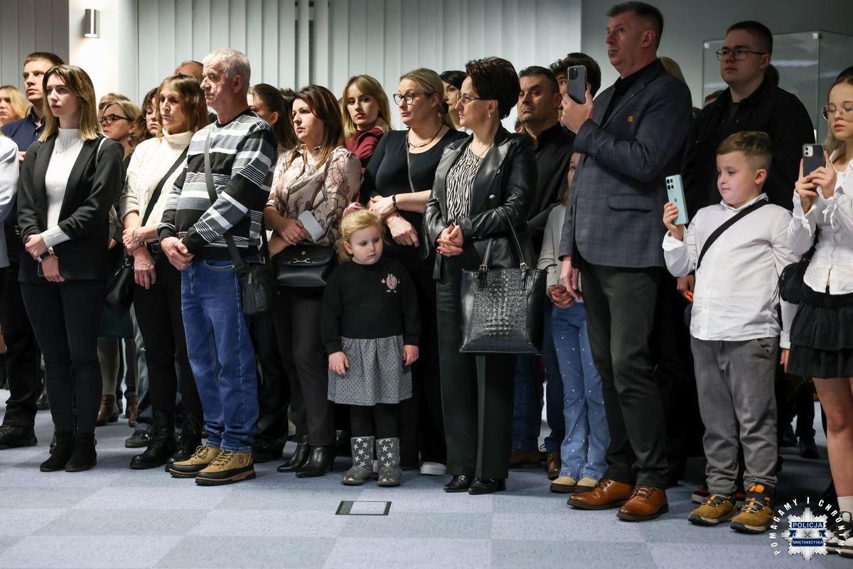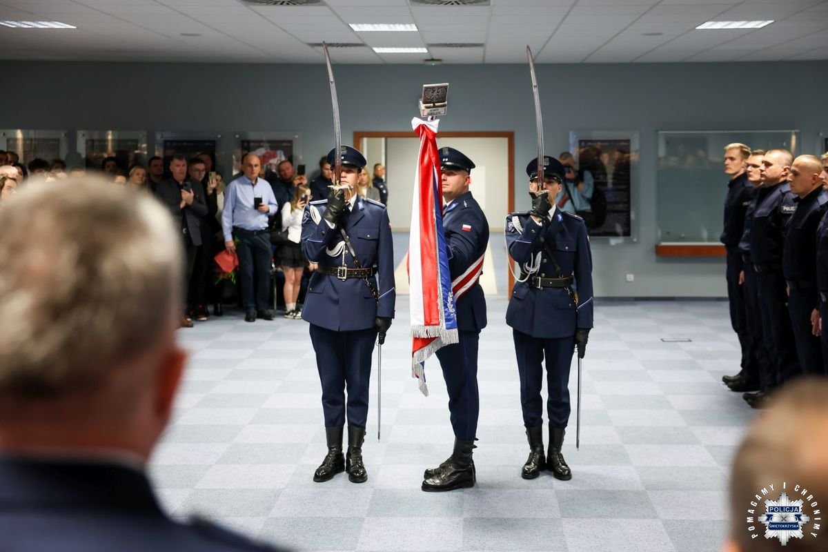 Uczestnicy wydarzenia zebrali się w Sali Narad im. mjr. Jana Piwnika „Ponurego”, to właśnie tu odbyła się uroczystość ślubowania nowo przyjętych policjantów. Jak zawsze atmosfera była podniosła. Kiedy na salę przybył Komendant Wojewódzki Policji w Kielcach insp. Zbigniew Nowak w asyście Zastępcy insp. Marcina Chatysa, dowódca uroczystości złożył stosowny meldunek rozpoczynając tym samym wydarzenie. A w nim uczestniczyła Pani Edyta Bucka – Dyrektor Wydziału Prawnego, Nadzoru i Kontroli Świętokrzyskiego Urzędu Wojewódzkiego w Kielcach, komendanci powiatowi i miejski, dowódcy i naczelnicy poszczególnych wydziałów, policjanci, a także zaproszone rodziny i bliscy nowo przyjętych funkcjonariuszy. Obecni byli także uczniowie oddziału o profilu mundurowym z Technikum w Zespole Szkół im. Stanisława Staszica w Staszowie z opiekunem podpułkownikiem rezerwy Damianem Potyrało.